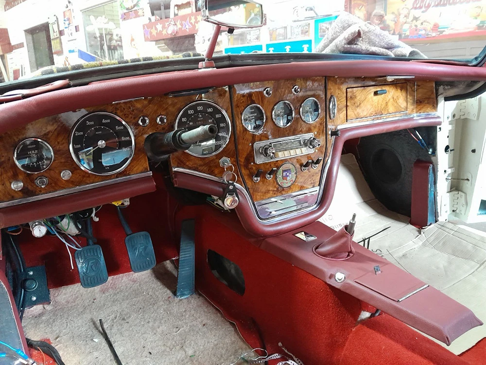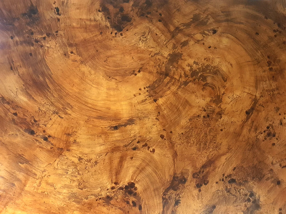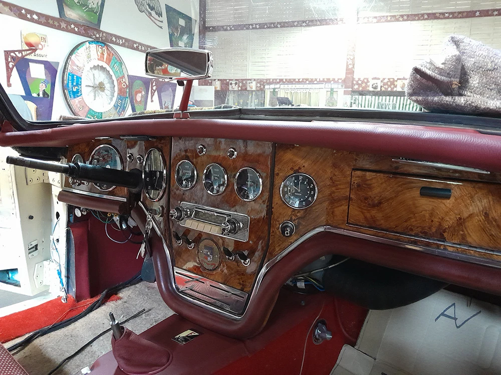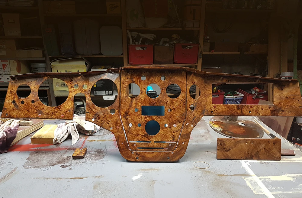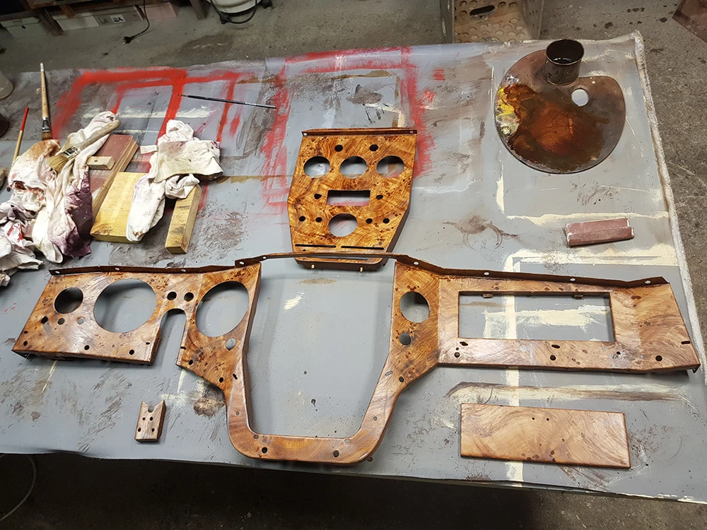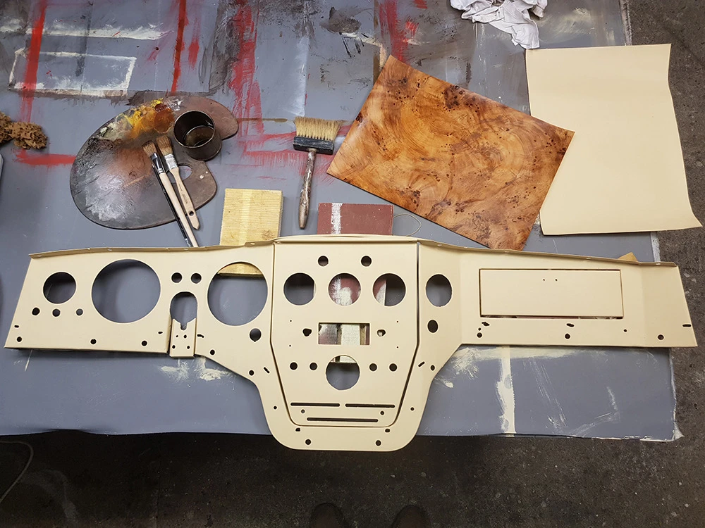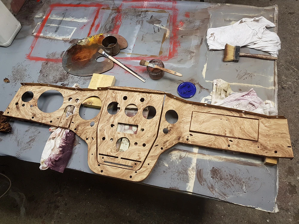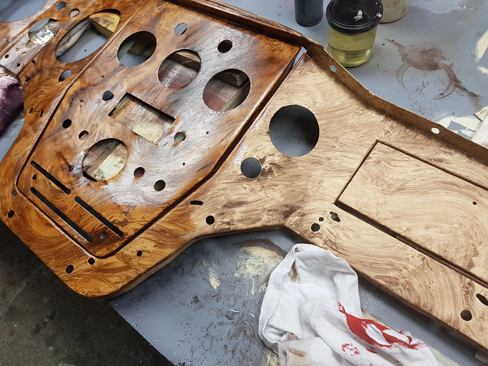 During the restoration of a Facel-Vega (1954-1964), I was asked to redo the fake wood as it was originally done in some luxury cars at that time. The brackets were made of thin sheet metal, stamped, hammered and drilled. For the finish, the imitation elm burl is based on the techniques of the time of the decorative painter, such as beer glazes with oil glazing.