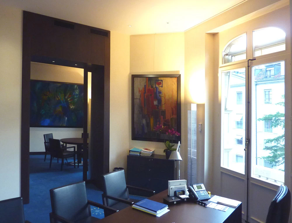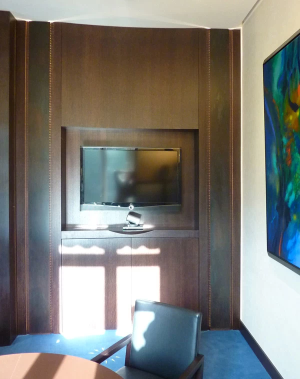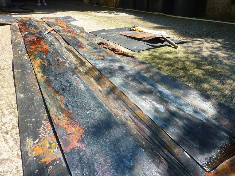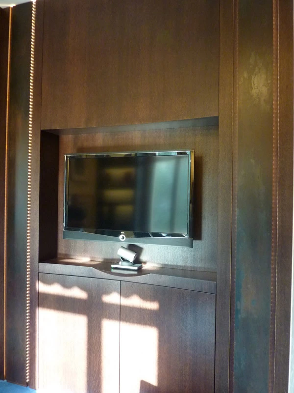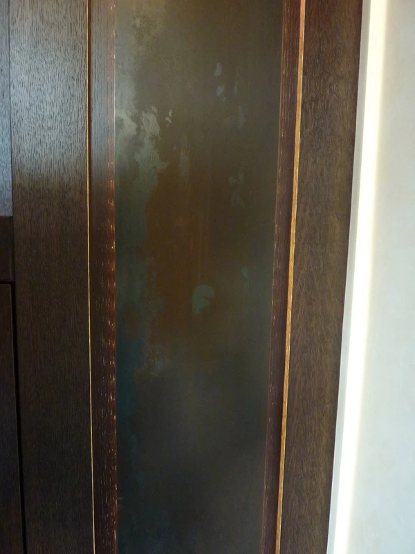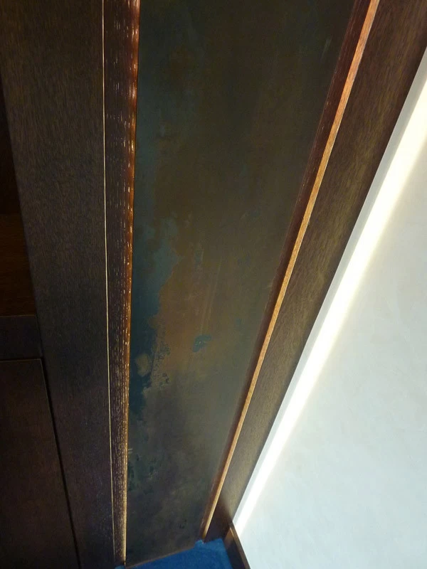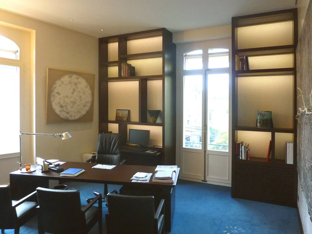The design of libraries, woodwork, radiator covers, videoconferencing, etc... was created by me. In the workshop, I treated the vertical steel plates on each side of the videoconference with several acids projected simultaneously in order to oxidize the steel violently in a few seconds and minutes. Once dry, the plates were scraped, sanded and varnished to reduce the power of the colours and to keep only a moderate alteration of the surfaces. In view of the dangerousness, this technique is reserved for very experienced professionals and requires appropriate protection.