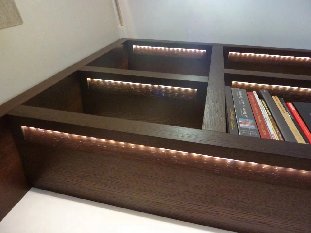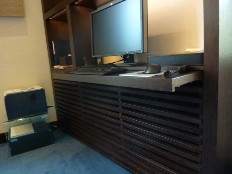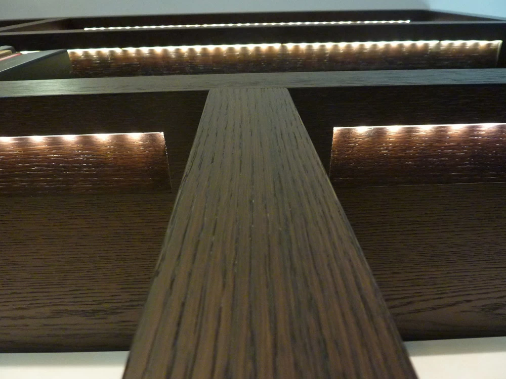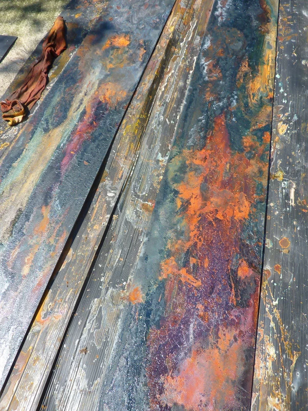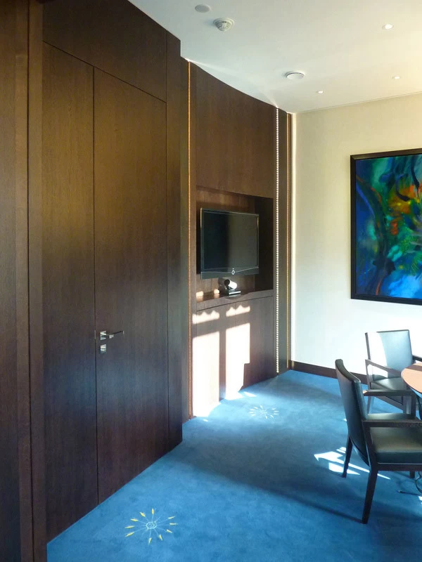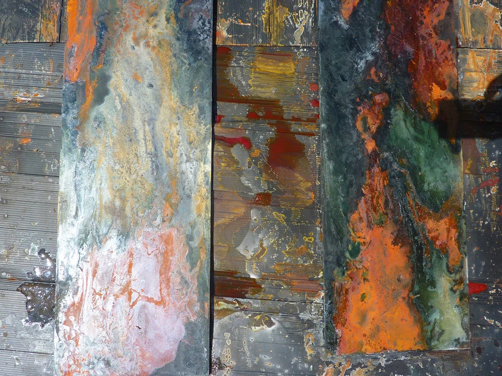 The design of libraries, woodwork, radiator covers, videoconferencing, etc... was created by me. In the workshop, I treated the vertical steel plates on each side of the videoconference with several acids projected simultaneously in order to oxidize the steel violently in a few seconds and minutes. Once dry, the plates were scraped, sanded and varnished to reduce the power of the colours and to keep only a moderate alteration of the surfaces. In view of the dangerousness, this technique is reserved for very experienced professionals and requires appropriate protection.