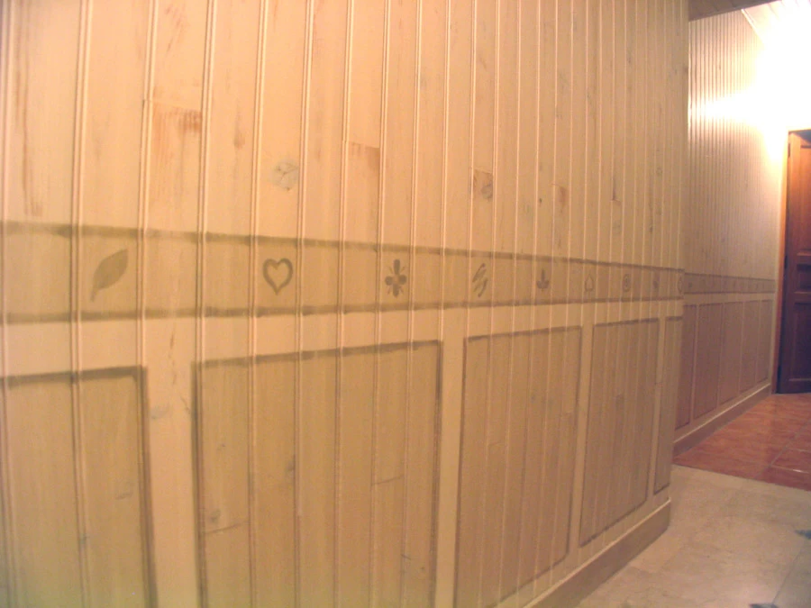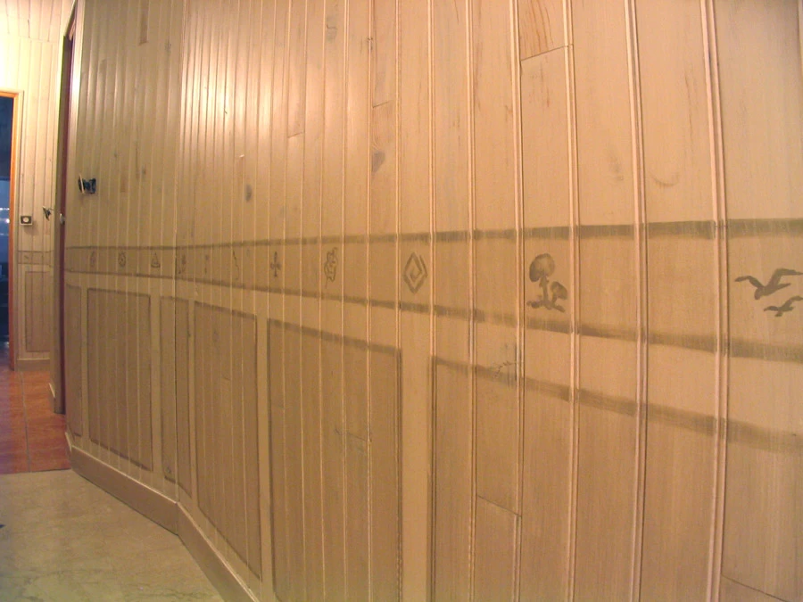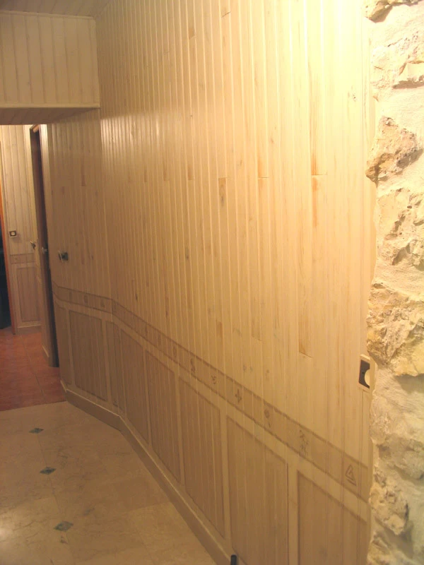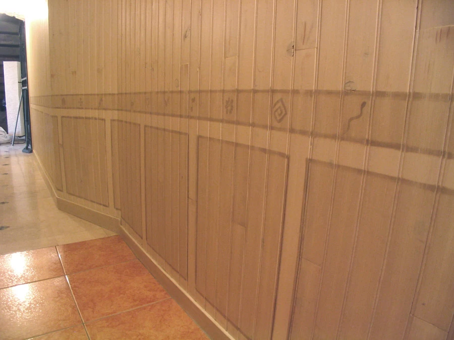 Removal of this old corridor in dark panelling, for a bleached and sanded wood. More sustained bases and a frieze invented on the spot to finally brighten up this corridor.