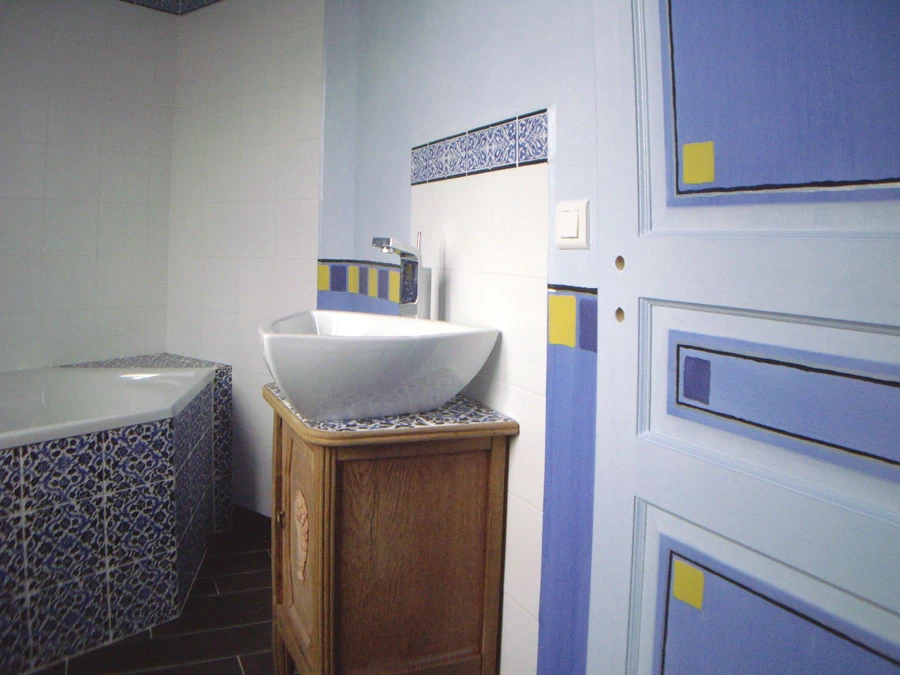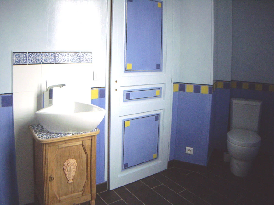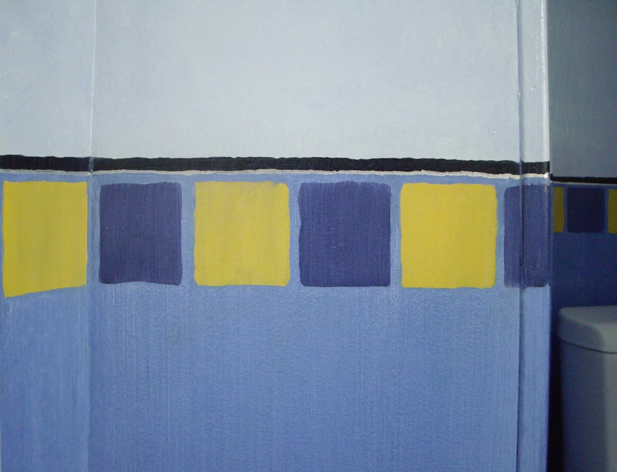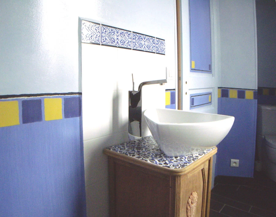 This bathroom had been painted in a plain blue that was not suitable. The idea was to whiten the top and create a base in a different and more intense blue. The whole treated in cold shade required to be enhanced by a warm shade, hence the idea of yellow squares as a frieze.