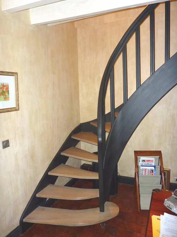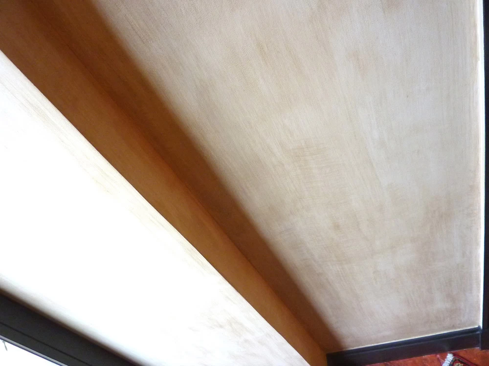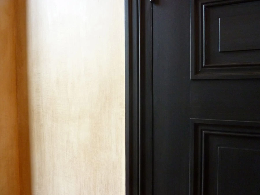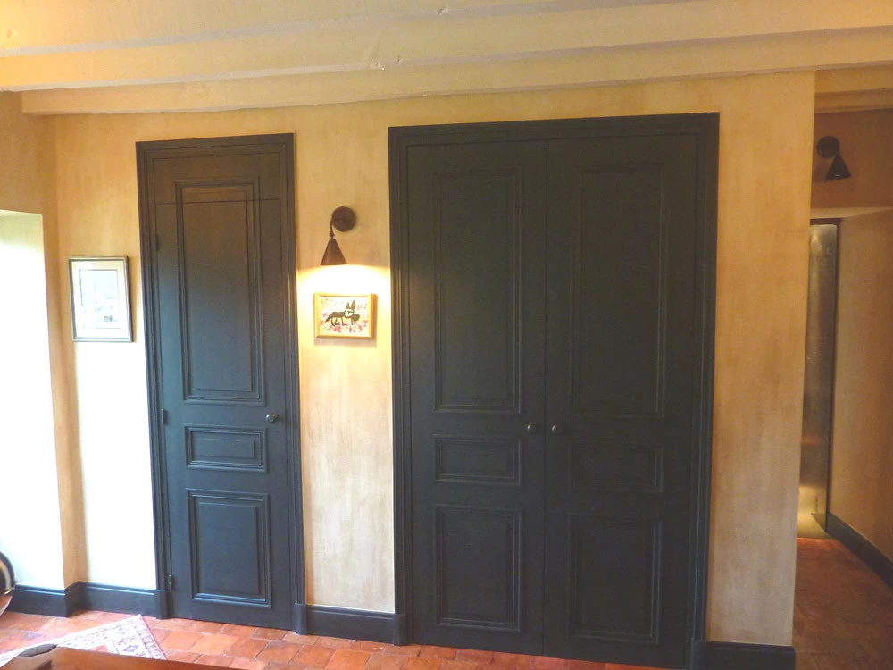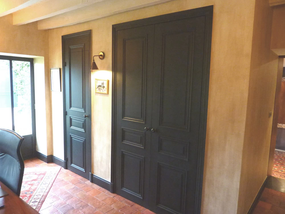Here are wood panelling with anthracite combed patinas that contrast strongly with the walls. This set gives a desired masculine side from the beginning. On the walls, oil patinas on water-based glue were vertically brushed and then soaked with a wet jex pad.