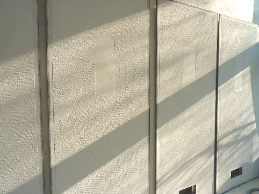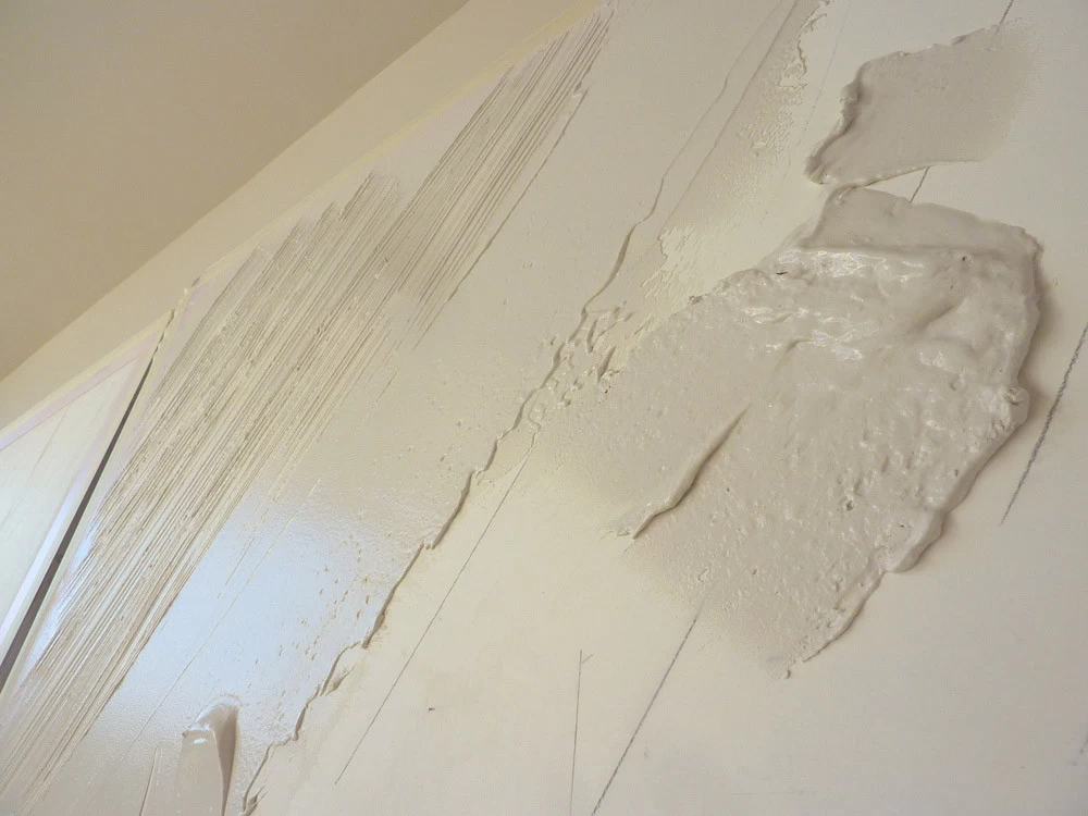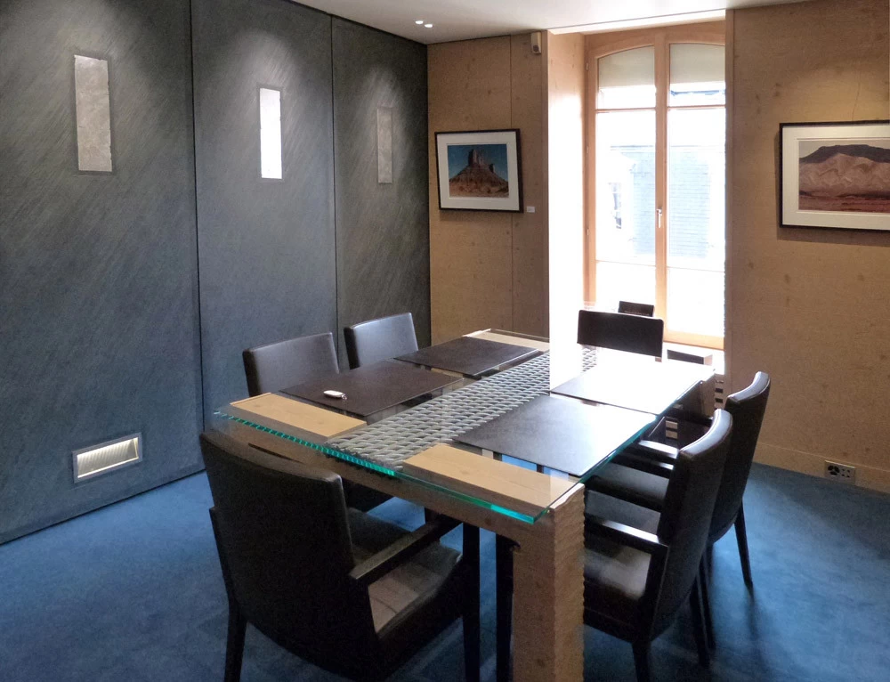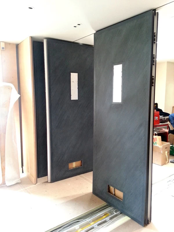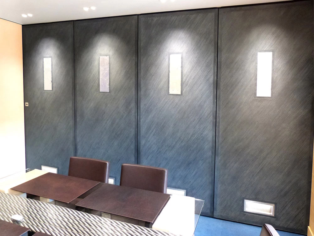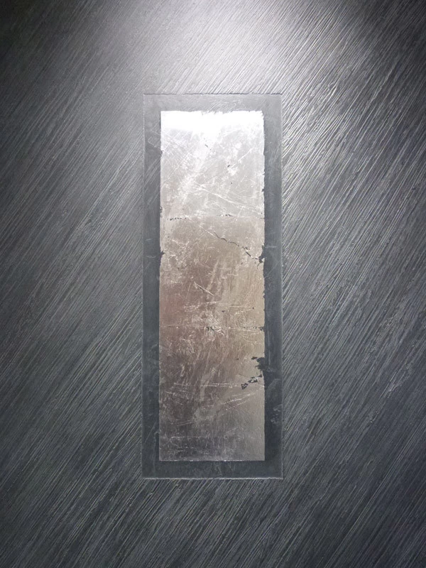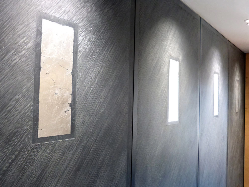 Imitation on a removable partition with a "slate" aspect and its metal sheets in the centre. All this refers to a restaurant called "le Club House" located at Mont d'Arbois above Megève (1000 people per day in season).