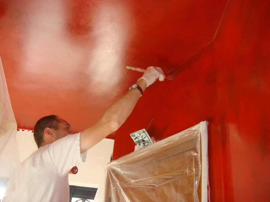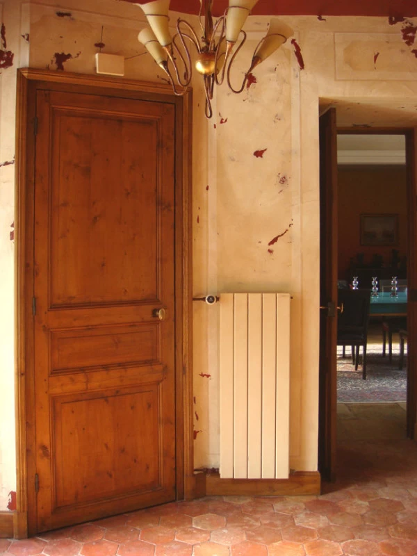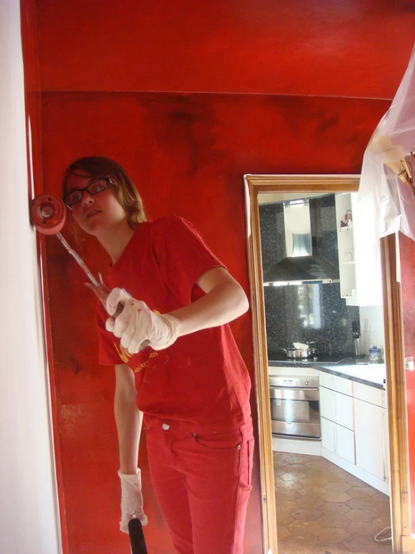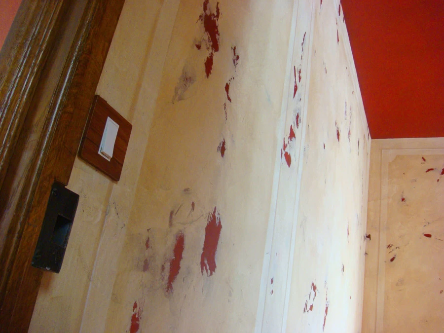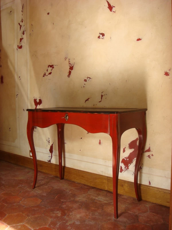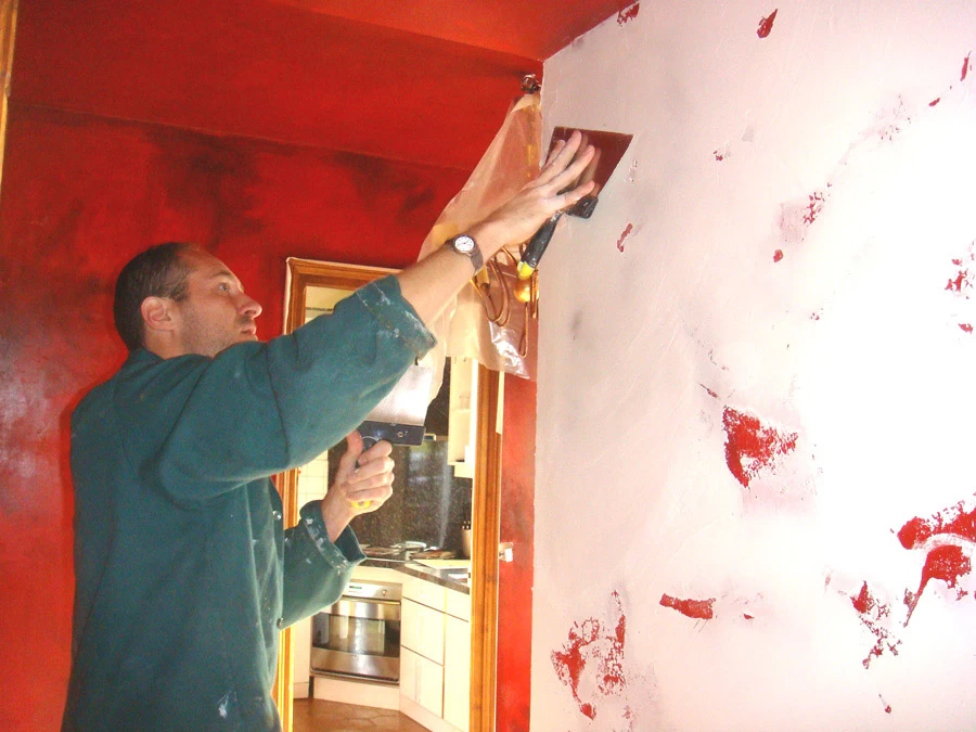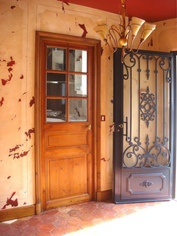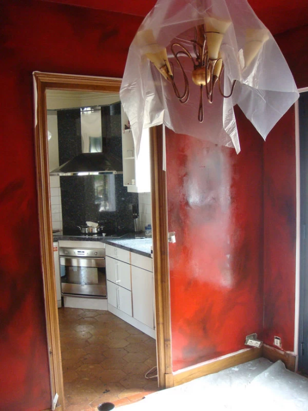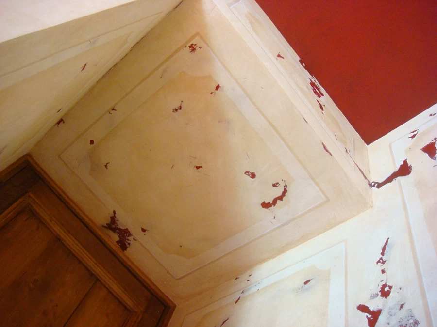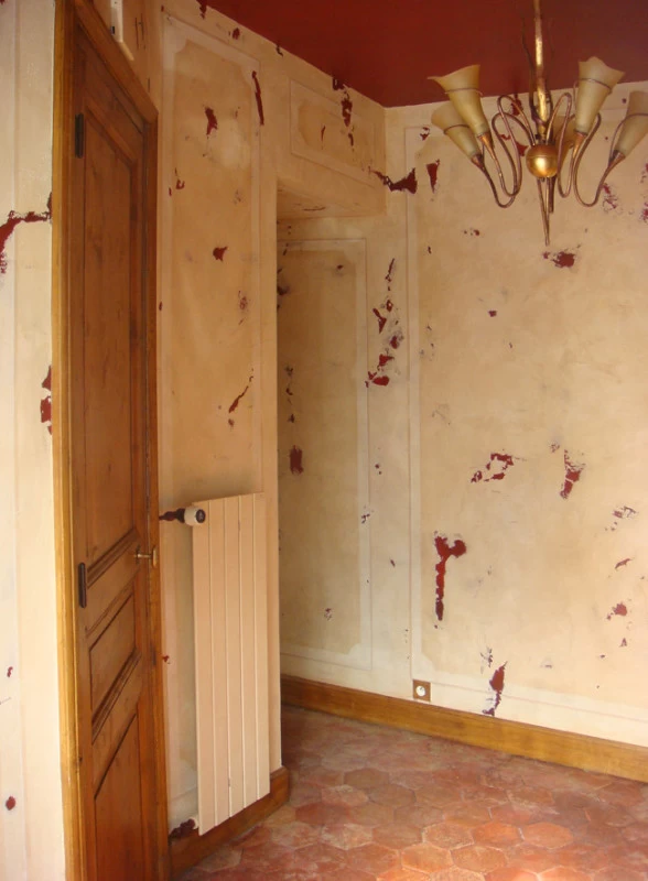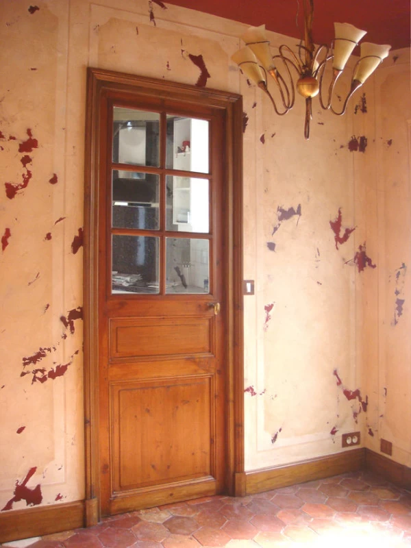 Here is for this small entrance, a patina of your stone and its whitewashed panels on waxed plasters. To carry out this technique in a "worn-out fresco" way, it was necessary to decorate the backgrounds with vermilion red and some black fades. The plaster plasters were then applied. The ceiling, on the other hand, received an oiled patina of shade earth on a red background and then simply varnished. The switches already in place have been treated like fake wood.