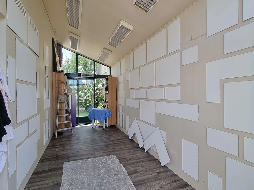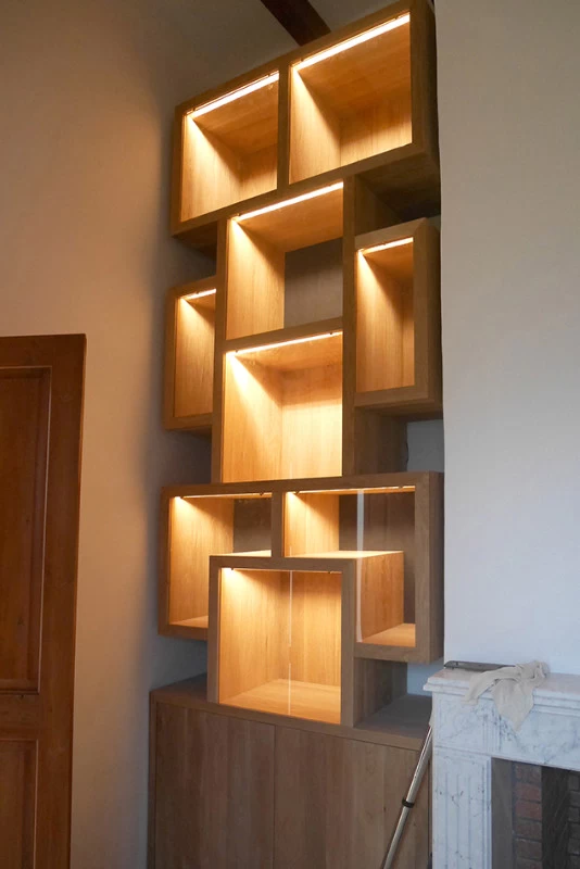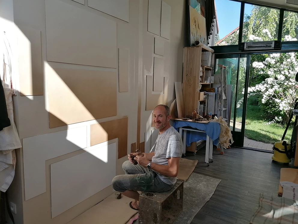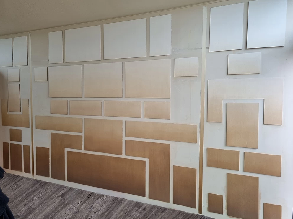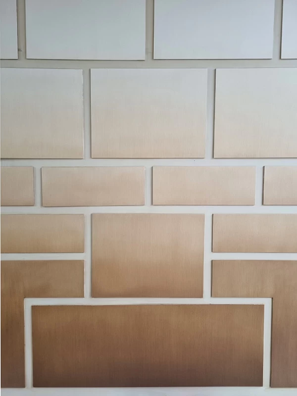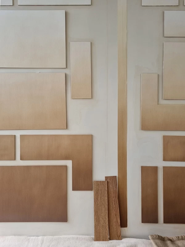 Here are some gradations in a wood tone spirit on panels to feed the background of the showcases. This technique cannot be done on site. Too complicated.