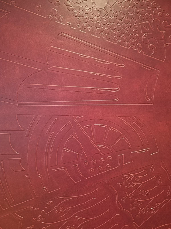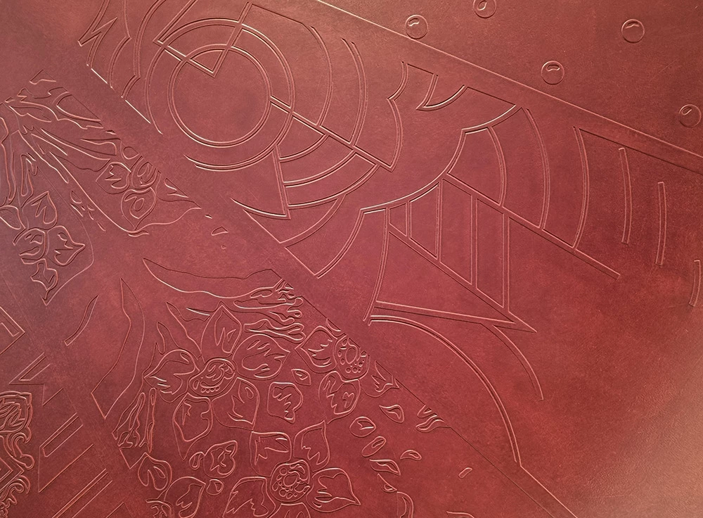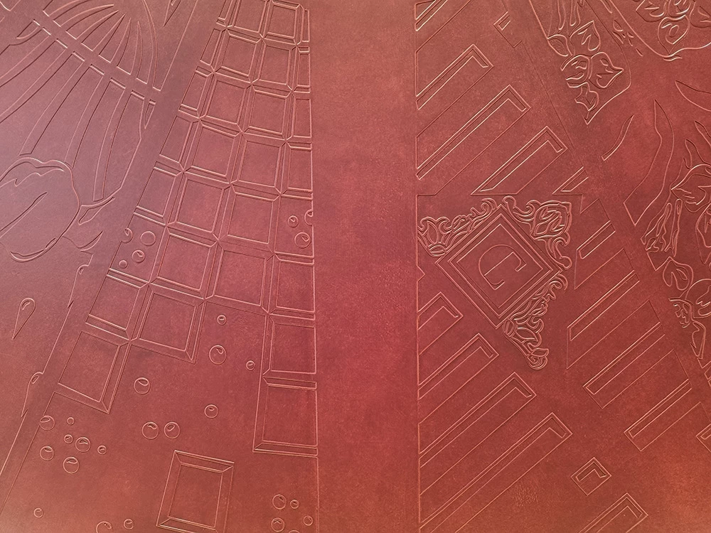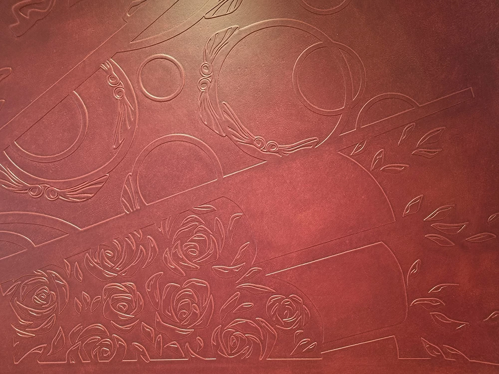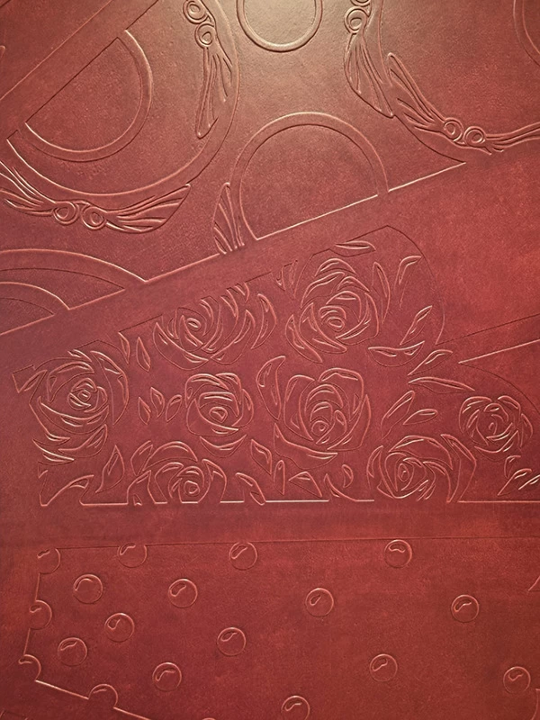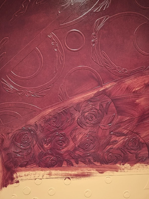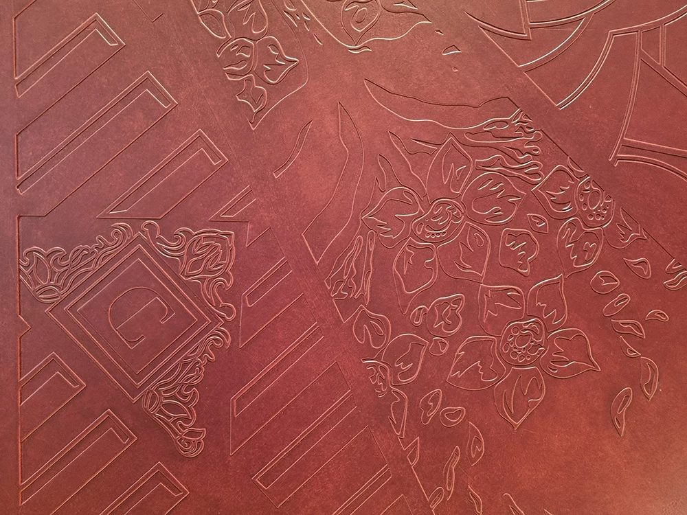 Ils ont été mis en valeur avec une imitation de cuir prune gaufré et une patine dégradée rose poudrée.