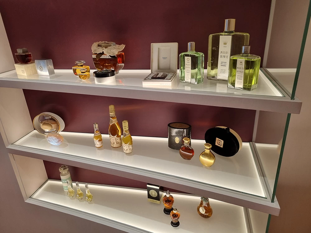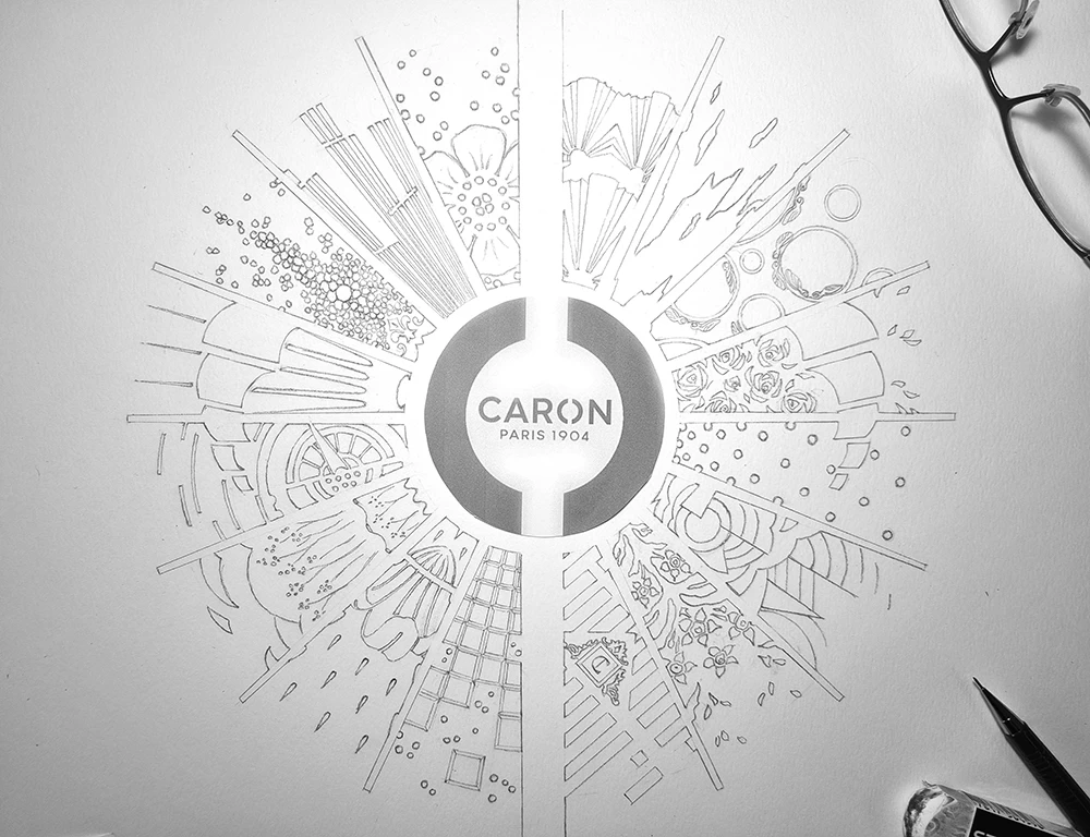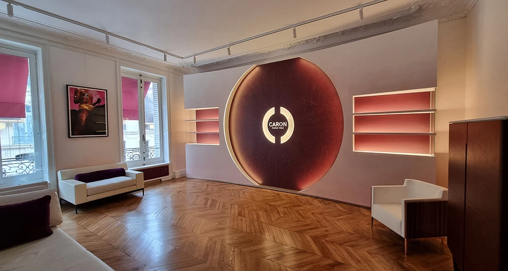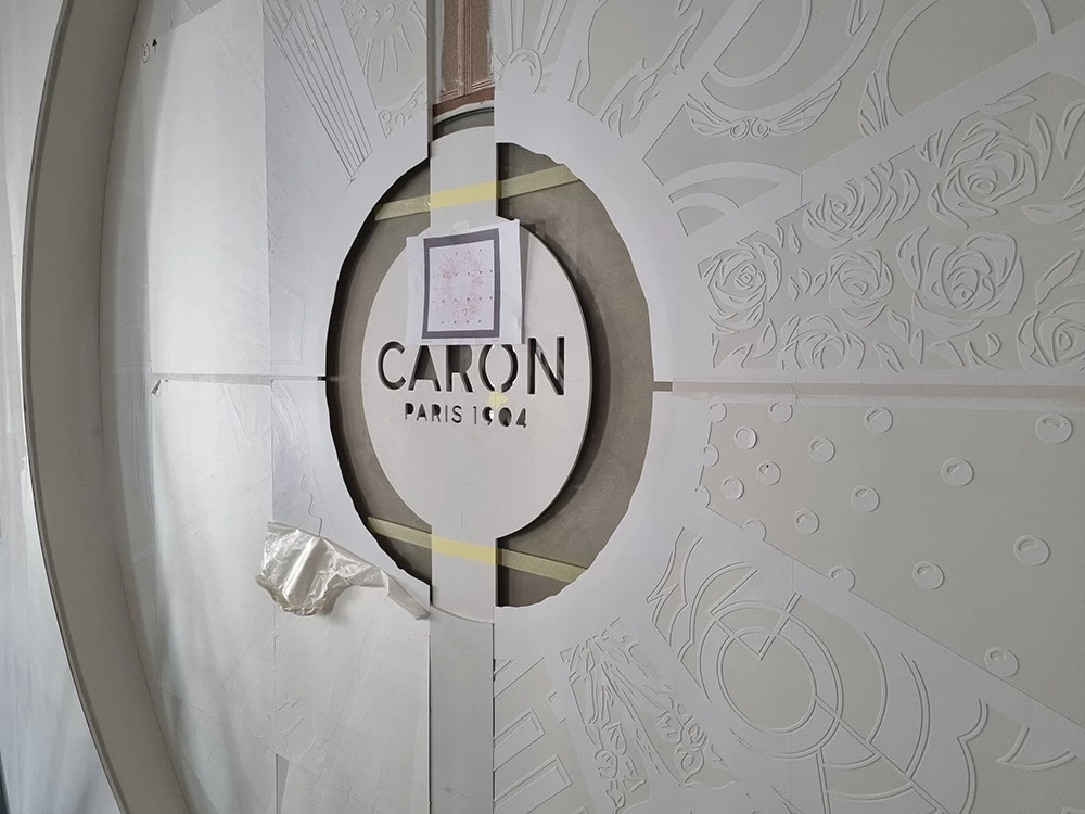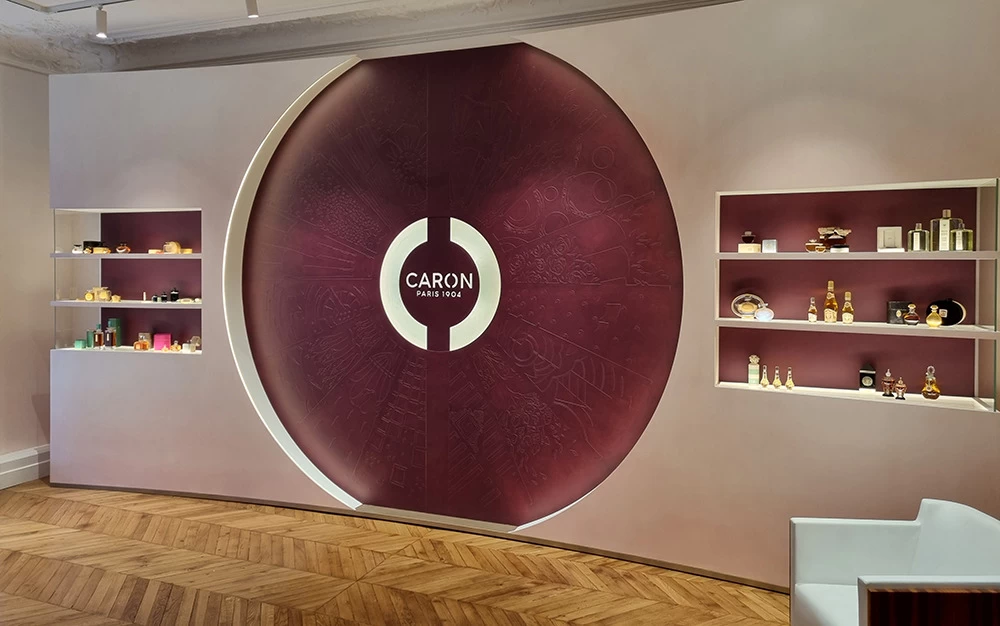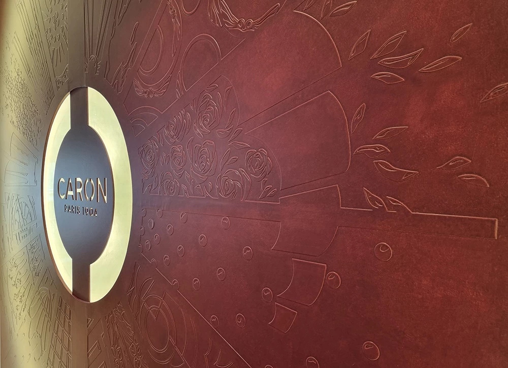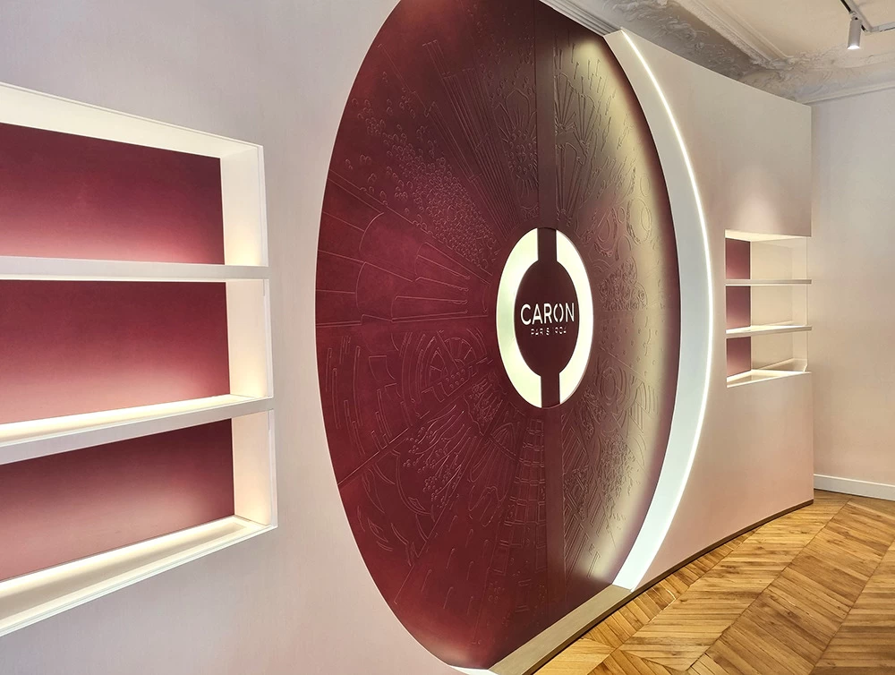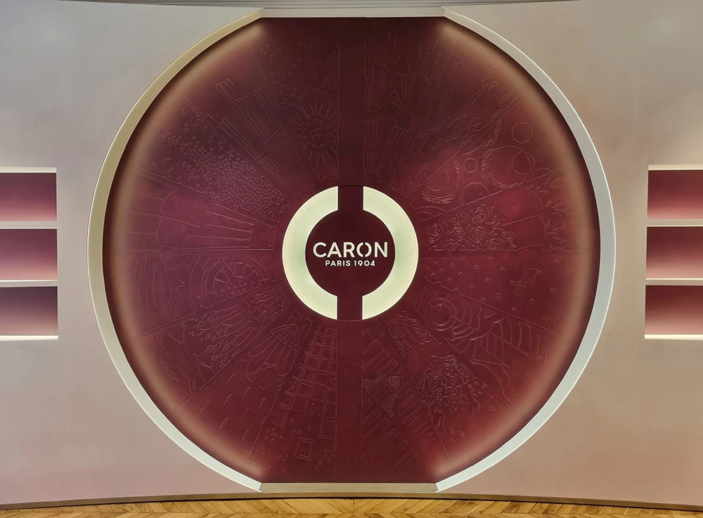 Située dans un salon VIP, cette vitrine contient les anciennes boîtes et les anciens parfums CARON depuis 1904. L’idée était de les présenter avec au centre les motifs et les dessins qui ont été créés depuis l’origine. Tous ces dessins sont issus des boîtes ou des flacons, ils ont été prolongés tout en conservant une grande partie conforme à leur origine.