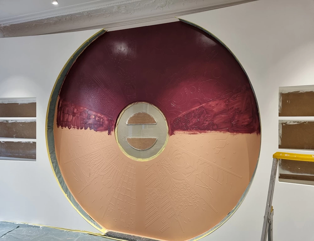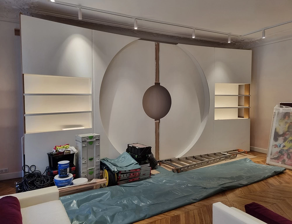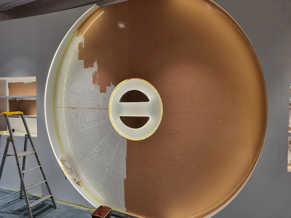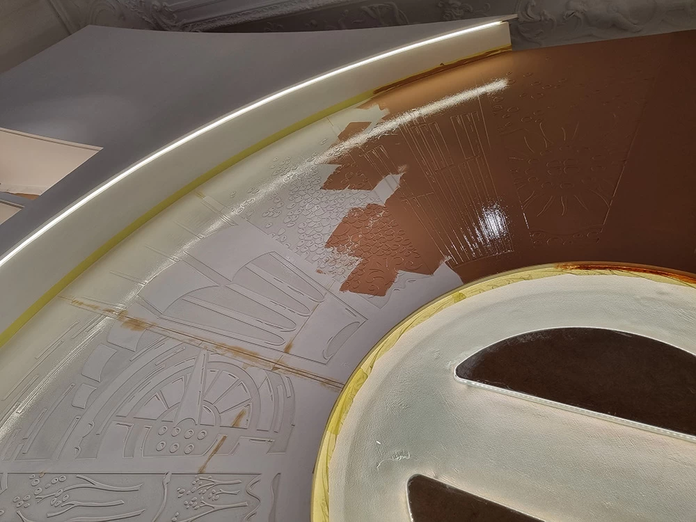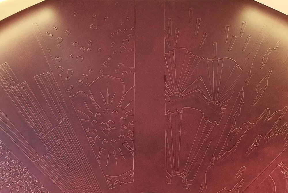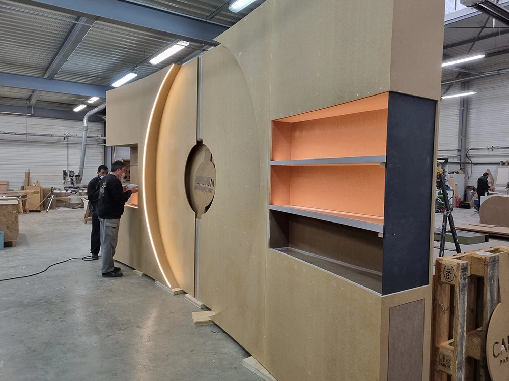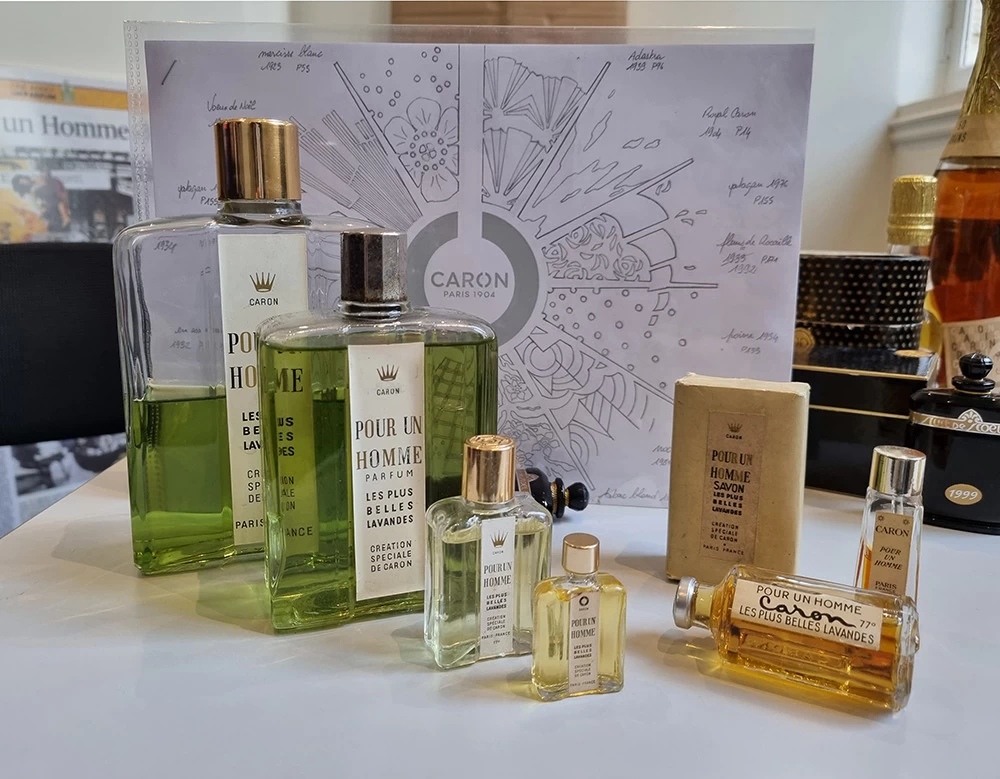 Située dans un salon VIP, cette vitrine contient les anciennes boîtes et les anciens parfums CARON depuis 1904. L’idée était de les présenter avec au centre les motifs et les dessins qui ont été créés depuis l’origine. Tous ces dessins sont issus des boîtes ou des flacons, ils ont été prolongés tout en conservant une grande partie conforme à leur origine.