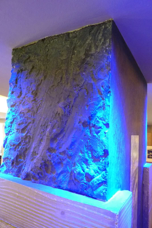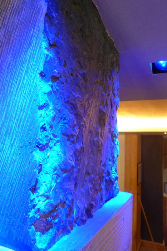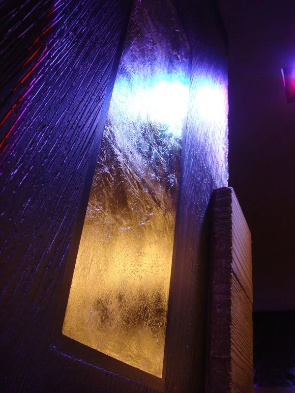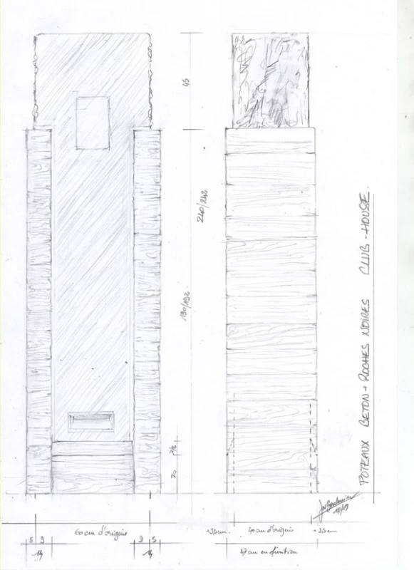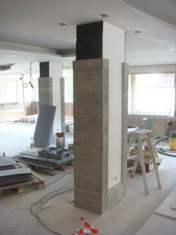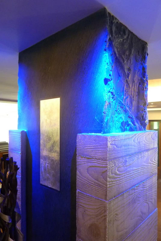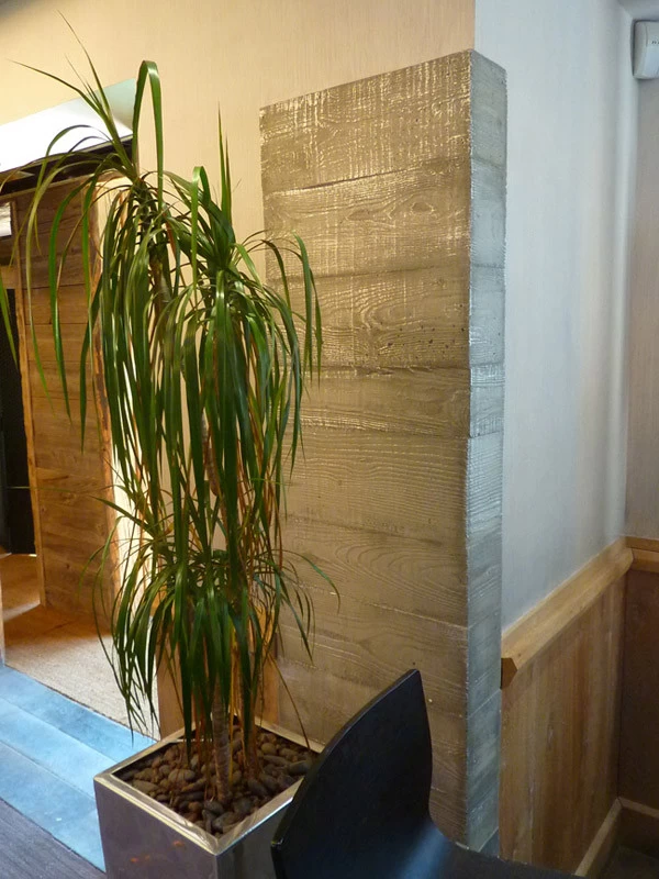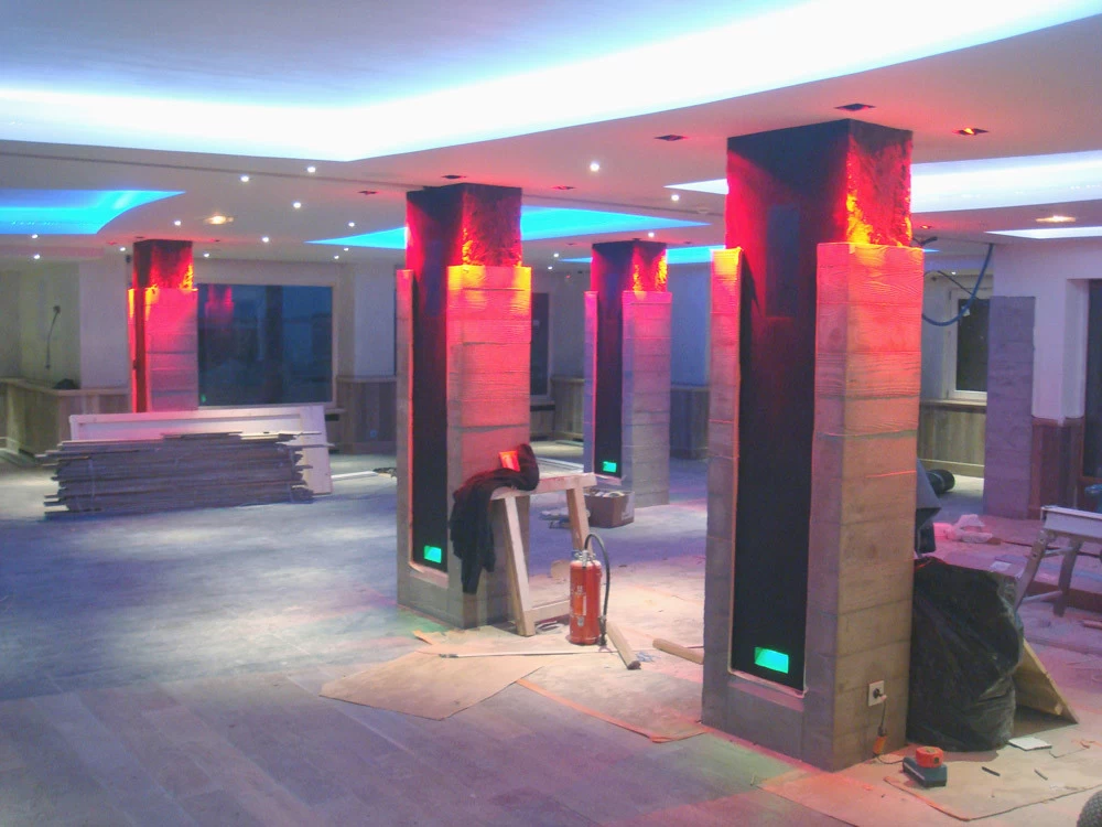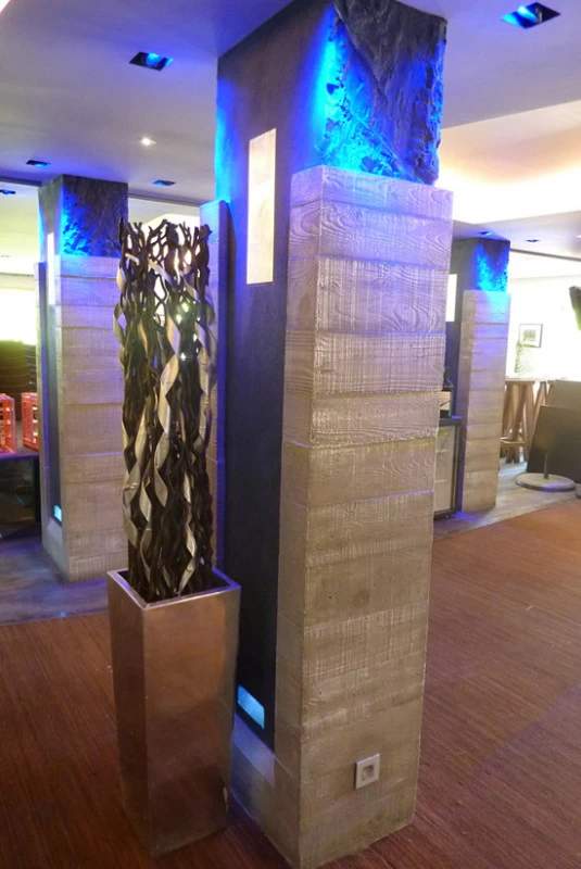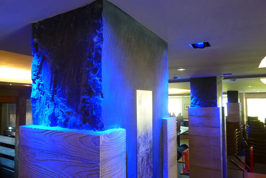 These posts are part of a decorative ensemble that includes moulded concrete in a wooden plank style, imitations of striated slate, painted patinas with gradient shades on the top of the walls. This high-altitude restaurant, which can accommodate between 800 and 1200 people every day during the high ski season, is heavily used and had to be treated with solid materials. The combination of concrete and resin glue plaster imitating slate was the most appropriate. On the top of these posts, a composition of plaster and gravel was cast and patinated with slate on a bed of fibreglass (in the workshop and glued on site).