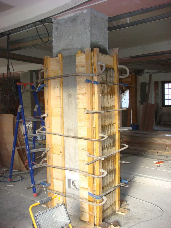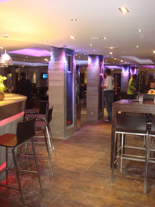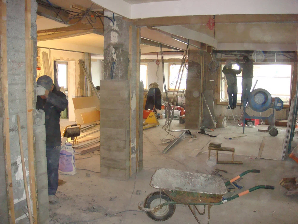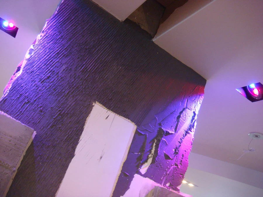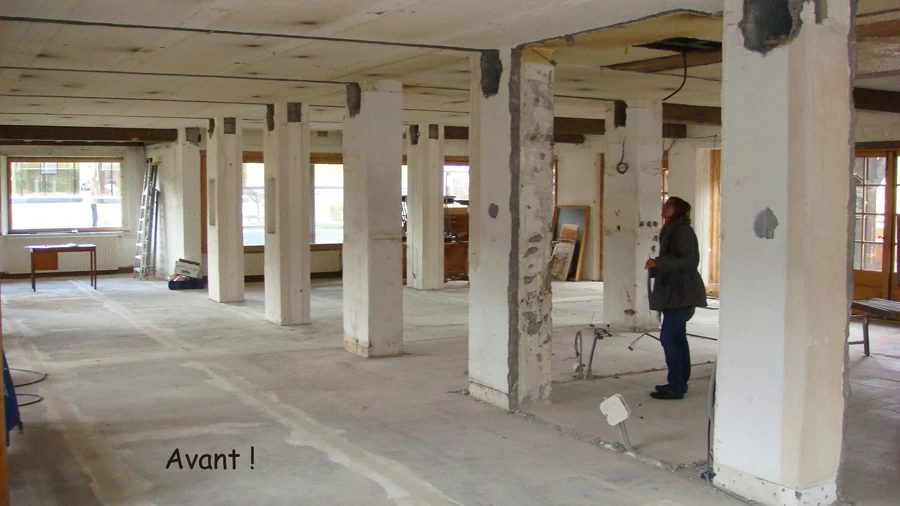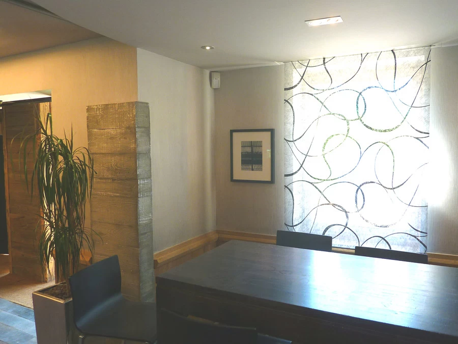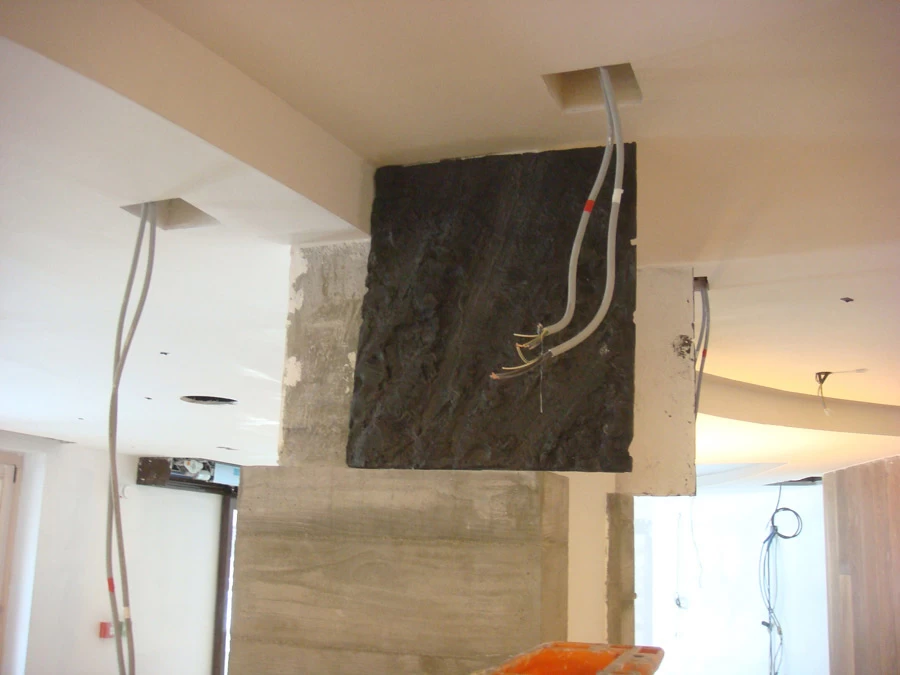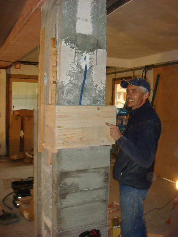 These posts are part of a decorative ensemble that includes moulded concrete in a wooden plank style, imitations of striated slate, painted patinas with gradient shades on the top of the walls. This high-altitude restaurant, which can accommodate between 800 and 1200 people every day during the high ski season, is heavily used and had to be treated with solid materials. The combination of concrete and resin glue plaster imitating slate was the most appropriate. On the top of these posts, a composition of plaster and gravel was cast and patinated with slate on a bed of fibreglass (in the workshop and glued on site).