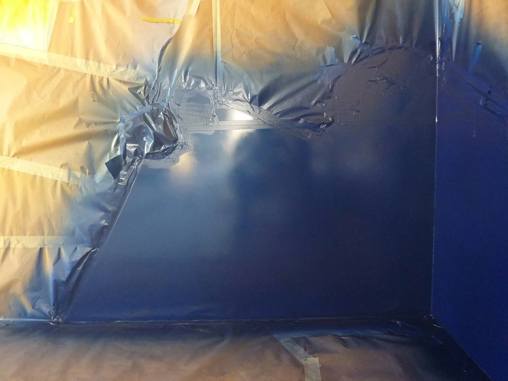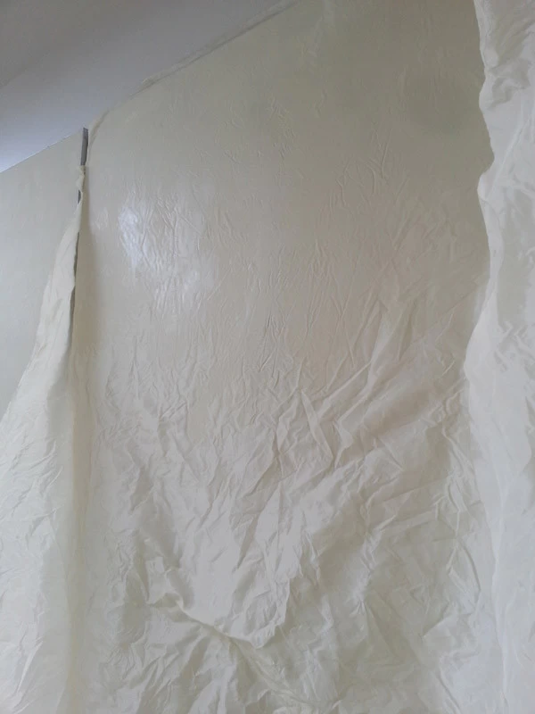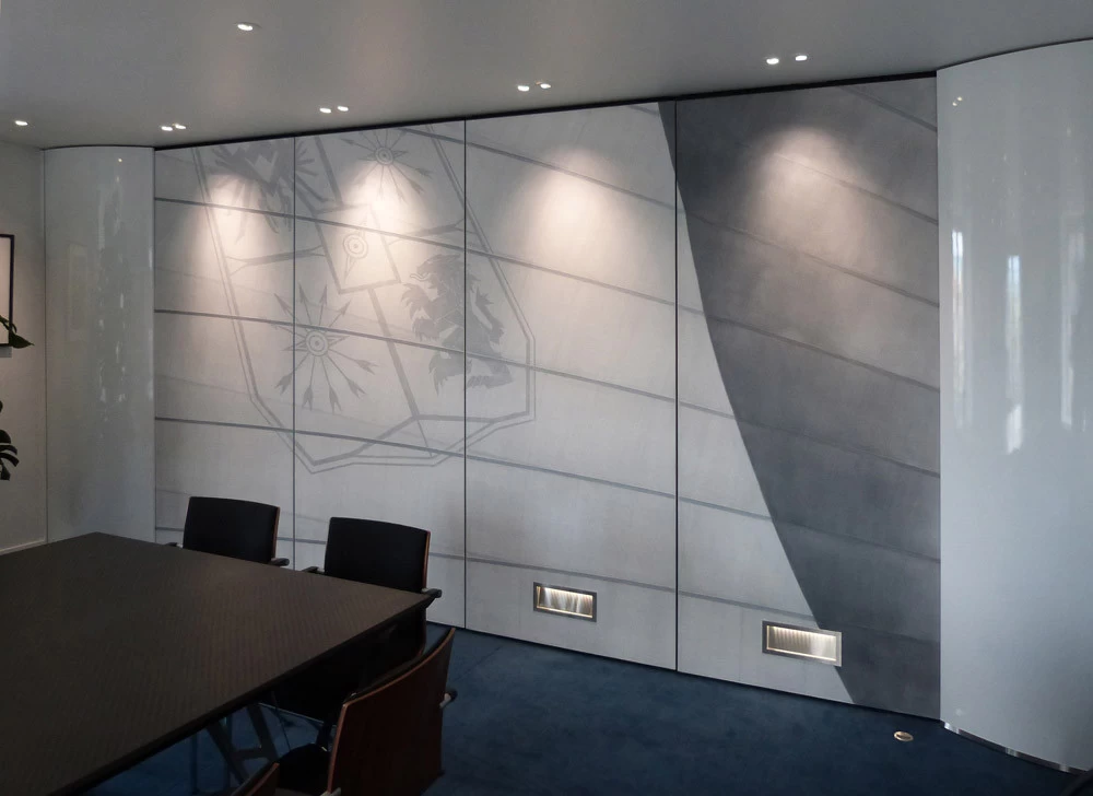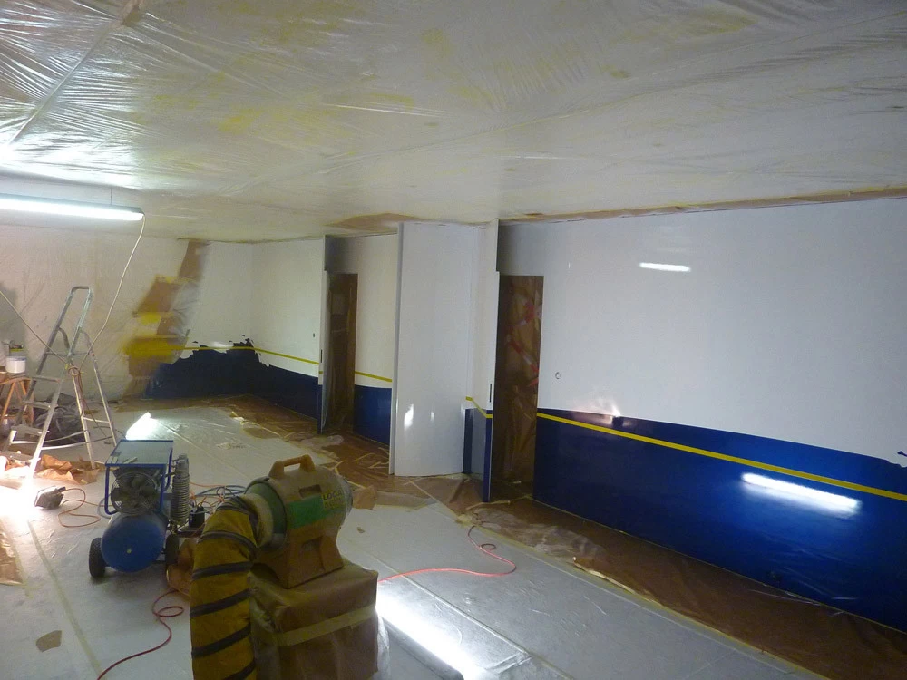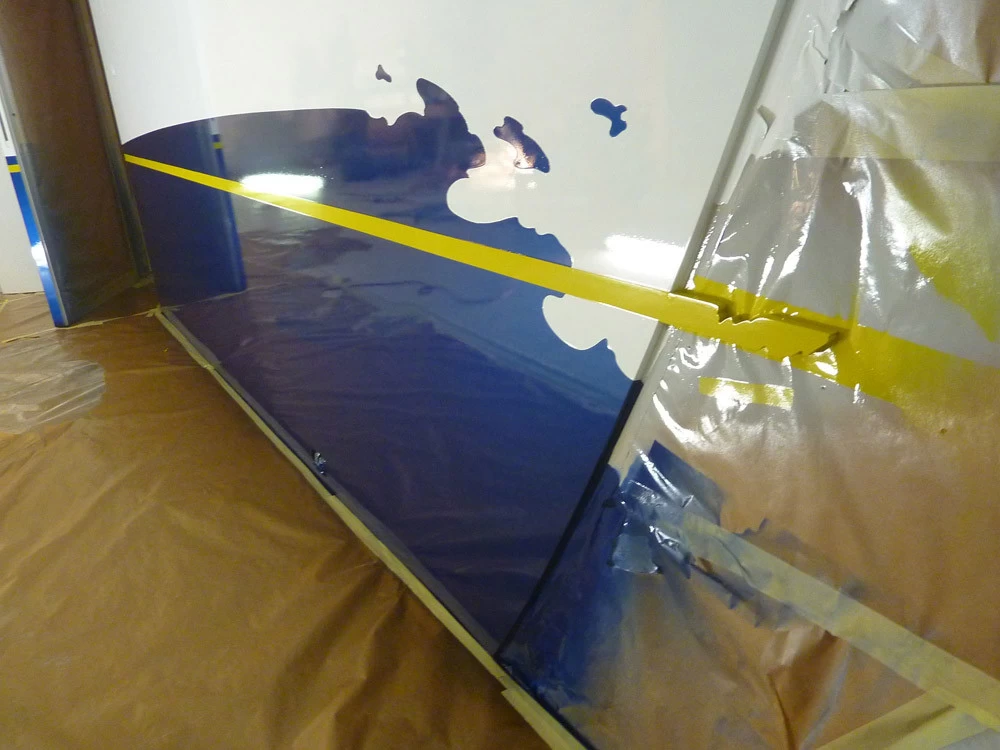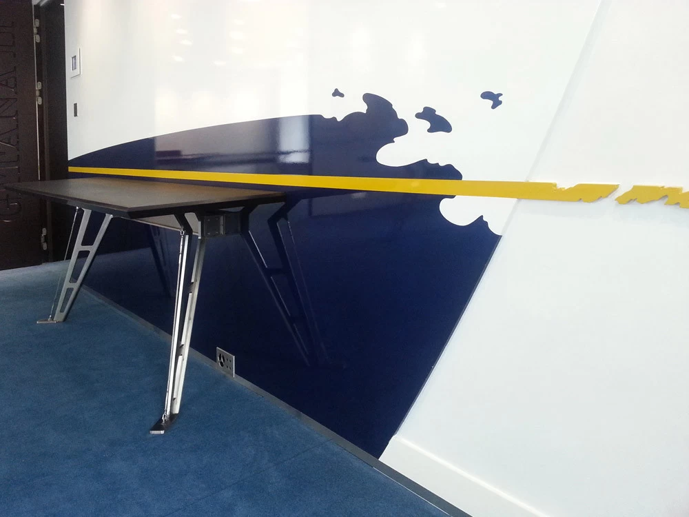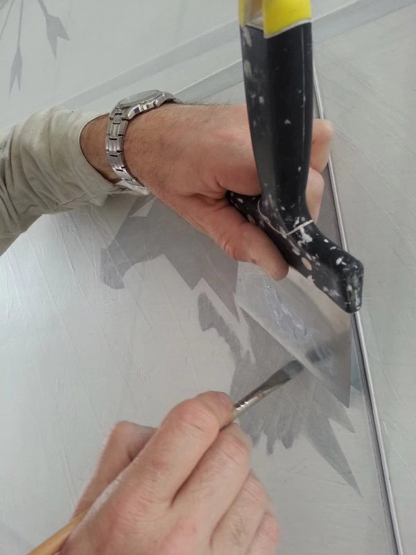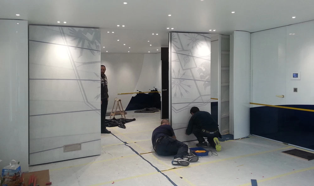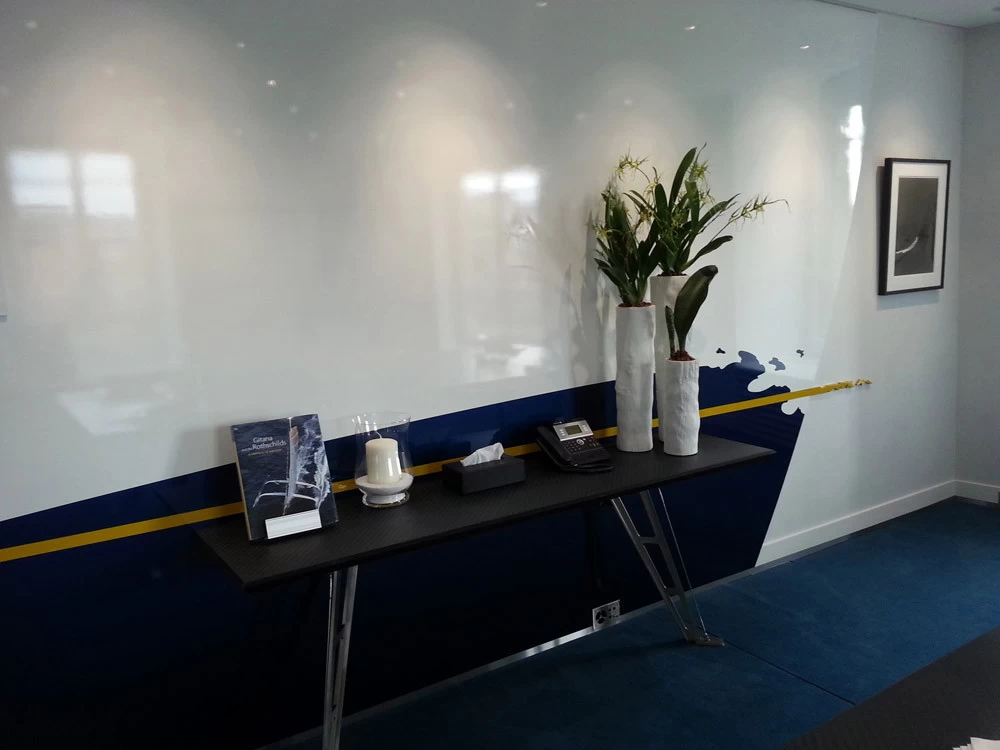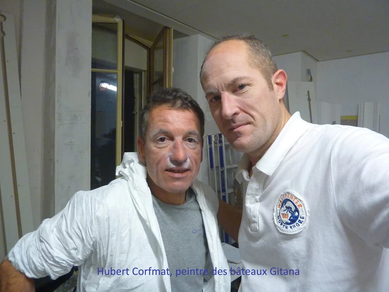In reference to the Gitana boats and according to my drawings, creation on a removable partition of a false sail and its crest. The texture is given thanks to the superposition of pleated taffeta and crumpled tissue paper. Part of the part is treated with corian panels and metallic paints identical to those of the GITANA boats painted by Hubert Corfmat on site.