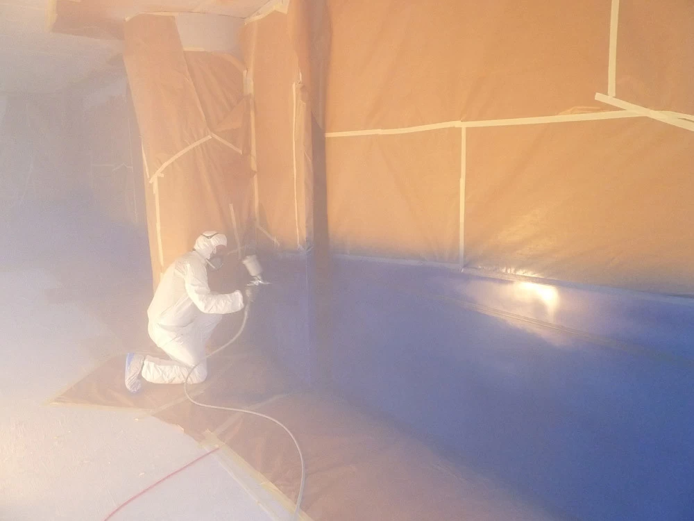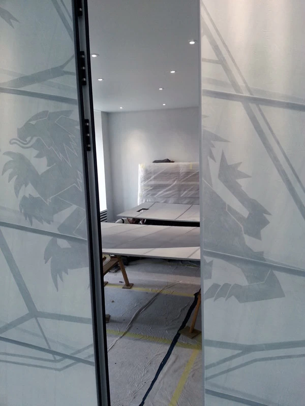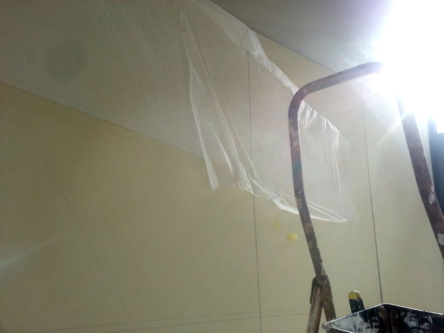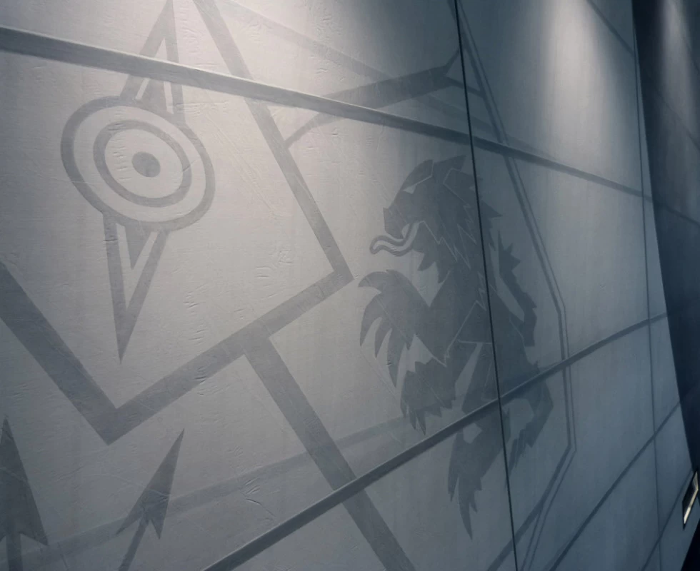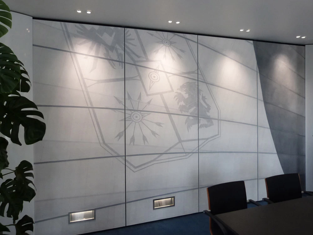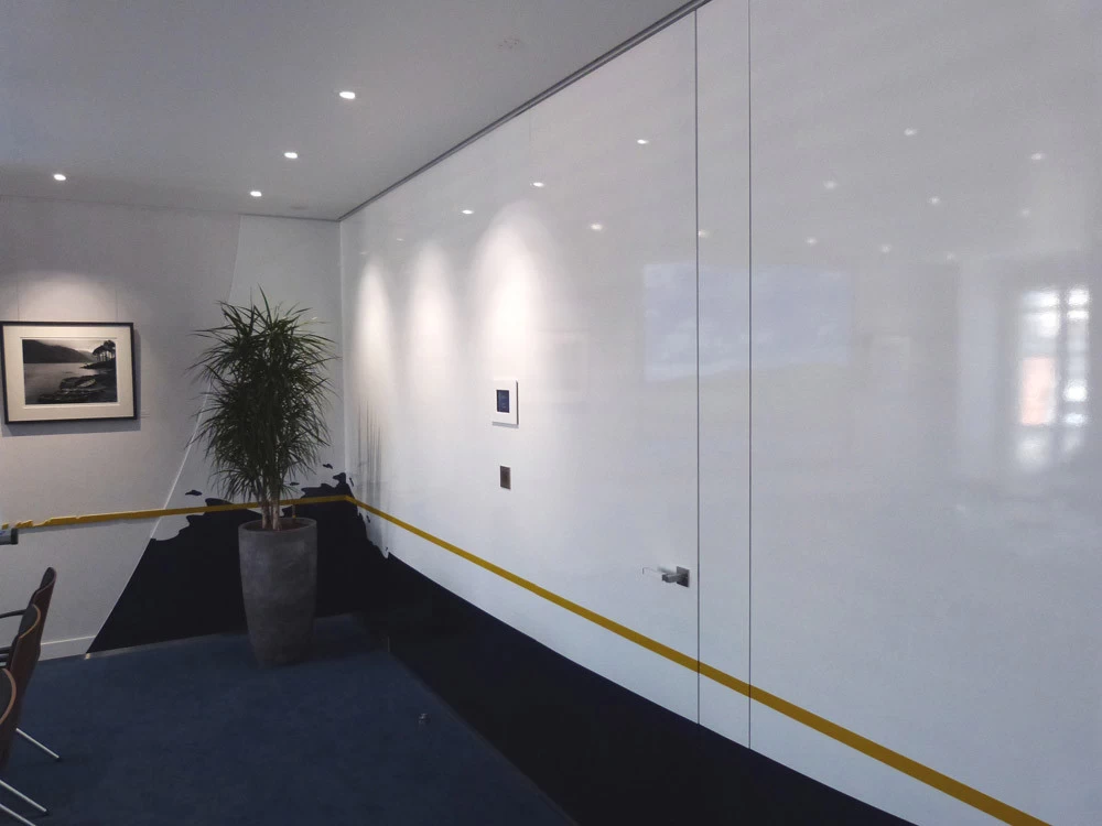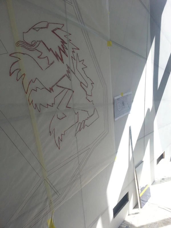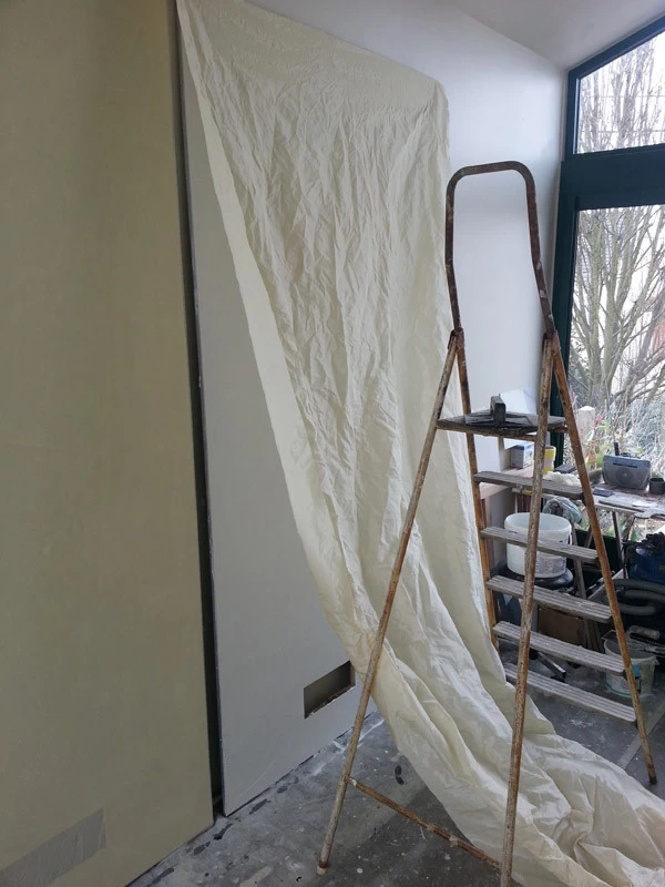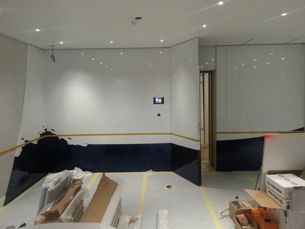 In reference to the Gitana boats and according to my drawings, creation on a removable partition of a false sail and its crest. The texture is given thanks to the superposition of pleated taffeta and crumpled tissue paper. Part of the part is treated with corian panels and metallic paints identical to those of the GITANA boats painted by Hubert Corfmat on site.