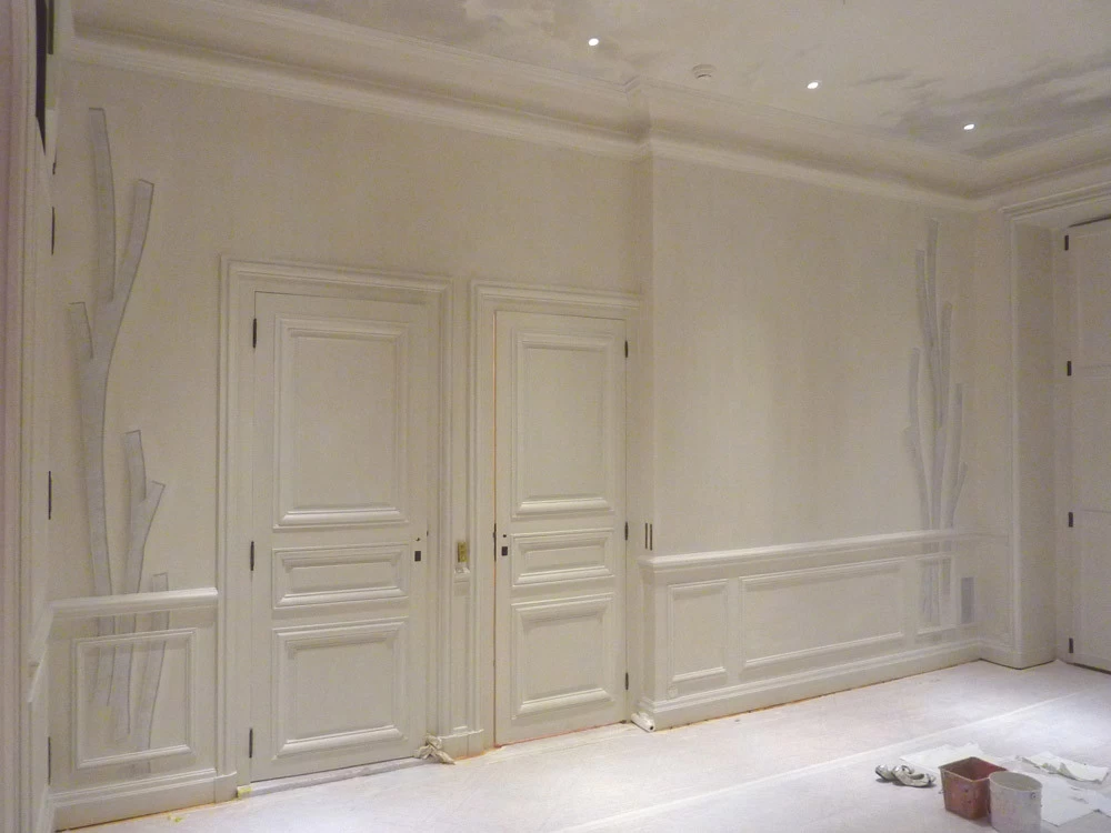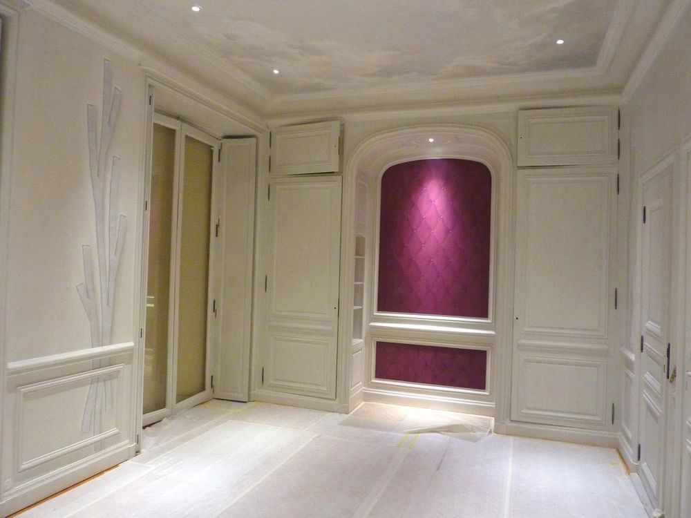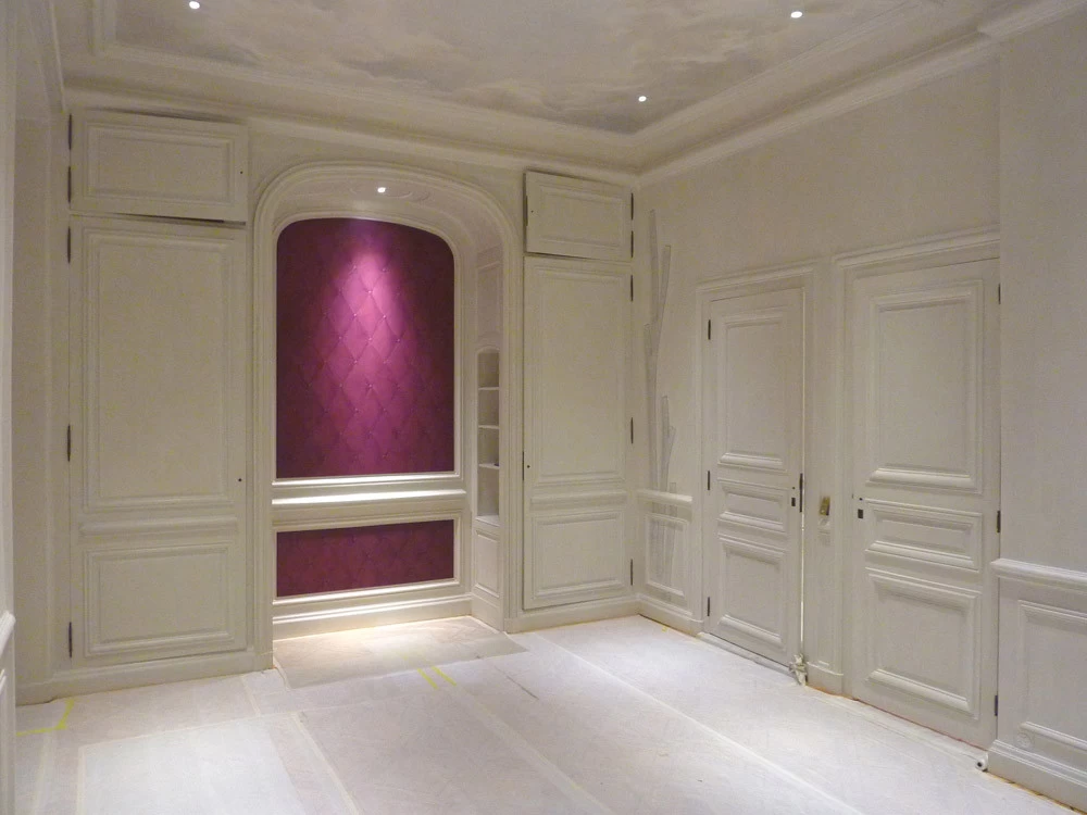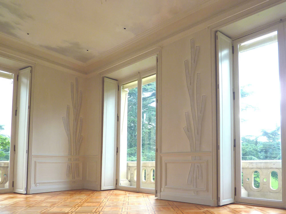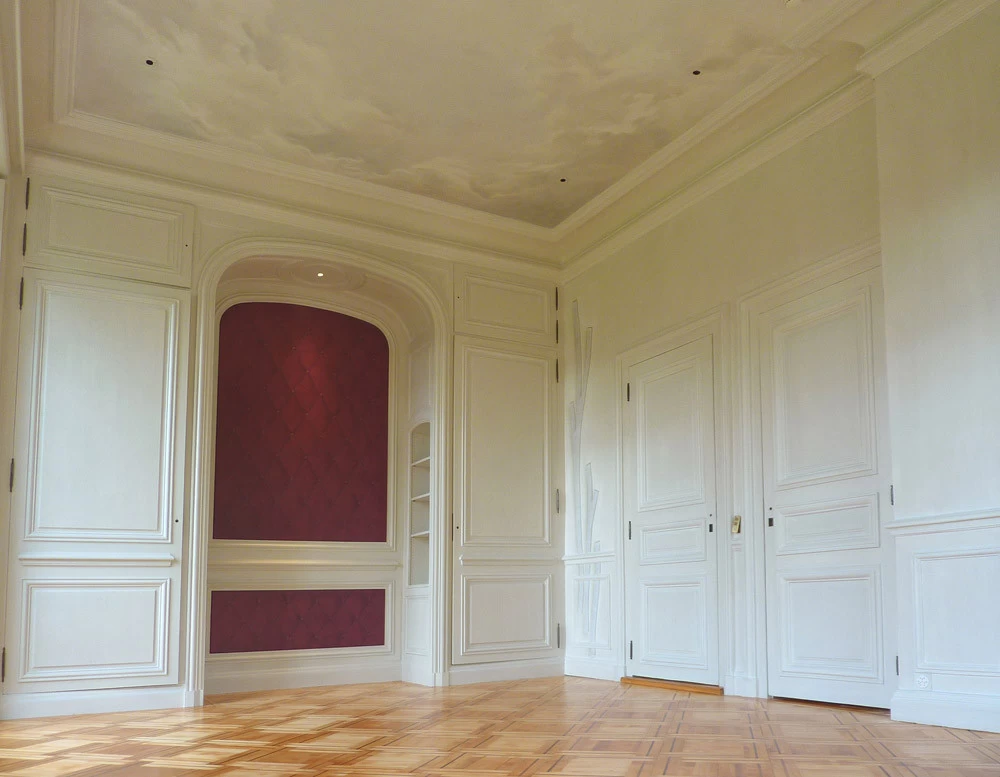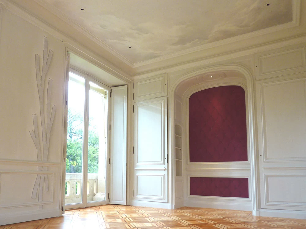 The luminescence in a bedroom must be soft so as not to stay awake at night, but it is still the ideal place to enjoy a different decoration during the day and at night. The strips, falsely dug in trompe l'oeil, give a modern take-off in this castle room while respecting the mouldings and other ornamentation. Their locations take into account future tables. The seasons, sunshine, artificial lighting, etc.... vary the output power of this luminescence according to UV exposures. These bands complement an equally luminous sky (ground/sky section).