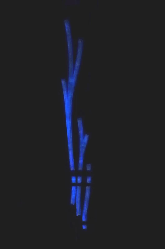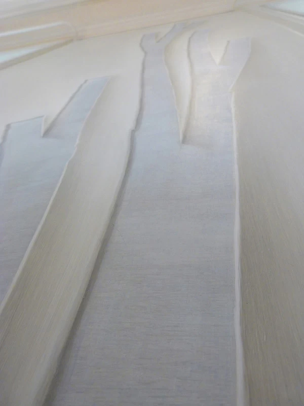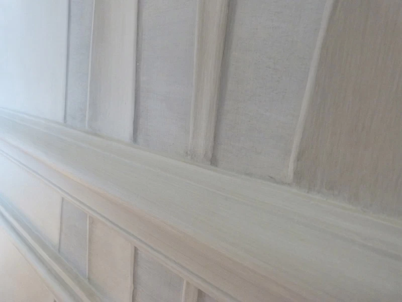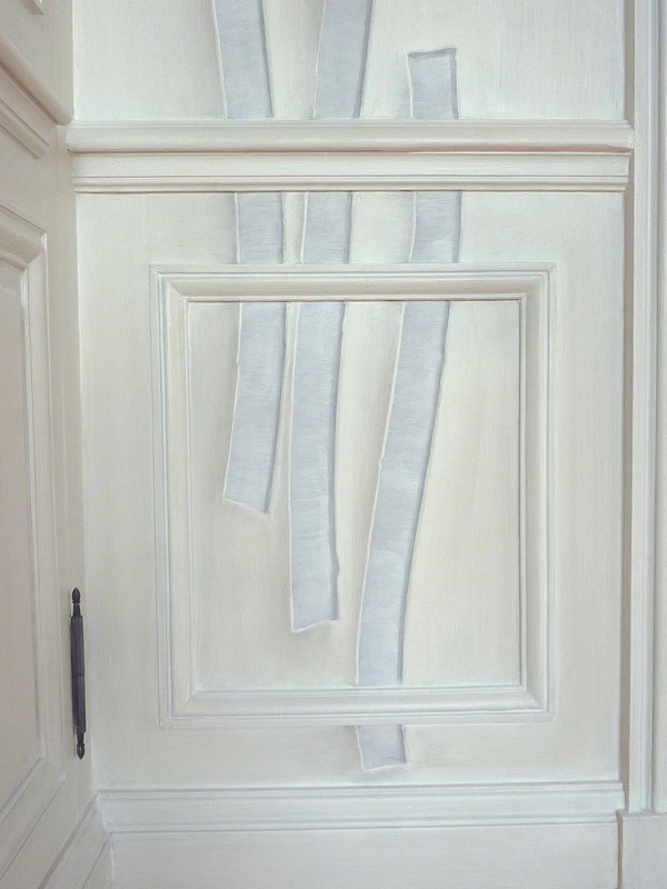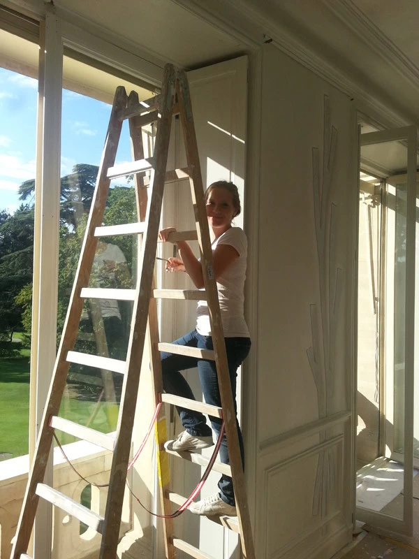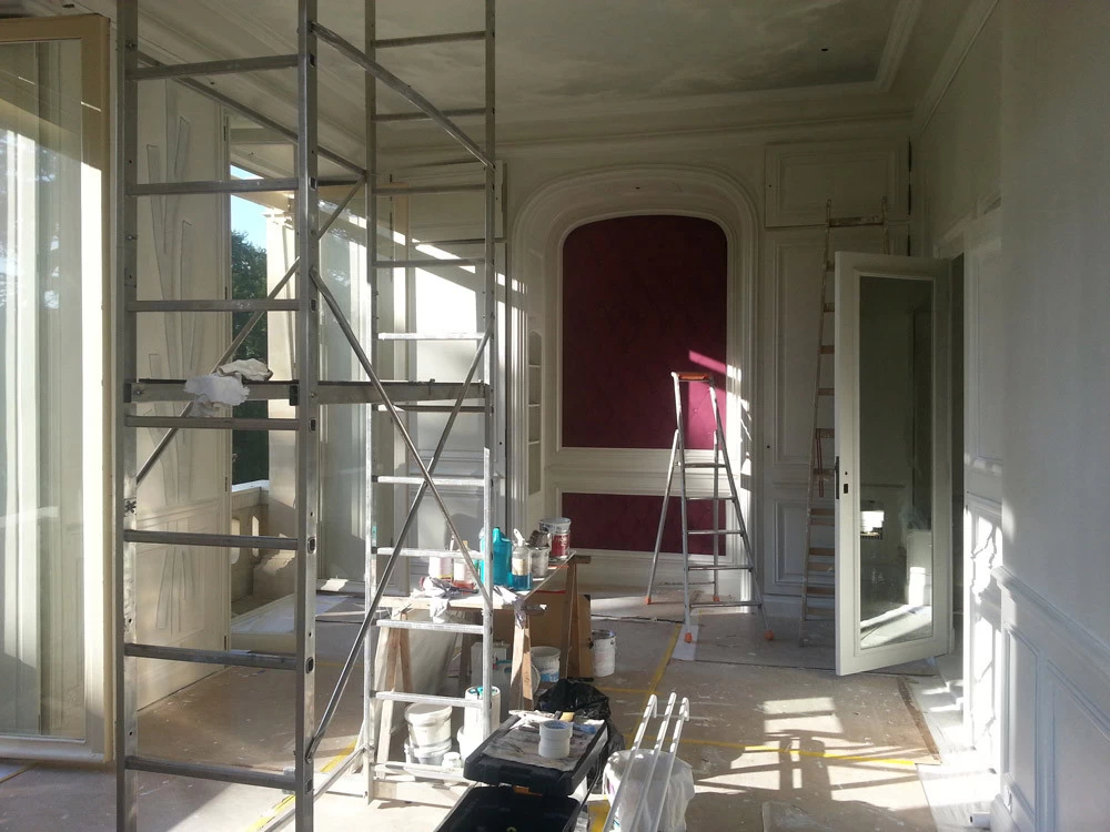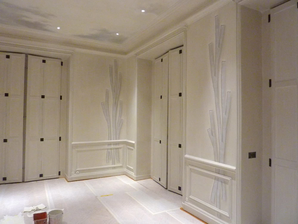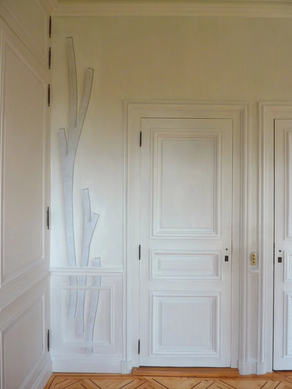 The luminescence in a bedroom must be soft so as not to stay awake at night, but it is still the ideal place to enjoy a different decoration during the day and at night. The strips, falsely dug in trompe l'oeil, give a modern take-off in this castle room while respecting the mouldings and other ornamentation. Their locations take into account future tables. The seasons, sunshine, artificial lighting, etc.... vary the output power of this luminescence according to UV exposures. These bands complement an equally luminous sky (ground/sky section).