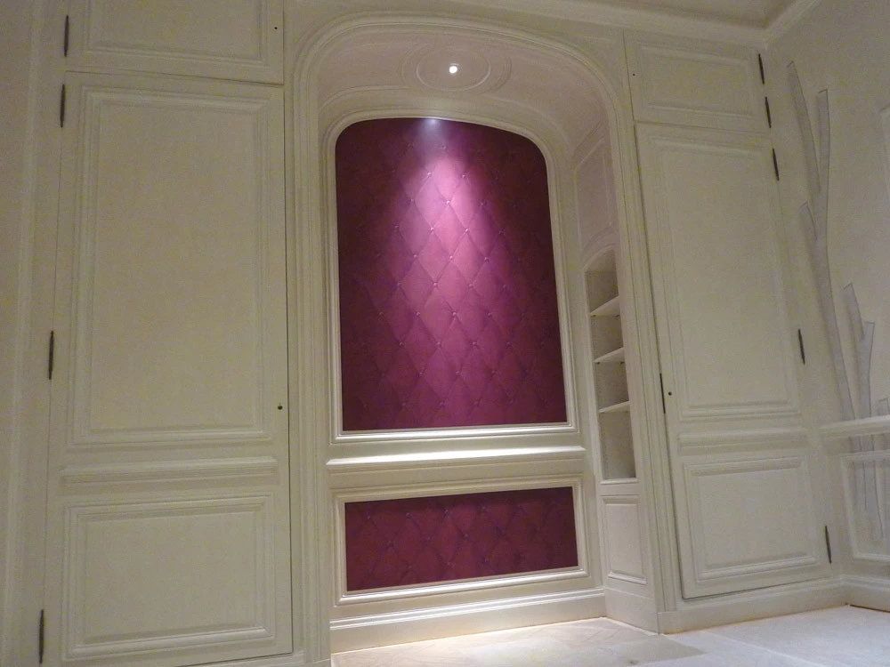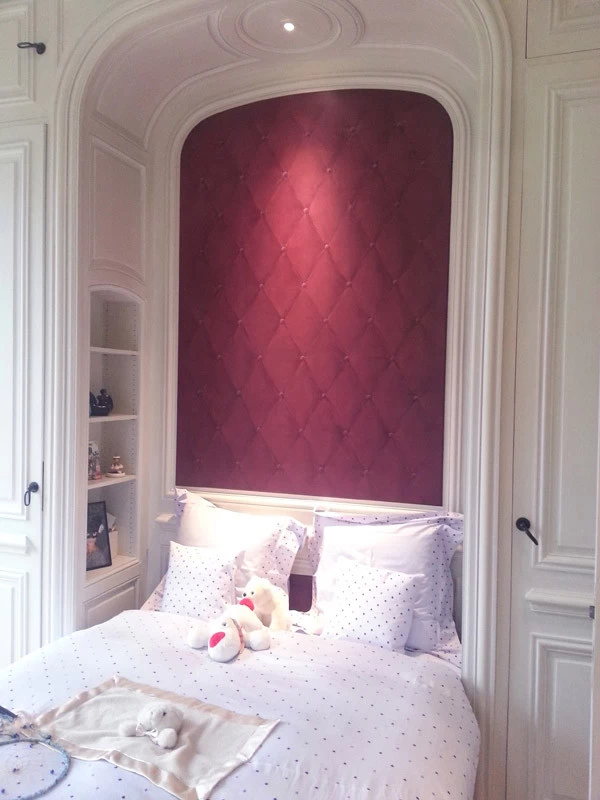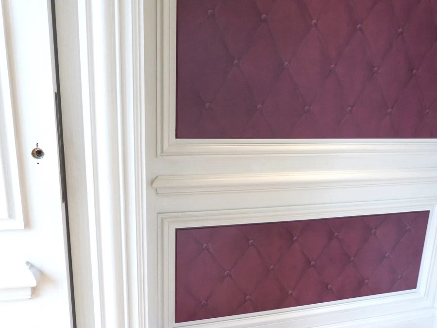 This trompe l'oeil upholstery provides the strength and presence necessary for the transition from the modernity of this room to the entire castle.