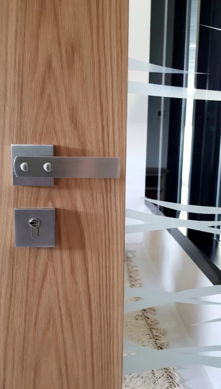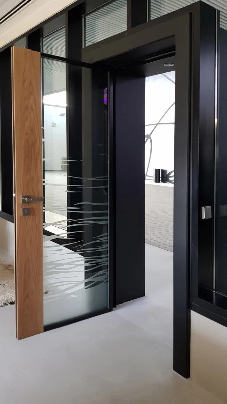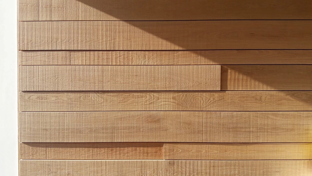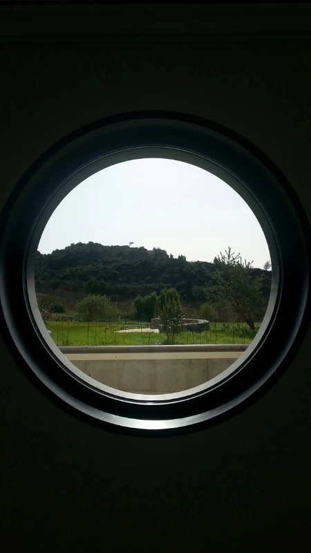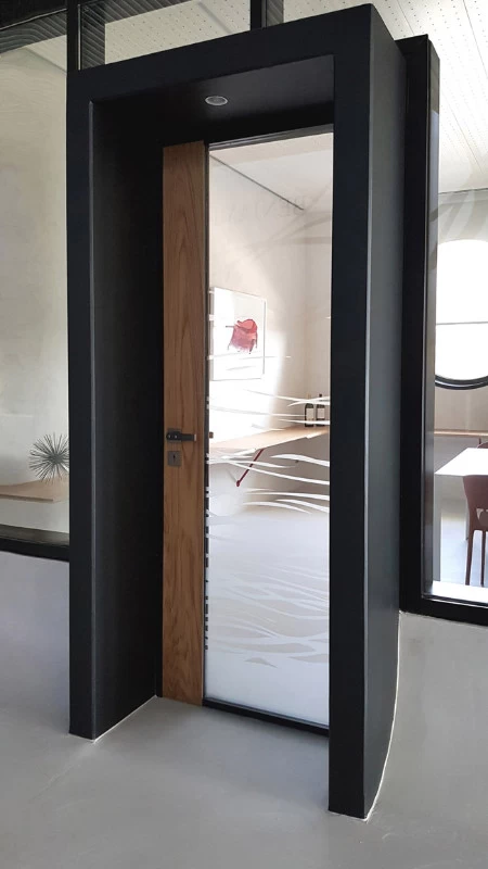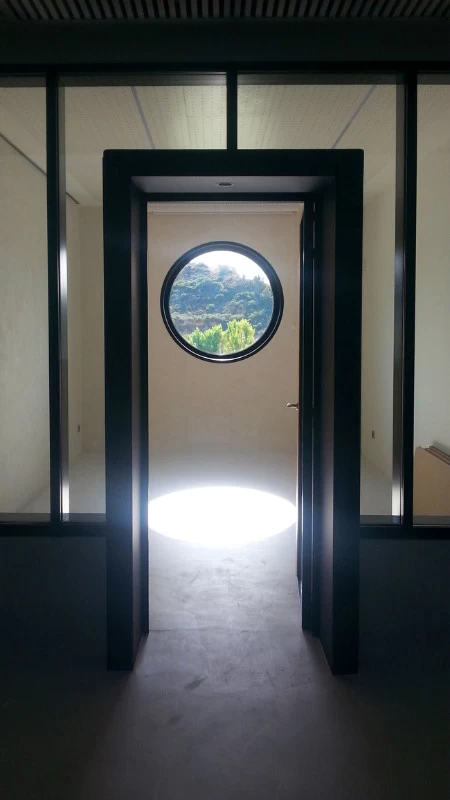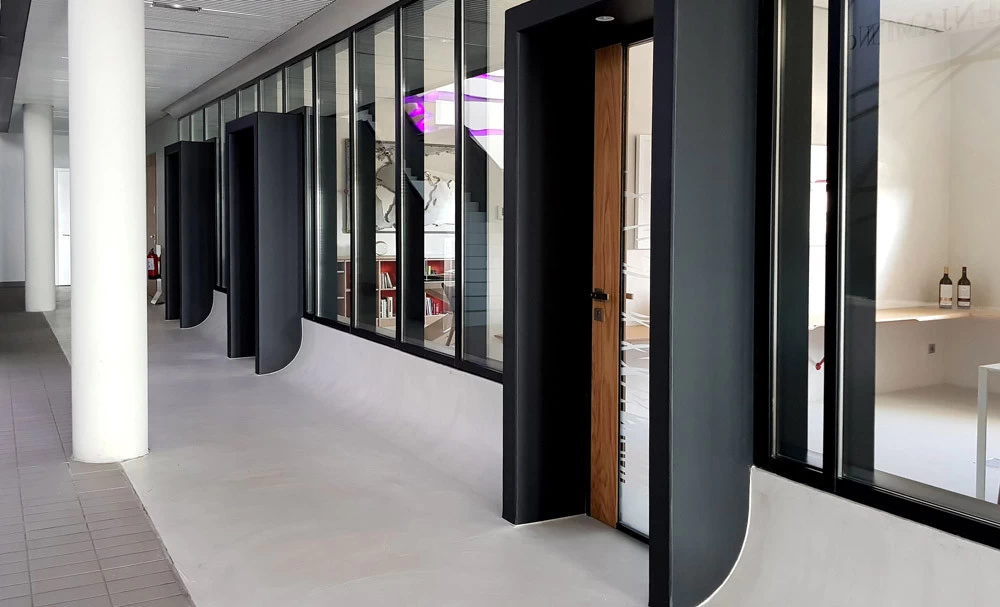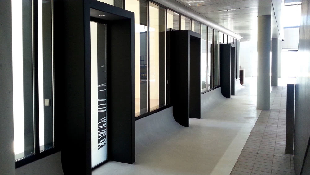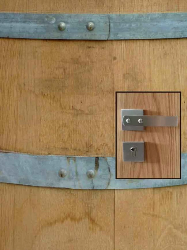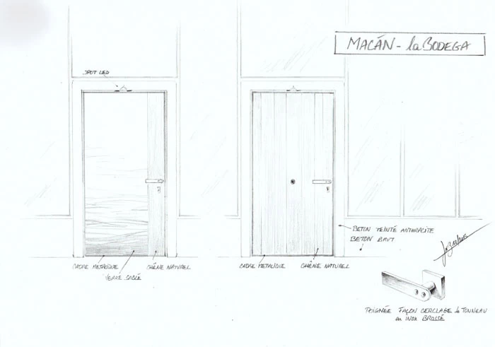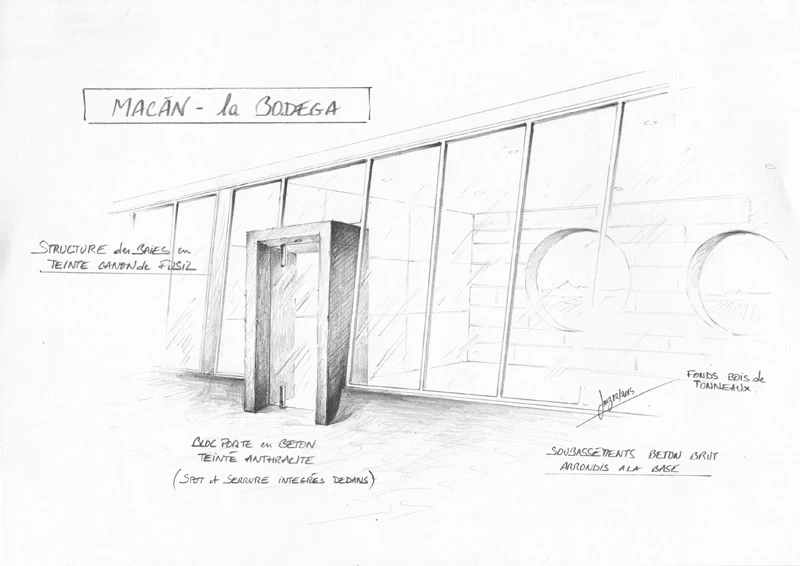 Les accès sont constitués de blocs de béton à travers lesquels on accède aux bureaux. Le béton rappelle l’ensemble de la cave, le bois pour le chai à barrique et le verre pour la luminosité. Je souhaitais que ces blocs permettent l’inclinaison de toutes les baies vitrées des bureaux, mais l’architecte devait certainement trop vouloir changer ses plans et refusa !! Bien dommage puisque tous les bas de murs sont arrondis pour se raccorder avec les sols. Ils auraient été "l'introduction" de l'inclinaison générale. Chaque bureau est patiné ton clair mais possède un mur en planche de chêne façon tonneau séché, d’où les écarts entre chaque planche pour simuler le séchage et la rétractation du bois. Les poignées sont uniques et reprennent le chevauchement des cerclages en zinc rivetés des tonneaux. La réalisation a été faite par les Ets Eusebio en Espagne.
