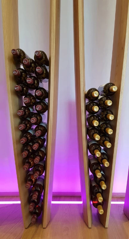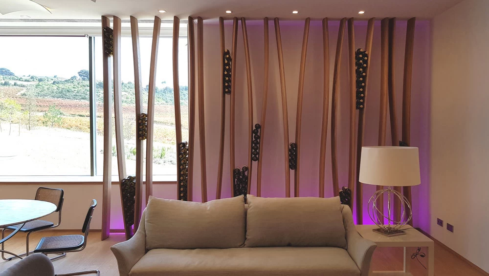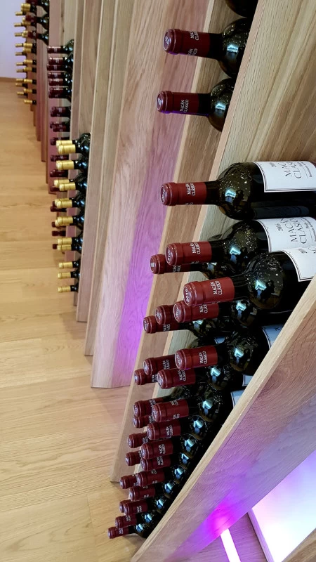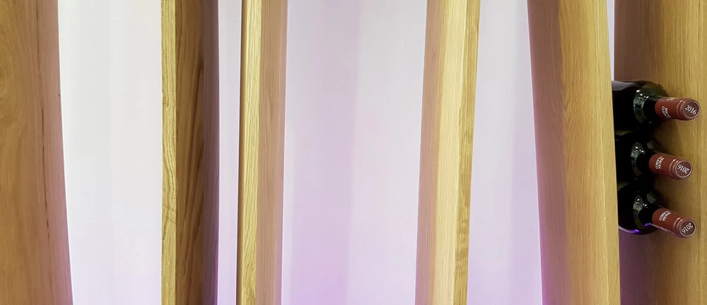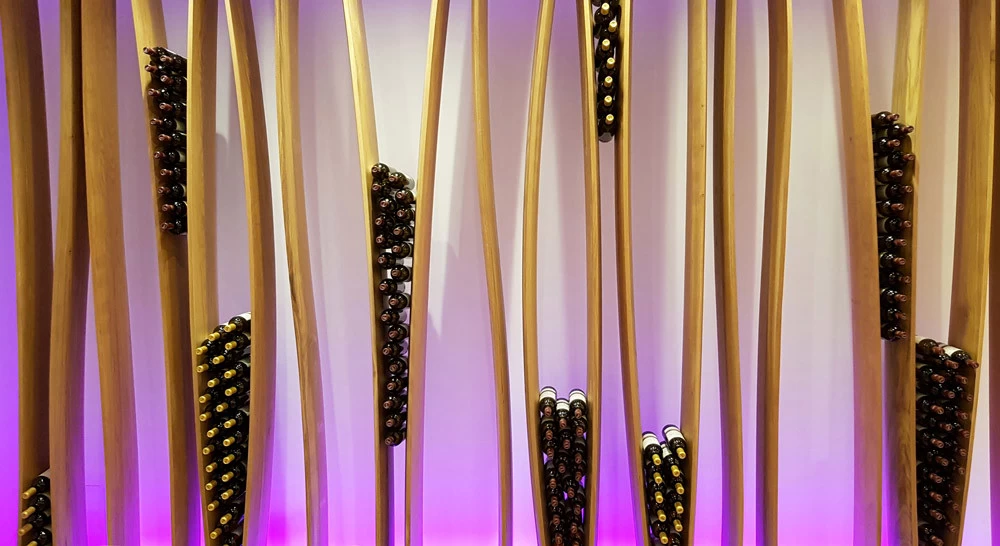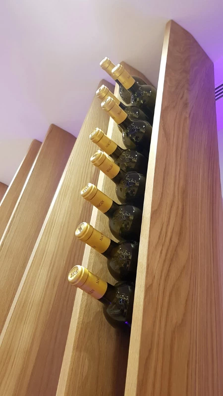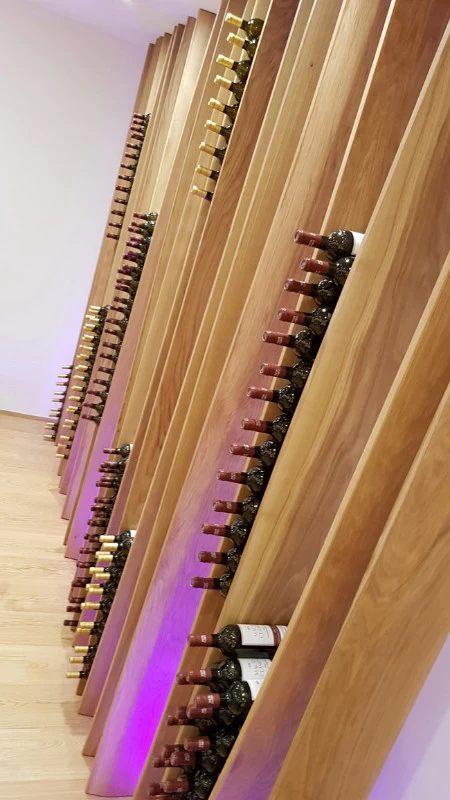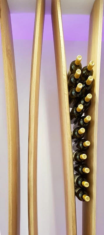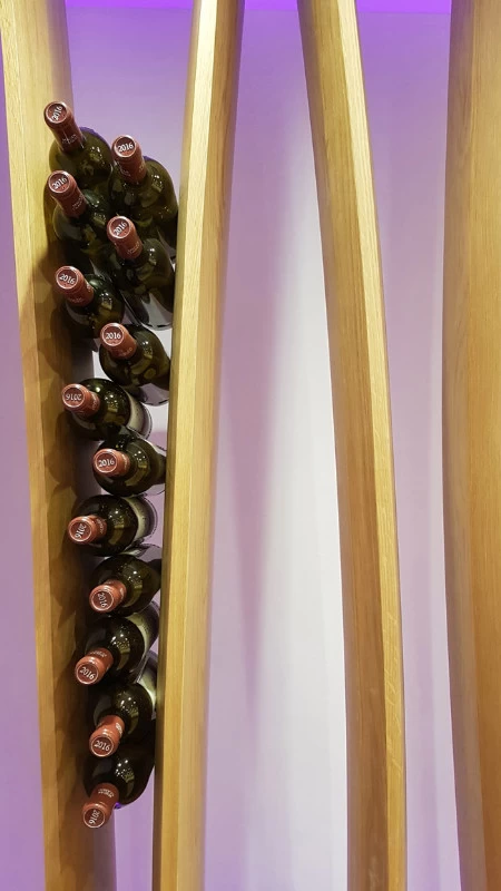 D’esprit végétal et naturel façon « branchages », voici un présentoir qui maintient les bouteilles grâce aux rétrécissements des planches en chêne cintrées. L’idée était de proposer une structure contemporaine, épurée, d’apparence légère et surtout en relation avec la nature puisqu’une partie du présentoir se prolonge devant la baie vitrée et laisse voir le paysage derrière. Le but n’était pas de saturer en bouteilles ce salon VIP mais juste de rappeler aux visiteurs qu’ils sont dans le monde du vin. Cette réalisation très technique de multiplis de chêne, d’apparence simple mais compliquée à mettre en œuvre a été réalisée par les Ets Eusebio en Espagne.