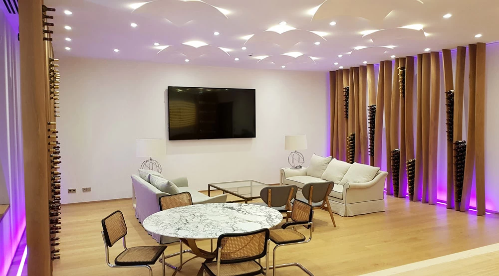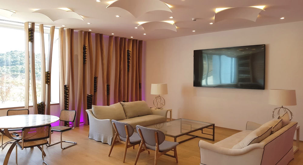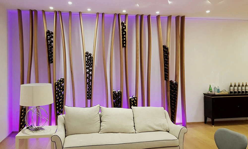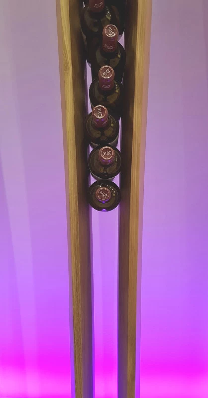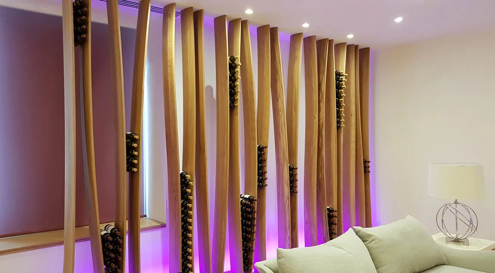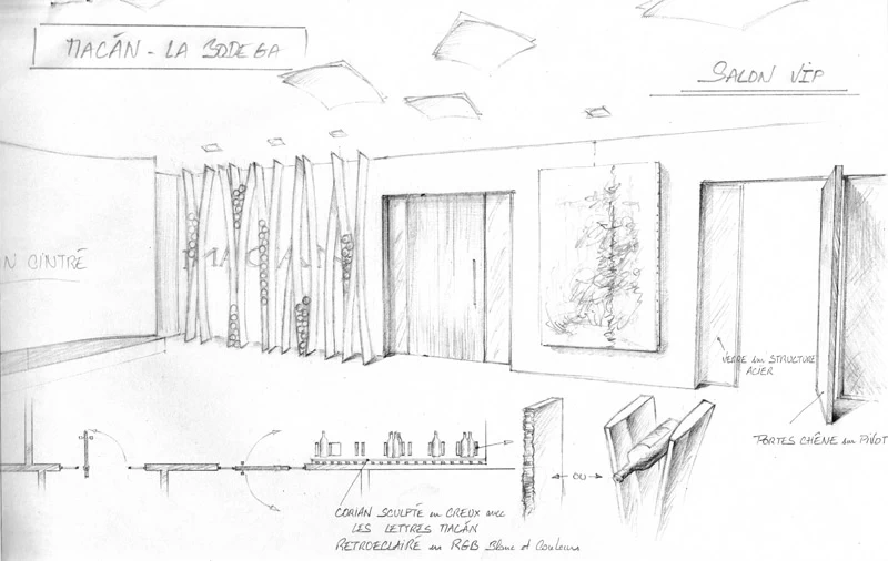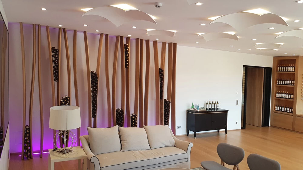 D’esprit végétal et naturel façon « branchages », voici un présentoir qui maintient les bouteilles grâce aux rétrécissements des planches en chêne cintrées. L’idée était de proposer une structure contemporaine, épurée, d’apparence légère et surtout en relation avec la nature puisqu’une partie du présentoir se prolonge devant la baie vitrée et laisse voir le paysage derrière. Le but n’était pas de saturer en bouteilles ce salon VIP mais juste de rappeler aux visiteurs qu’ils sont dans le monde du vin. Cette réalisation très technique de multiplis de chêne, d’apparence simple mais compliquée à mettre en œuvre a été réalisée par les Ets Eusebio en Espagne.