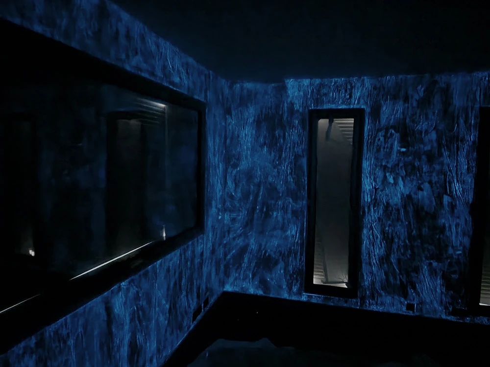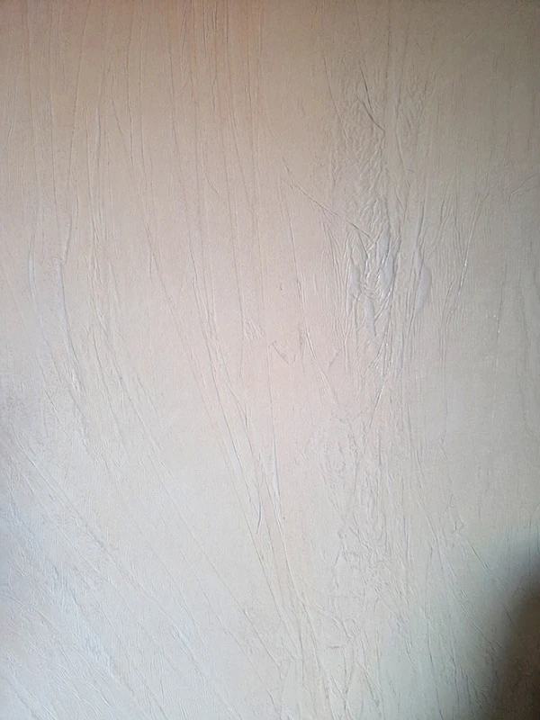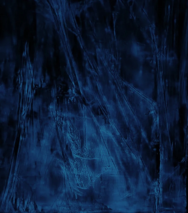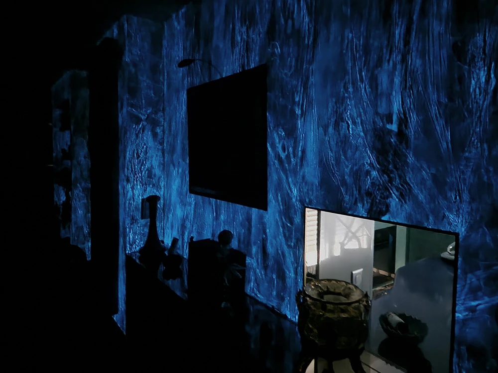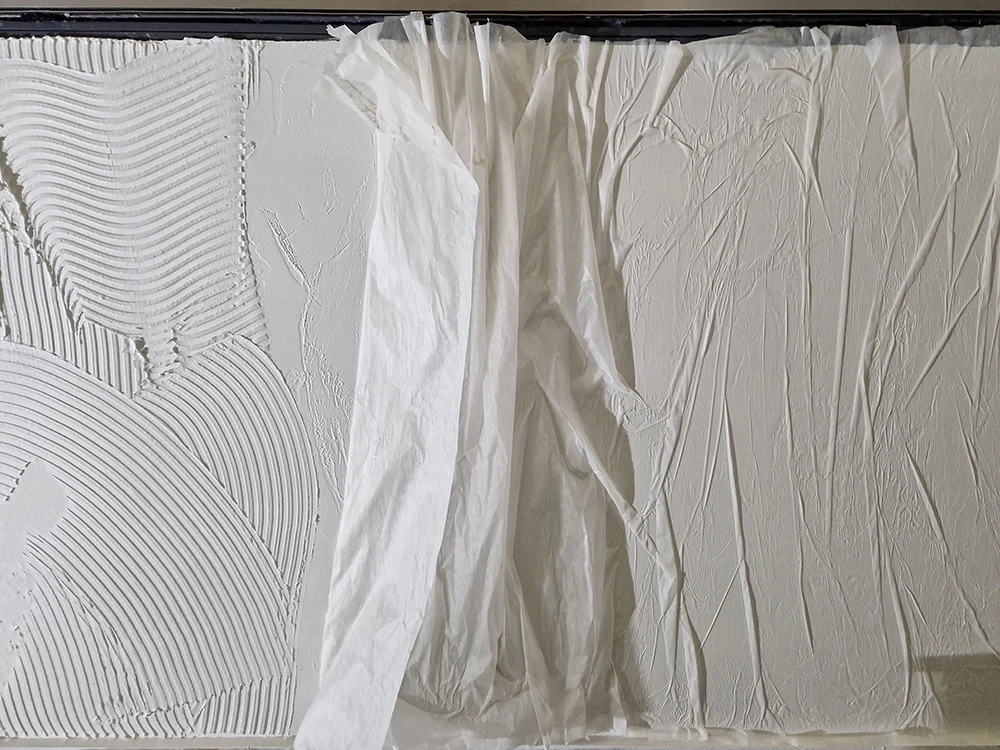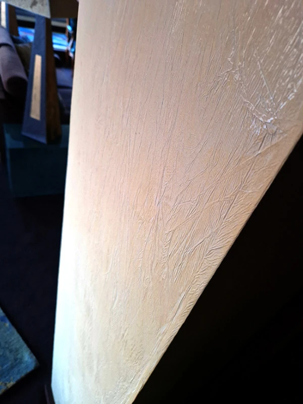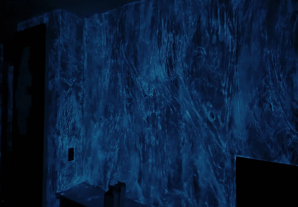 Voici des murs lumineux la nuit. Après avoir appliqué des papiers de soie qui ont laissé des plis volontaires, une patine photoluminescente a été raclée sur l’ensemble des murs afin de donner de la puissance de rémanence dans les creux les plus profonds.