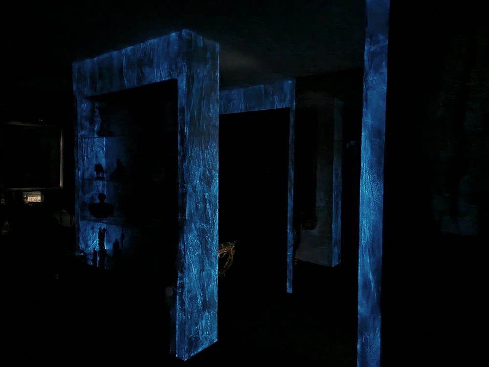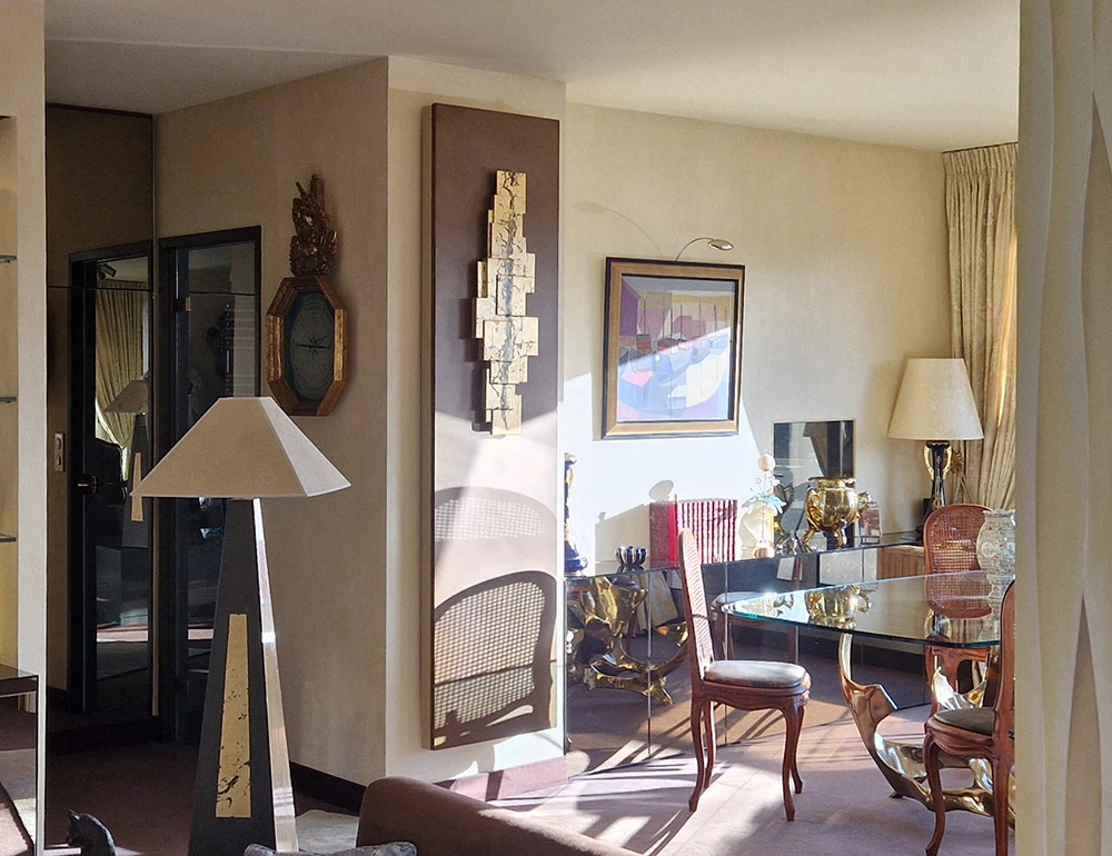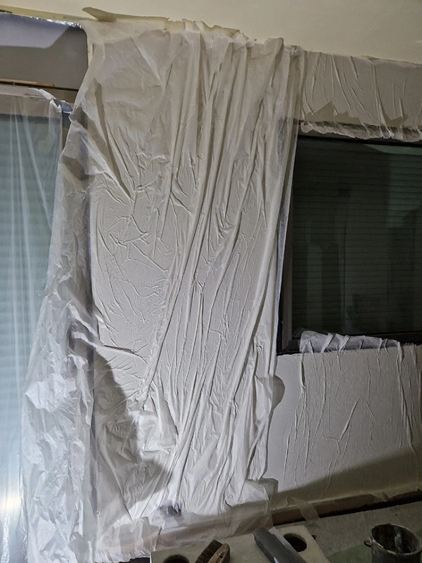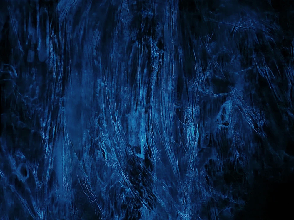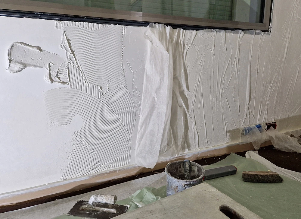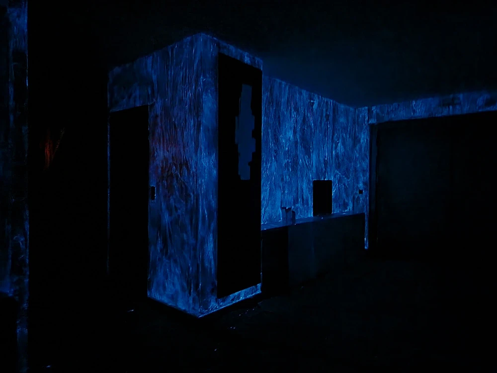 Voici des murs lumineux la nuit. Après avoir appliqué des papiers de soie qui ont laissé des plis volontaires, une patine photoluminescente a été raclée sur l’ensemble des murs afin de donner de la puissance de rémanence dans les creux les plus profonds.