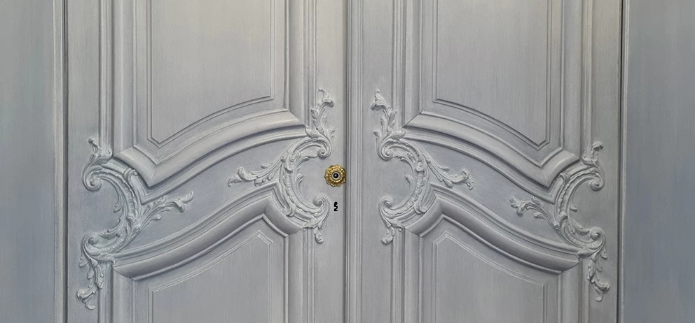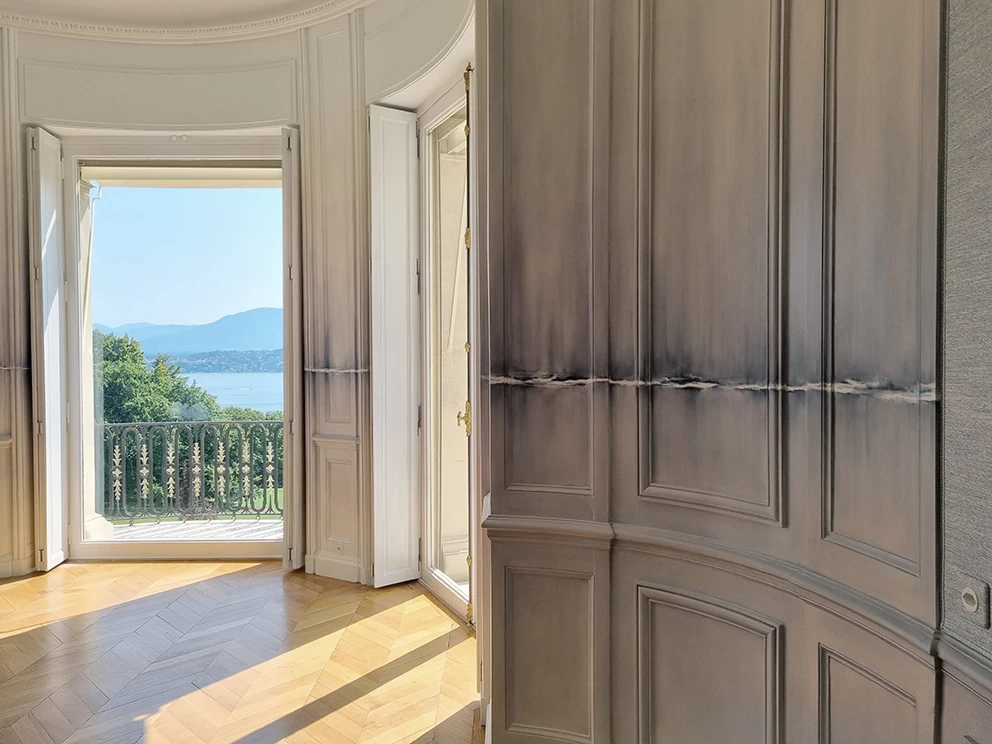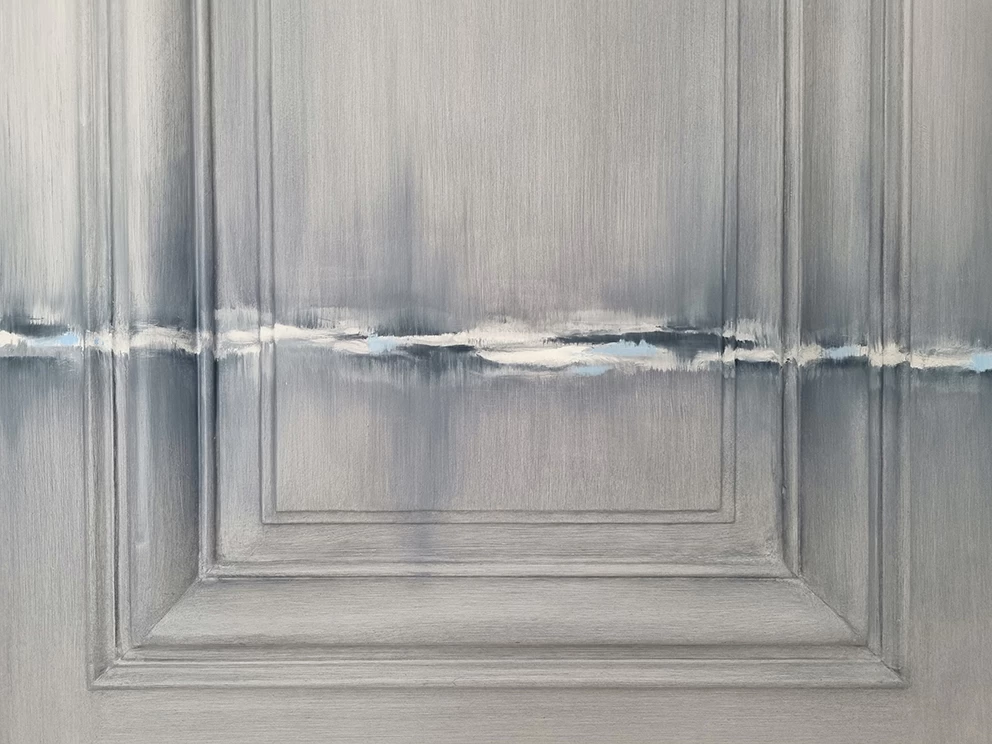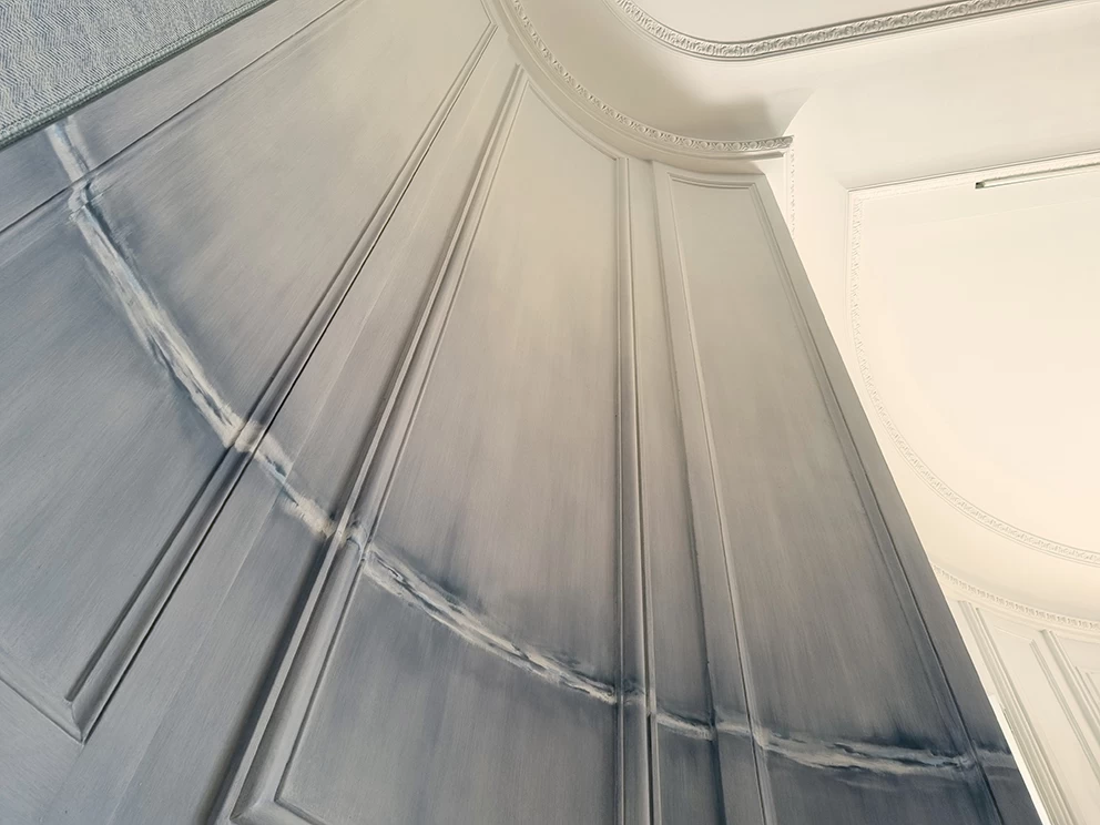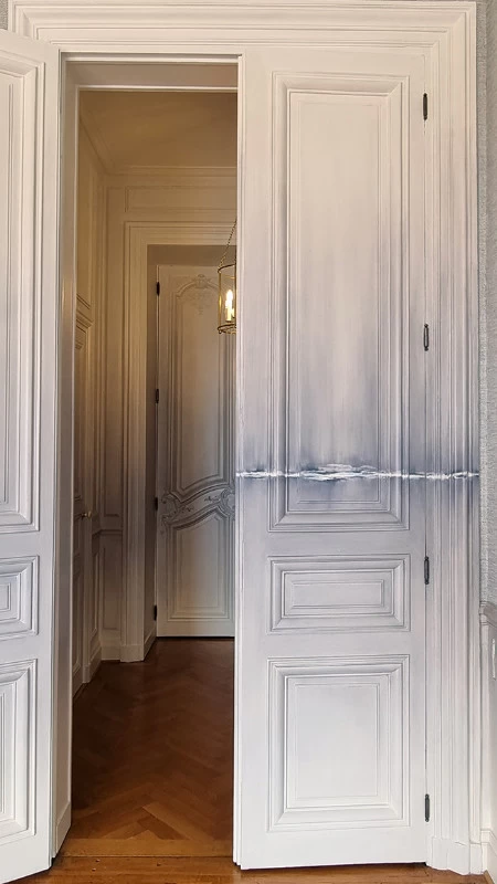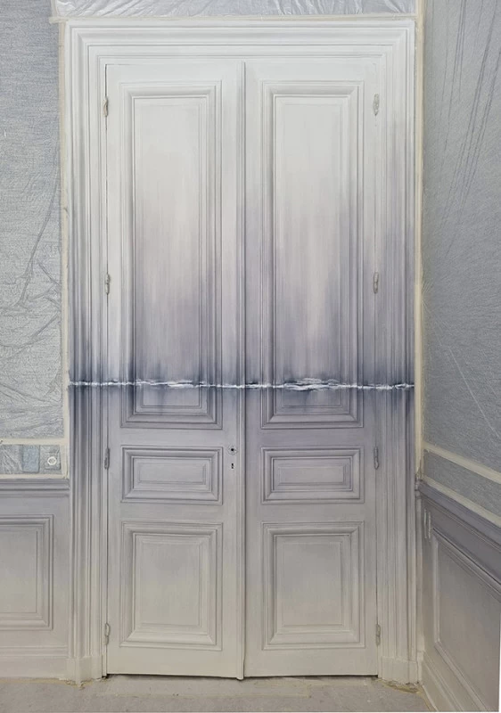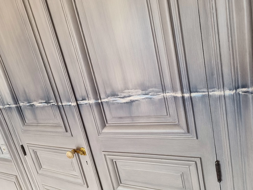 Ce décor reprend le principe des patines dégradées mais au lieu d’aller du haut vers le bas ou inversement, l‘idée était de créer une rupture à mi-hauteur ou chacun y voit ce qu’il imagine.