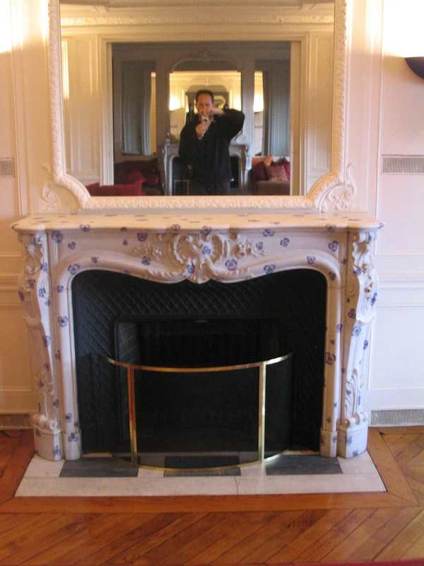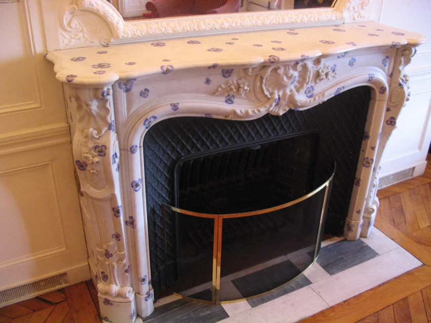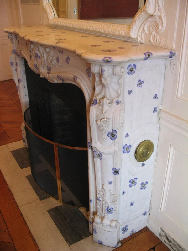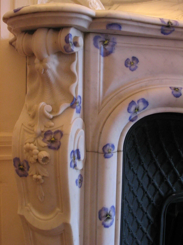 Réalisation sur la demande du décorateur d’intérieur Mr Patrick Hourcade, de petites "pensées" sur l’ensemble de la cheminée à même le marbre.