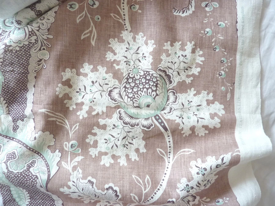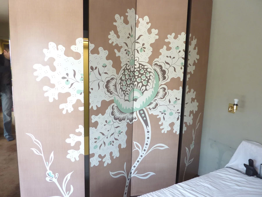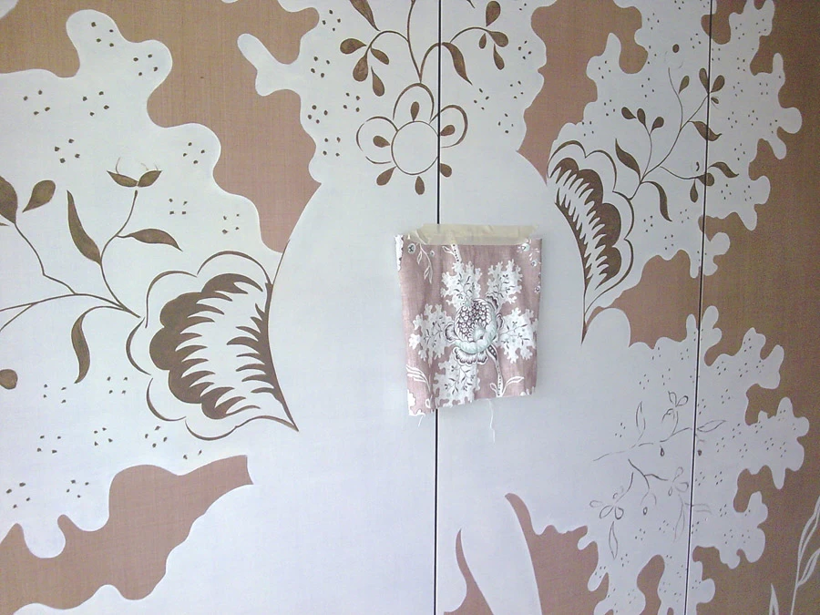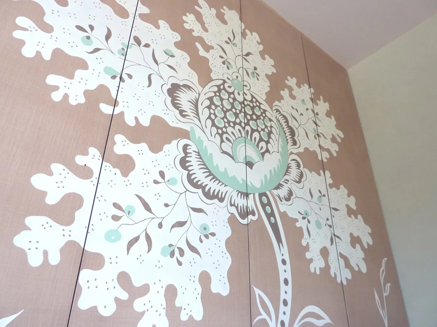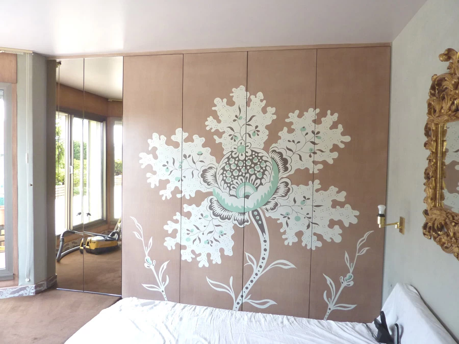 Réalisation d’une grande fleur sur 4 faces de portes de placard, d’après le motif d’un tissu existant dans la pièce. Les proportions et les teintes ont été respectées au plus près.