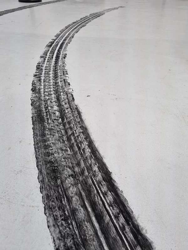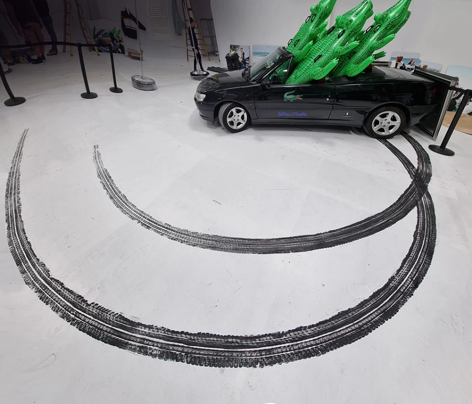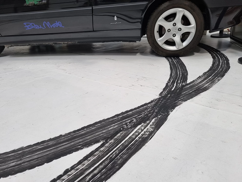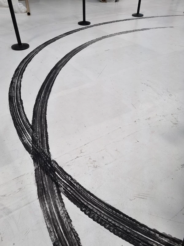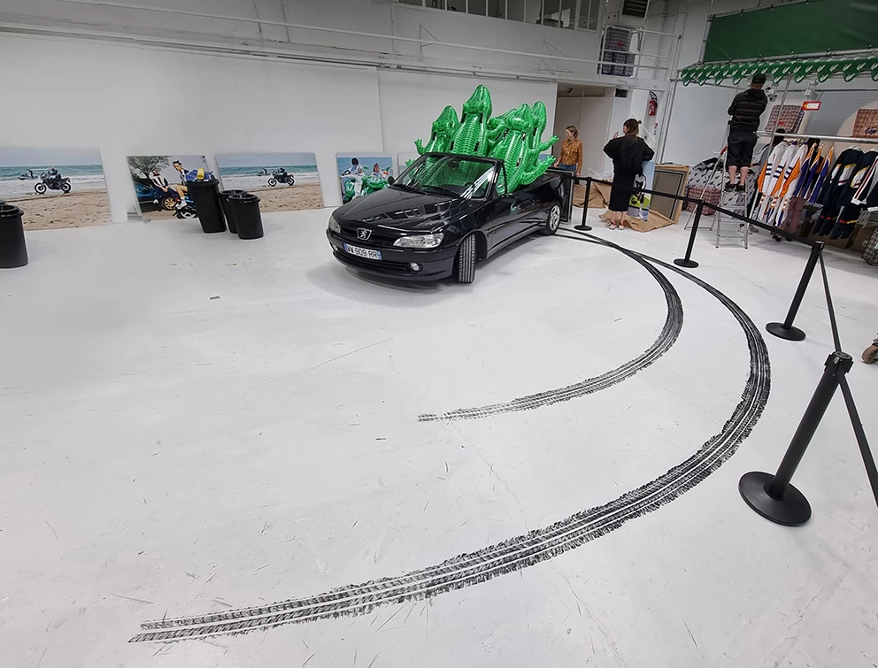 A l’occasion d’une rétrospective Lacoste, il m’a été demandé de reproduire les traces de pneu qu’une voiture aurait pu faire lors d’un grand dérapage. L’utilisation d’un pneu peint était évident mais pas si facile à mettre au point !
