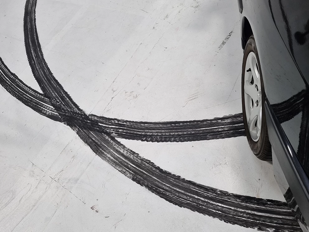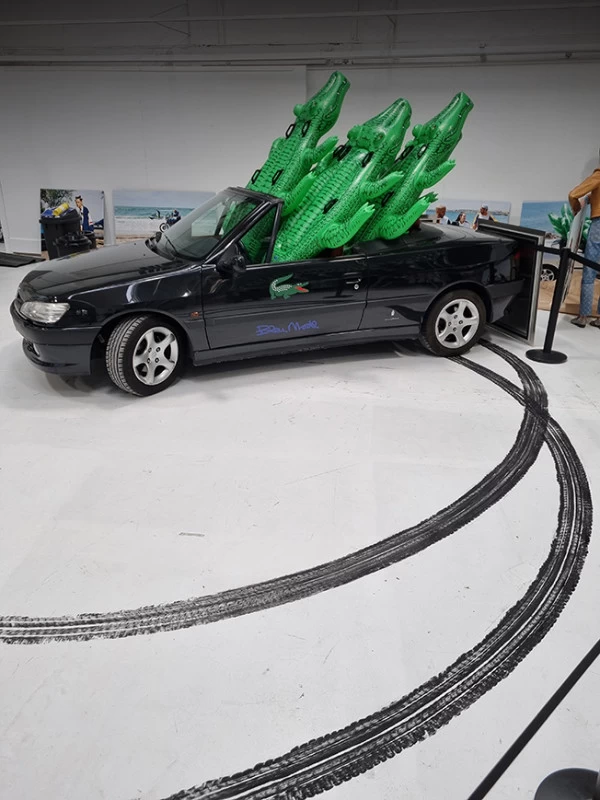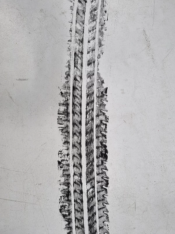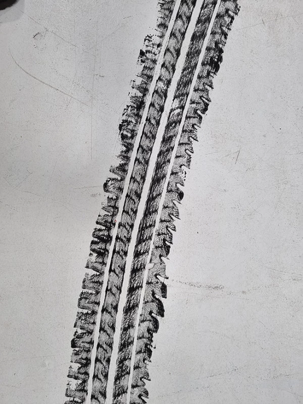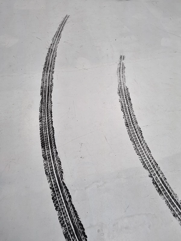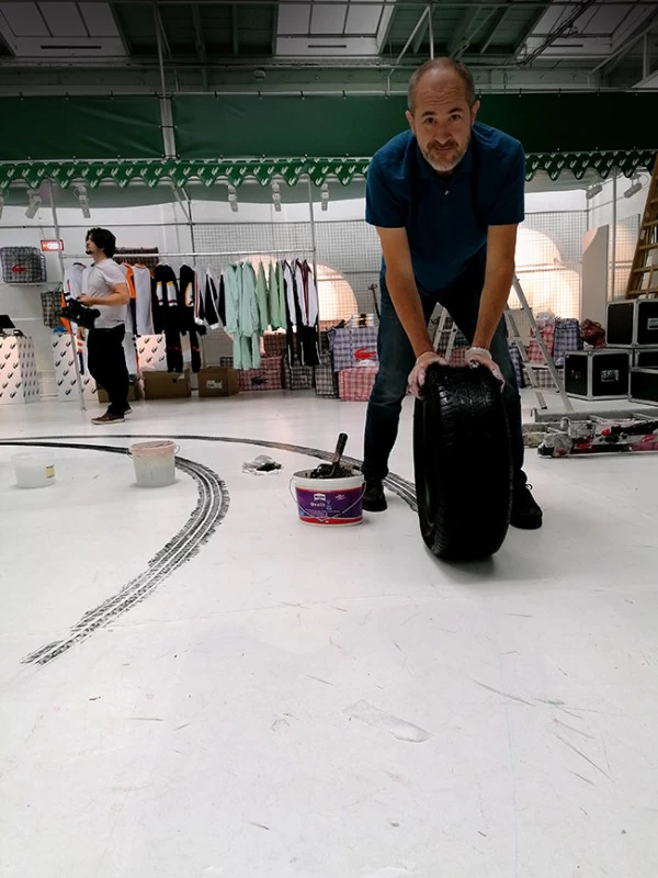 A l’occasion d’une rétrospective Lacoste, il m’a été demandé de reproduire les traces de pneu qu’une voiture aurait pu faire lors d’un grand dérapage. L’utilisation d’un pneu peint était évident mais pas si facile à mettre au point !