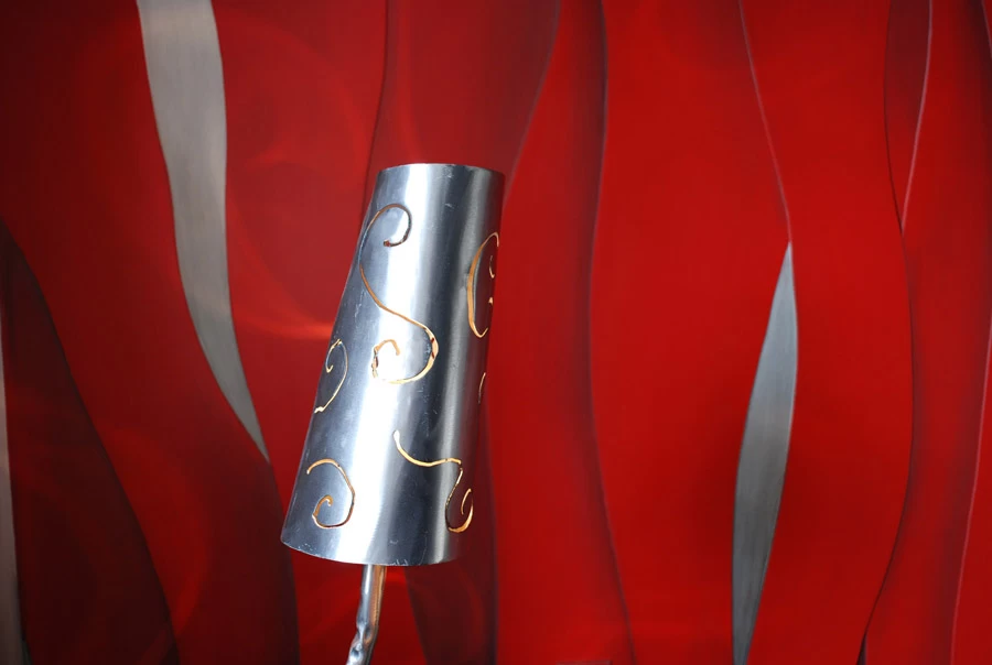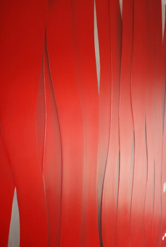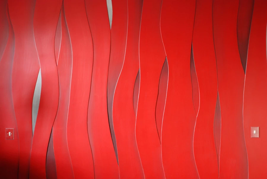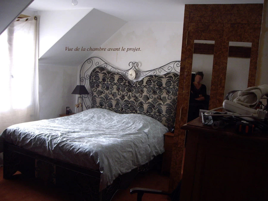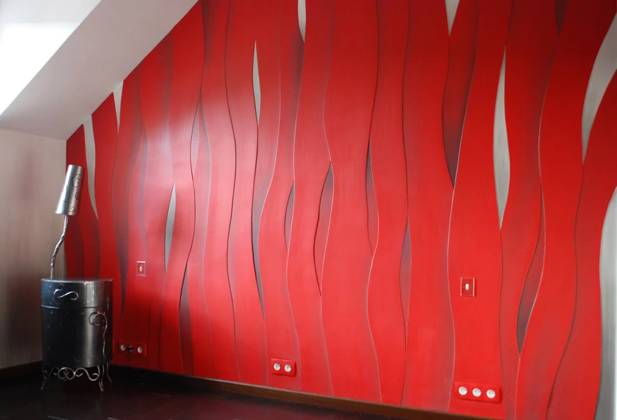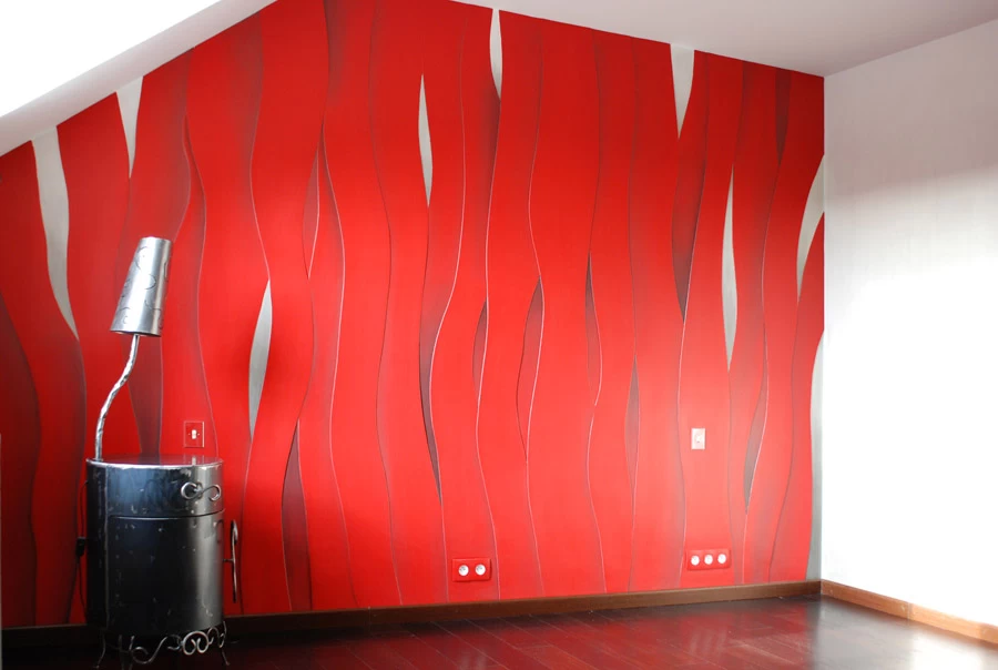 Voici une chambre dont les murs ont été traités avec des épaisseurs d’enduits représentant des bandes qui se chevauchent mutuellement. Sur l’ensemble, réalisation de quelques ombrages légèrement noircies sur la teinte générale rouge. Le reste de la pièce à été traité avec une patine cordée grise en dégradée.