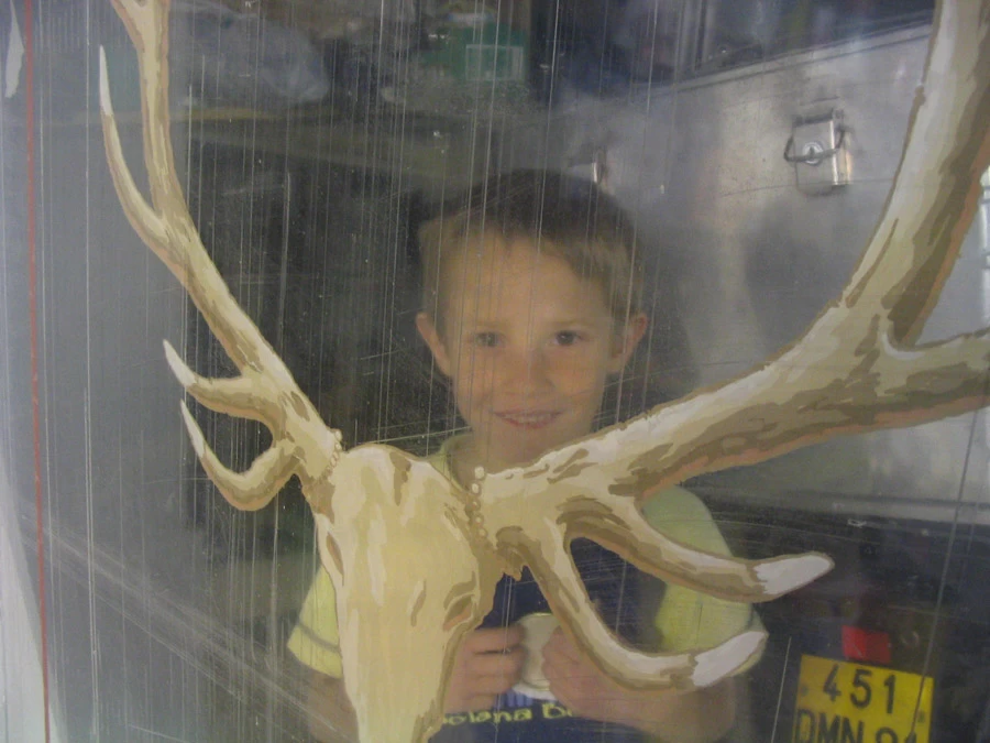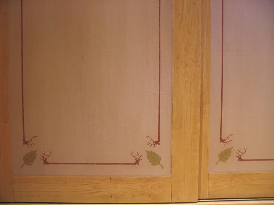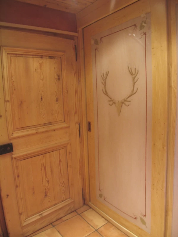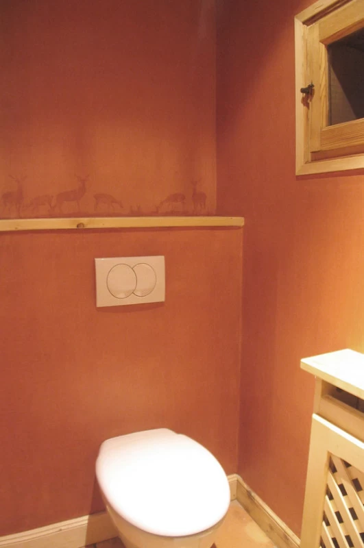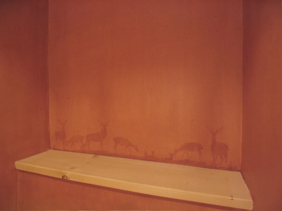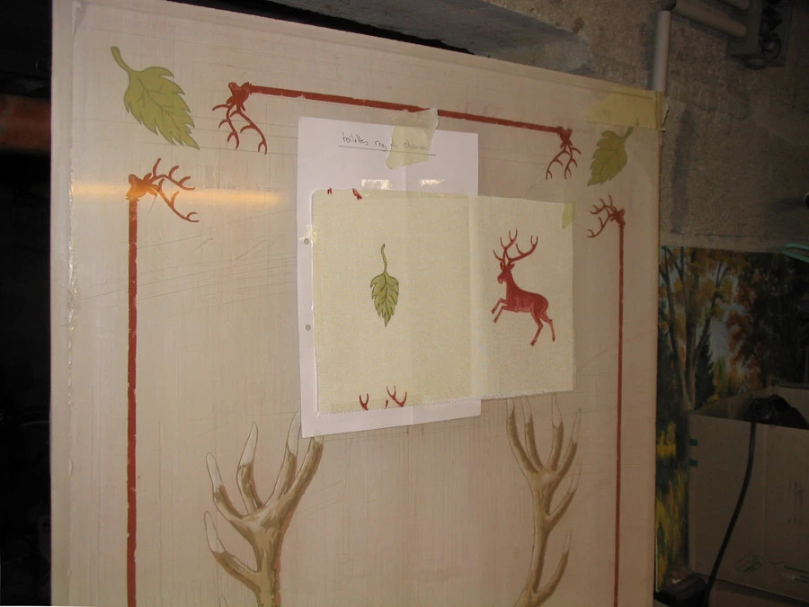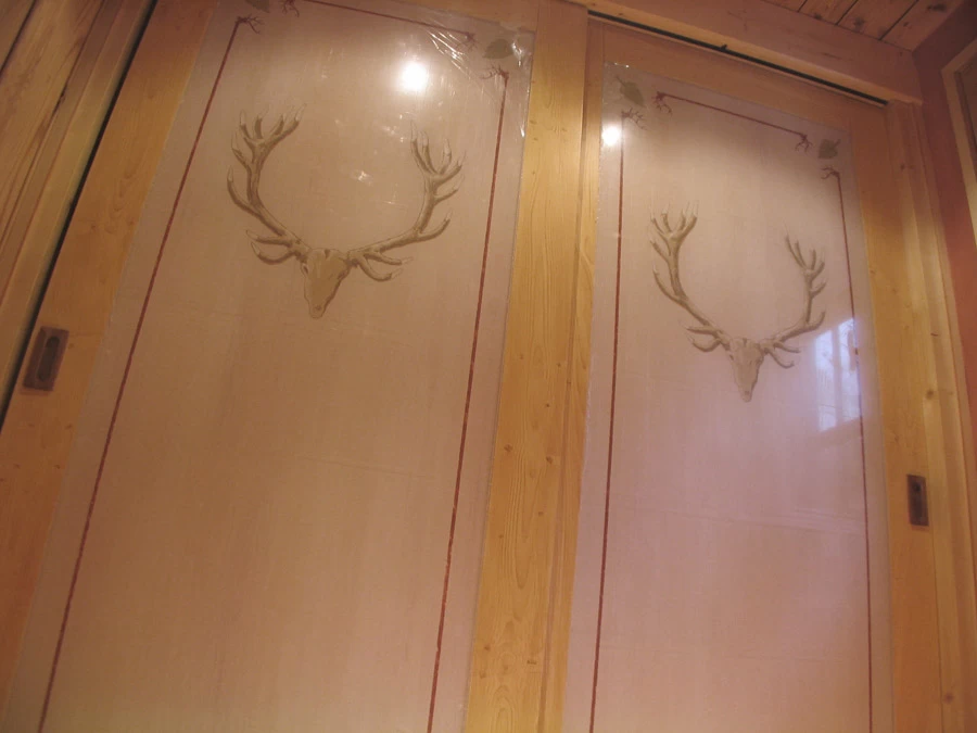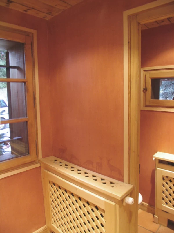 Voici des motifs peints en négatif au dos des feuilles de plexi d’après les dessins des rideaux. Une patine et quelques pochoirs dans des tons ocre rouge pour finaliser ce petit cabinet de toilette. (A noter que le film plastique protecteur n'était pas encore enlevé.)