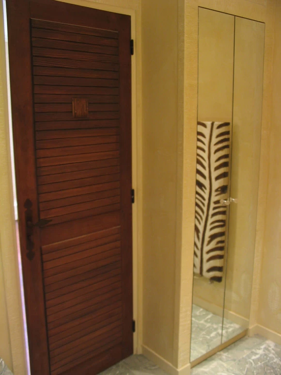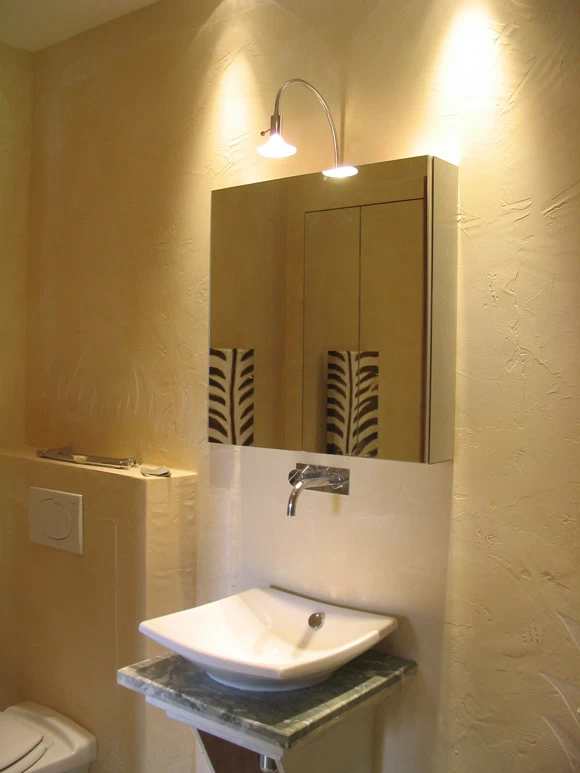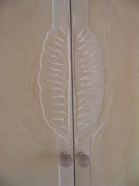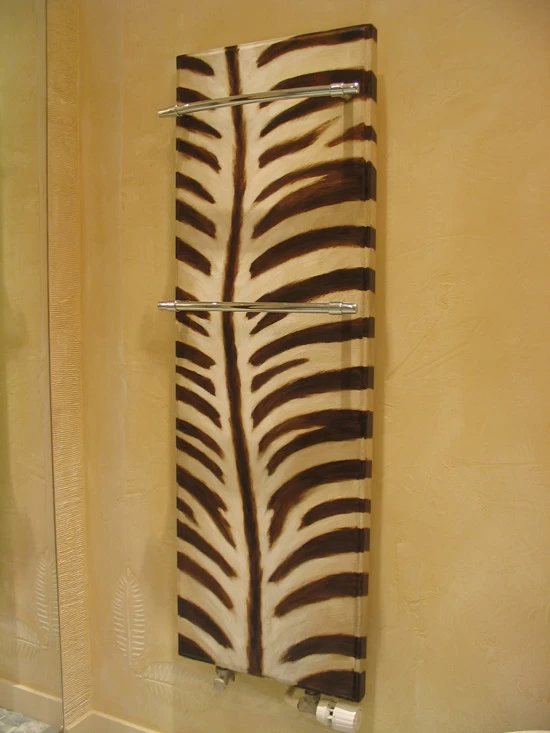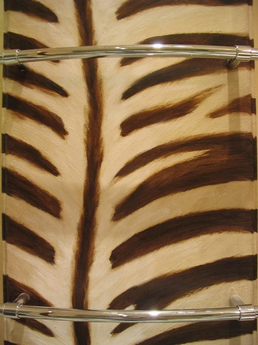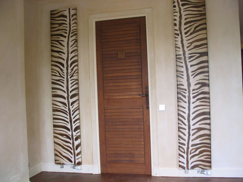 Réalisation sur les murs d’un enduit taloché patiné avec un système de panneautage tout hauteur et des angles en forme de feuille le tout en relief. Les portes sont un mélange de vrai et faux bois avec un petit carré de bambous incrustés dans le centre. Les radiateurs ont reçu une matière en relief puis une coloration à l’huile afin de donner l’illusion d’une peau de zèbre.