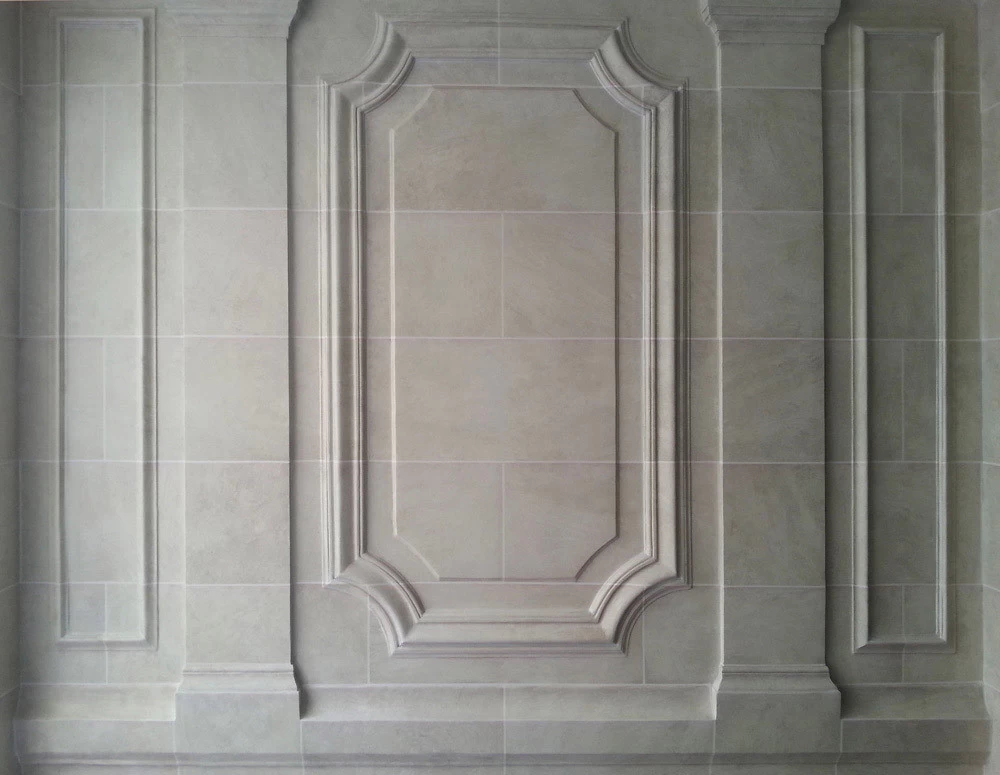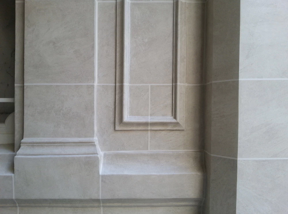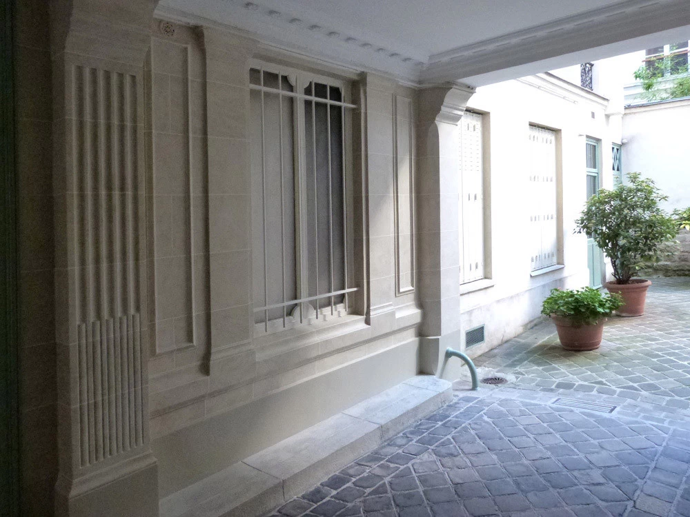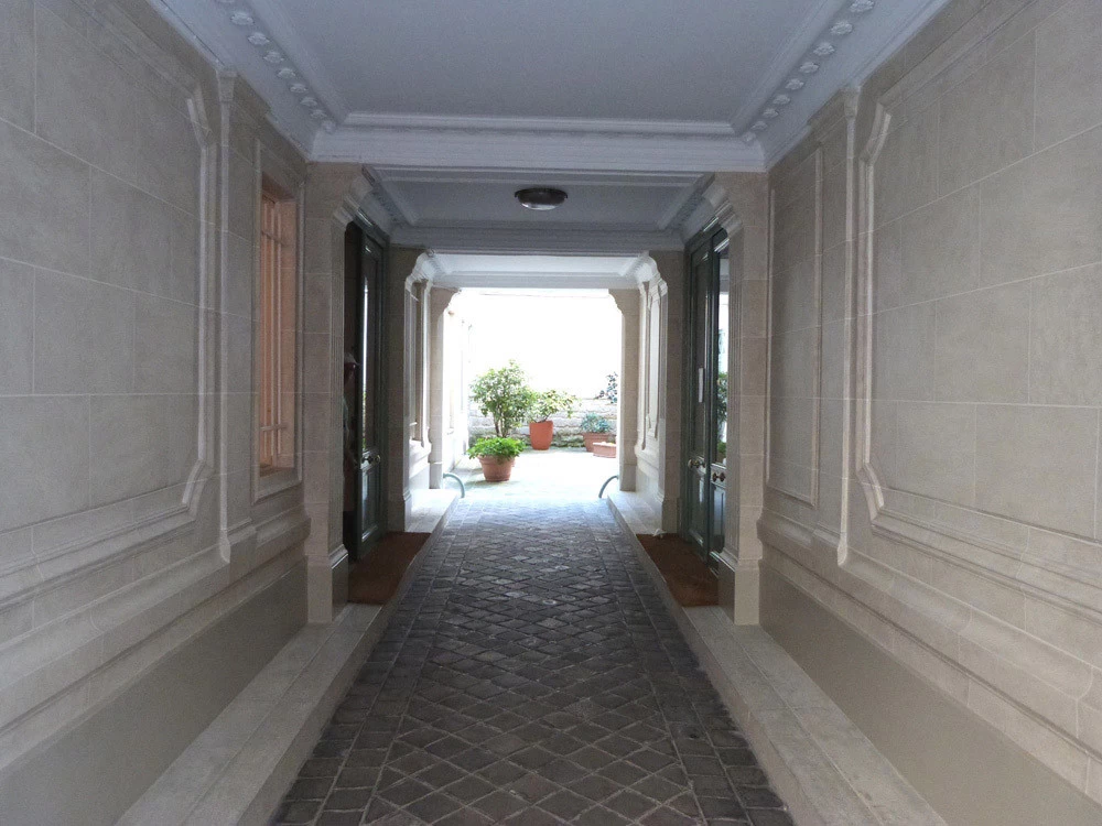 Dans un passage cocher mouluré et très bien proportionné, réalisation d’une imitation de fausse pierre de taille et ses coupes de joints. Technique très classique et ancestrale des peintres en décor datant de l’époque Haussmannienne. Seuls les joints sont marqués par adhésifs aujourd’hui et non plus par filage au pinceau et à la règle.