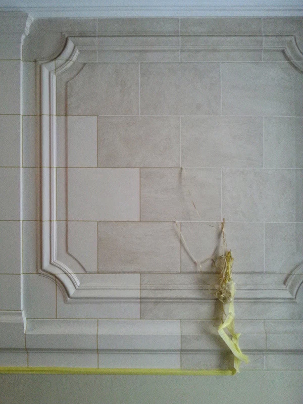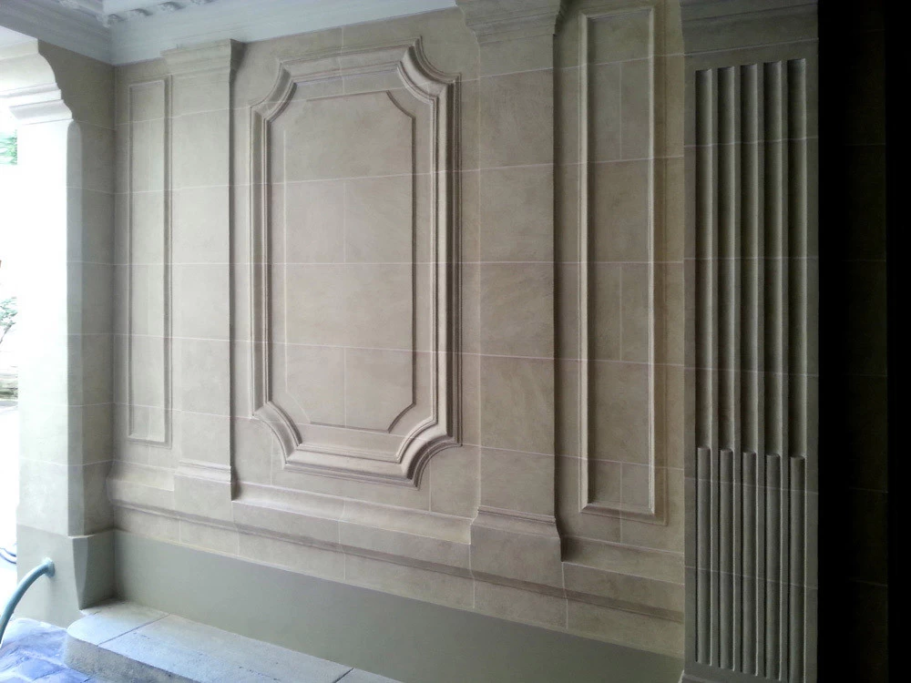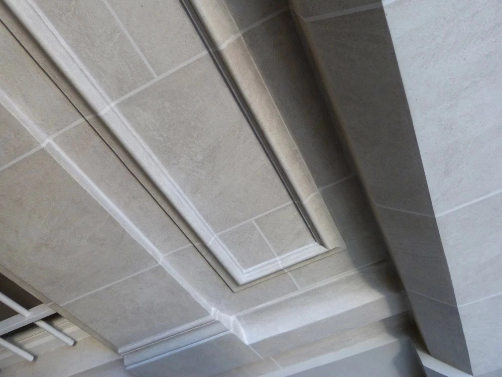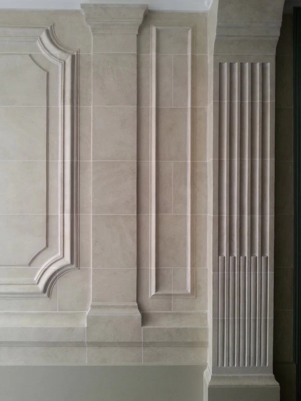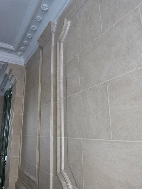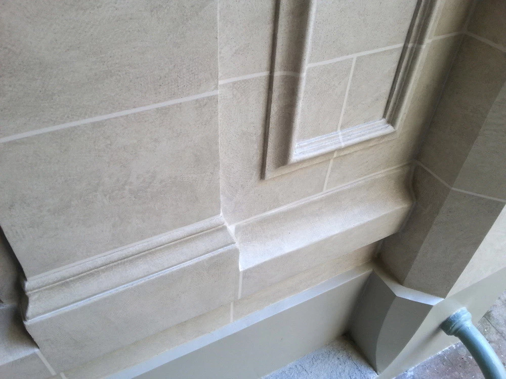Dans un passage cocher mouluré et très bien proportionné, réalisation d’une imitation de fausse pierre de taille et ses coupes de joints. Technique très classique et ancestrale des peintres en décor datant de l’époque Haussmannienne. Seuls les joints sont marqués par adhésifs aujourd’hui et non plus par filage au pinceau et à la règle.