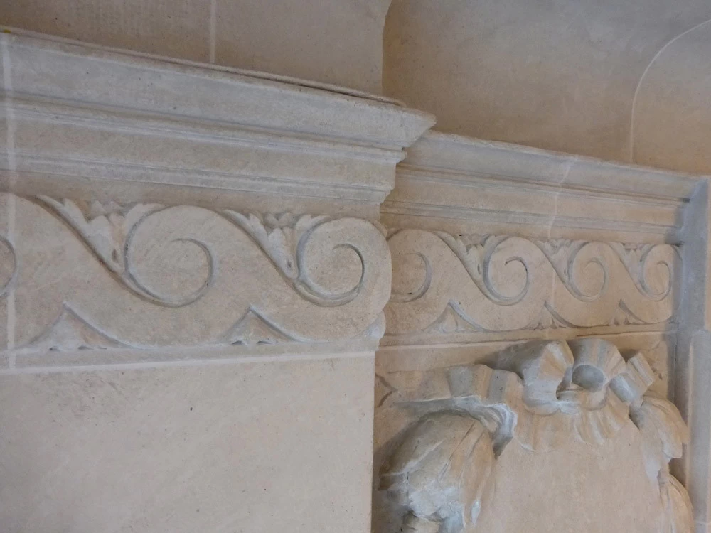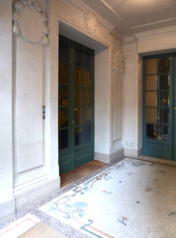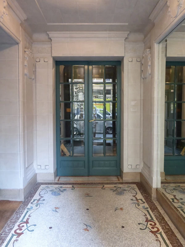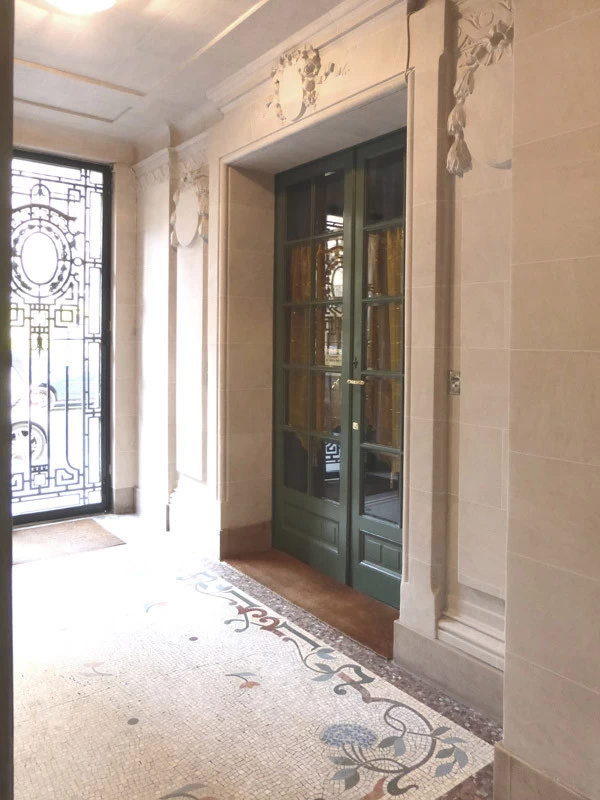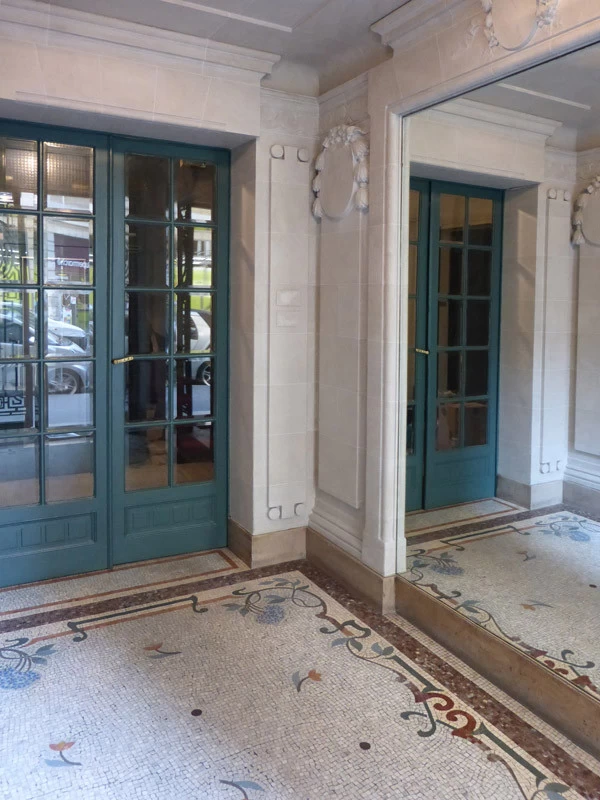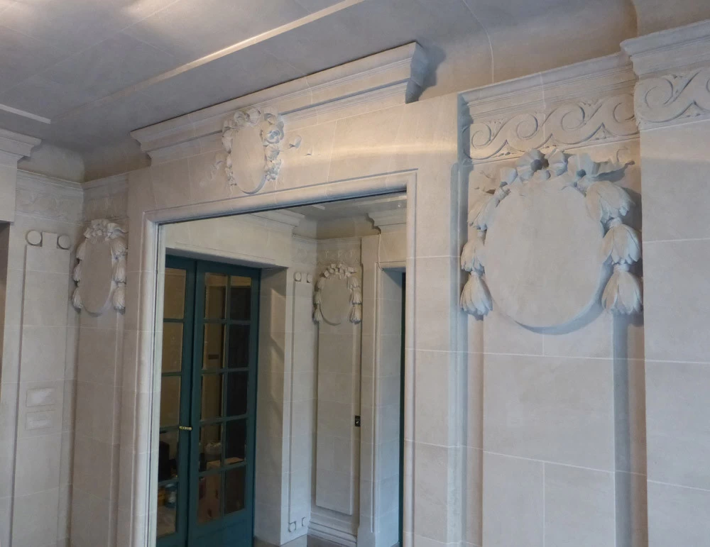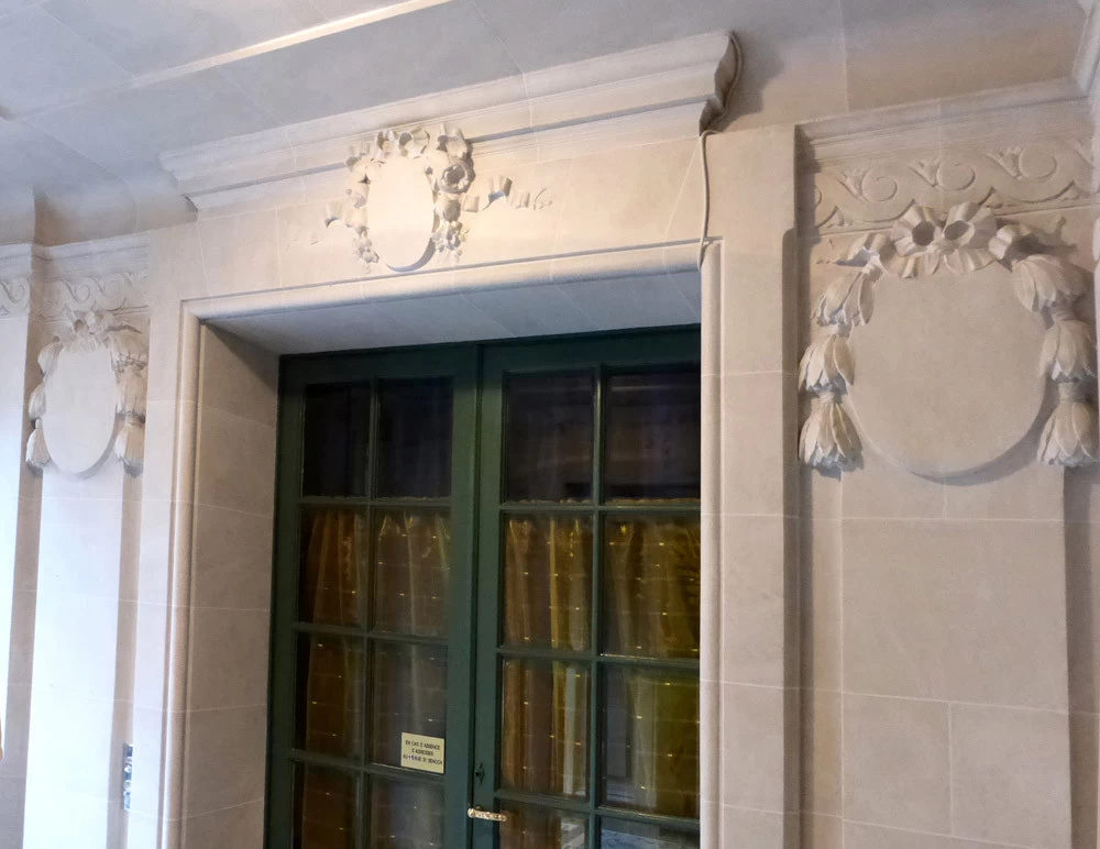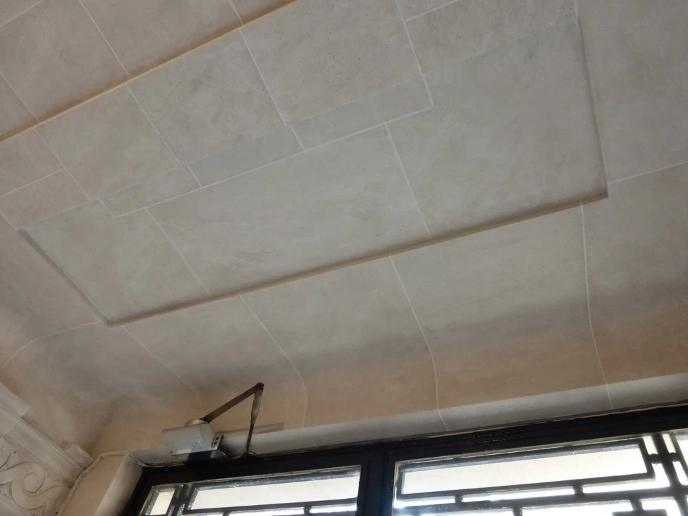 Voici une petite entrée très ornementée. Sale et noircie par le temps, les enduits sablés/jointés étaient trop poreux pour être nettoyés. La peinture décorative a permis d’éclaircir l’entrée tout en la rendant lessivable dans le temps.