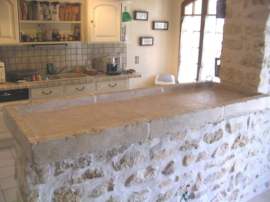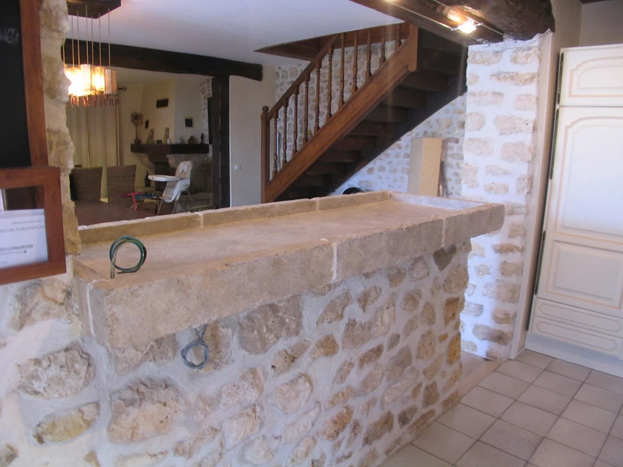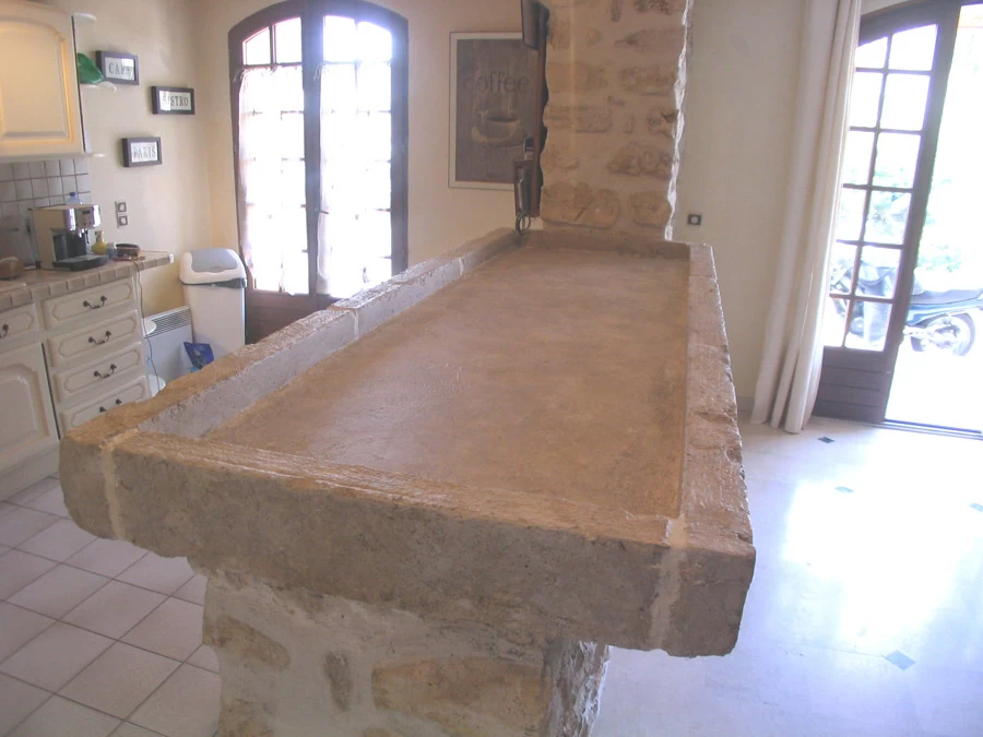 Après le moulage de cette dalle de béton, j’ai creusé des faux joints au marteau et burin. L’ensemble à été patiné en soit disant « pierre de bourgogne » d’après le vitrier qui est venu prendre les mesures de la future vitre. C’est se baissant et en regardant dessous qu’il a pu découvrir que c’était bien du béton !! Nous le pardonnons. Le décaissement de cette dalle permet d’y mettre de la décoration sachant que l’électricité y est prévue.