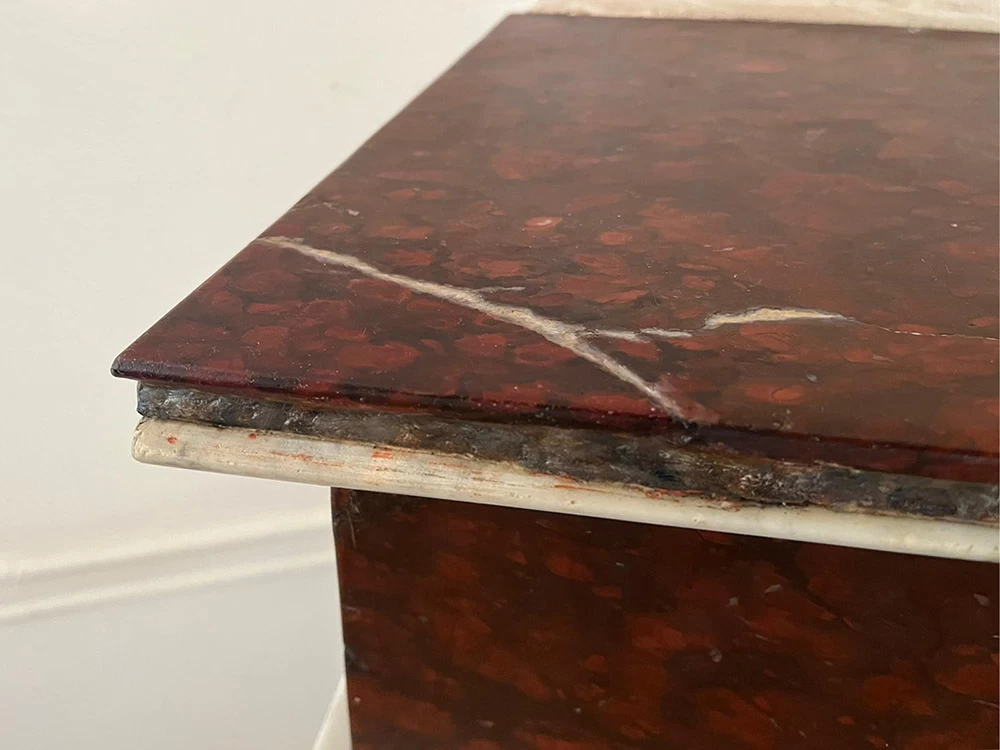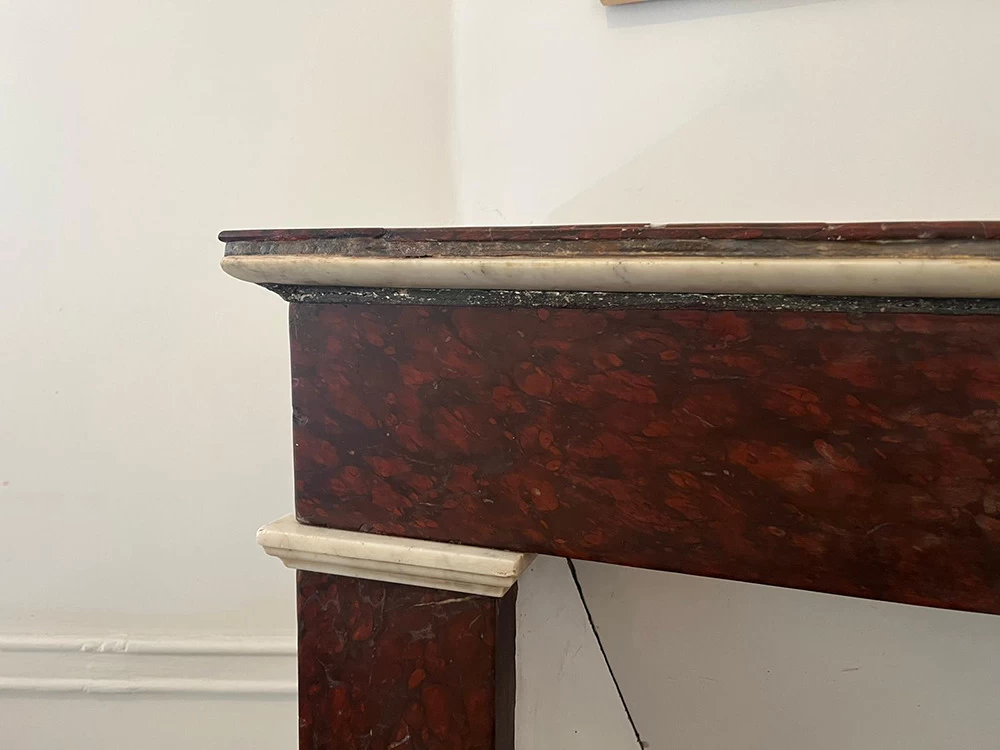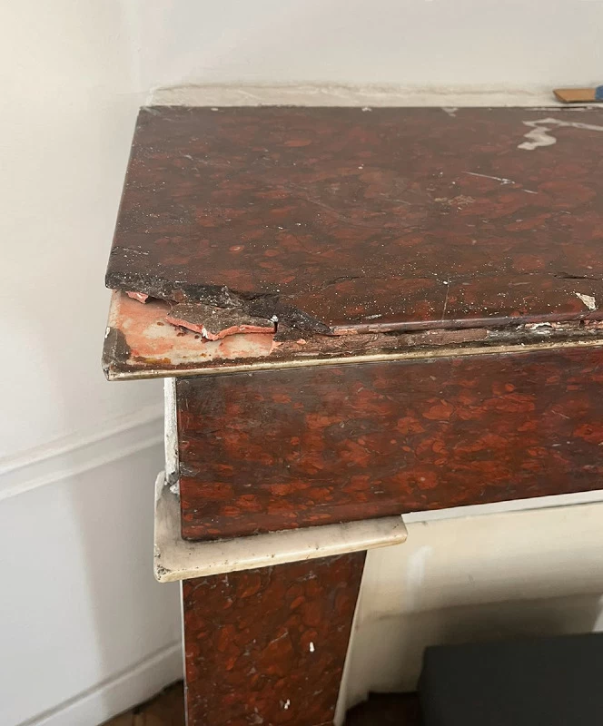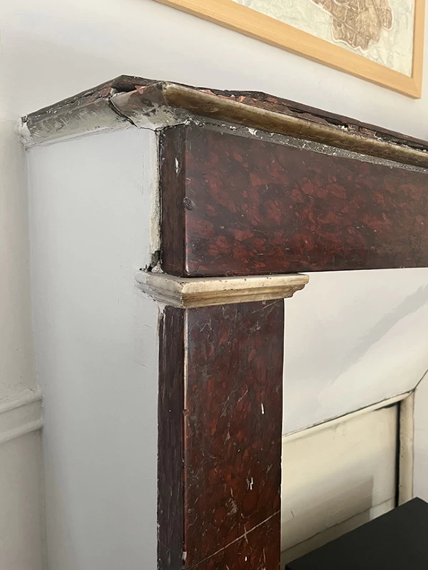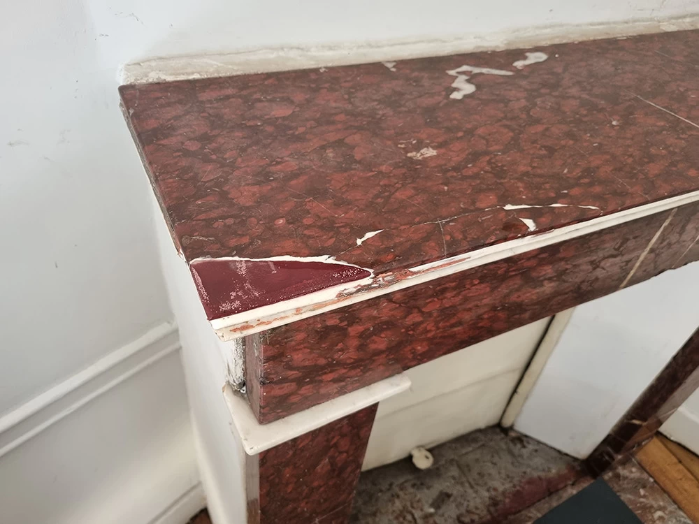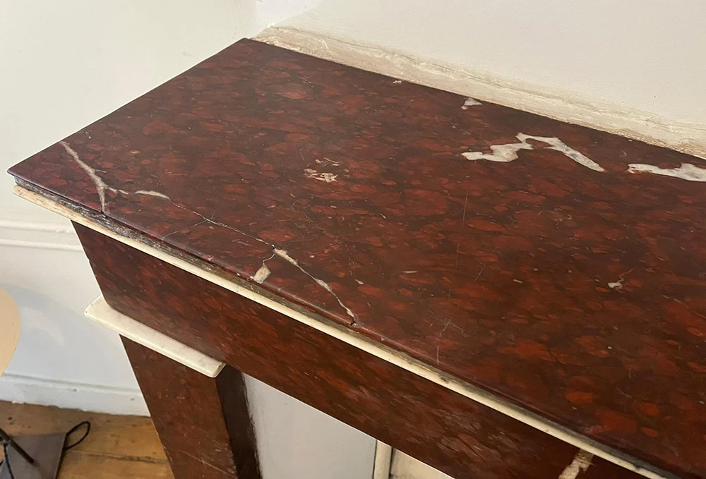 Cette ancienne cheminée en « Griotte », tel est le nom de ce marbre, avait reçu un mauvais coup sur son angle. Une pièce en résine a été coulée pour s’adapter au mieux au manque tout en conservant une certaine solidité. Pour finir, j’ai imité la Griotte et l’ai raccordée avec la vraie. Bien sûr la cheminée a été intégralement nettoyée afin de retrouver une intensité de couleur.