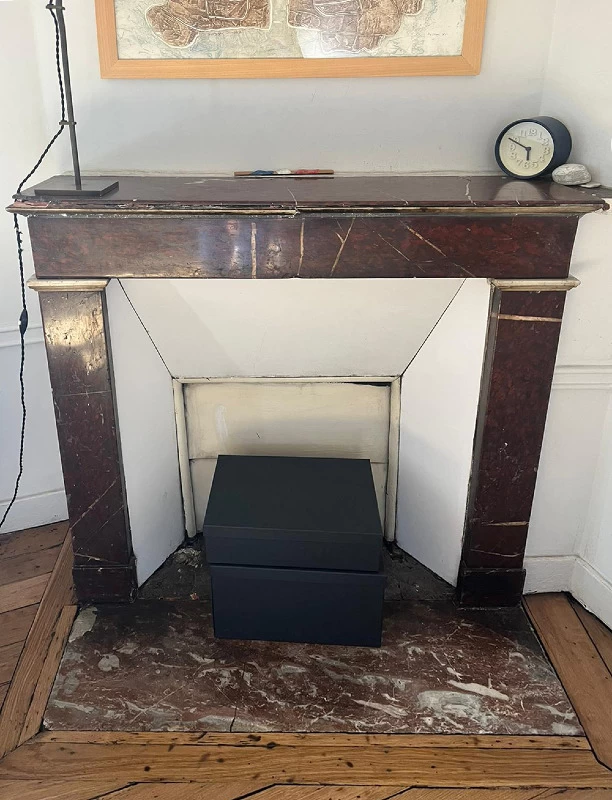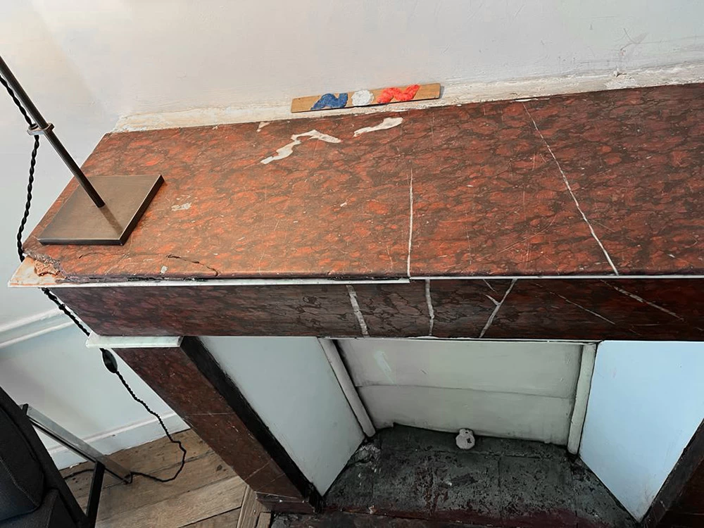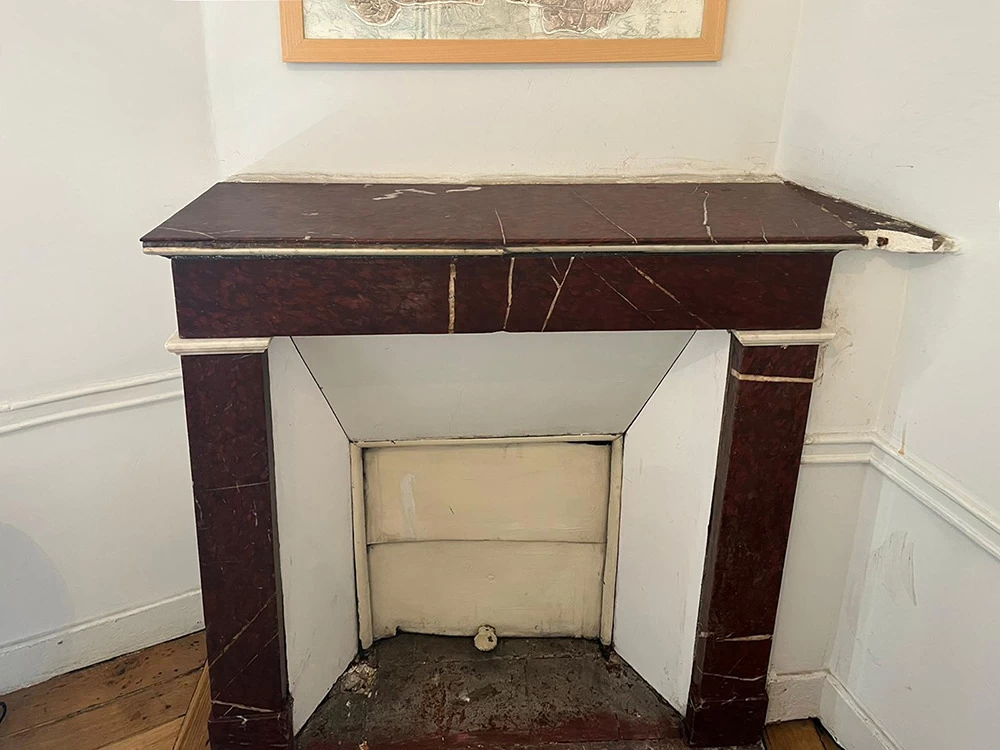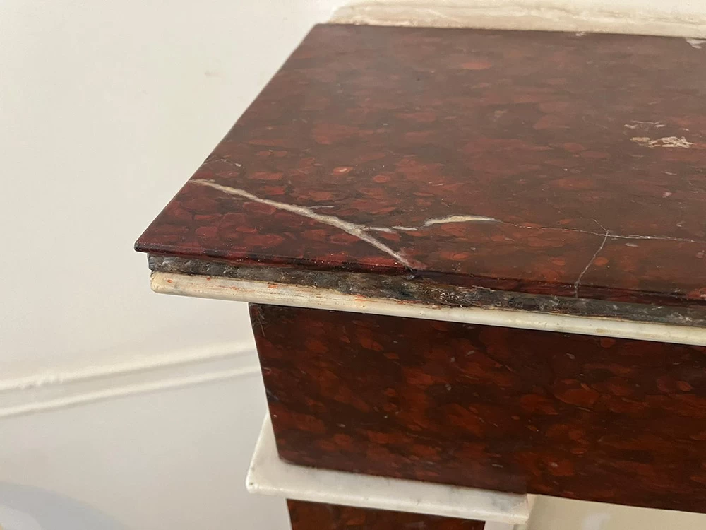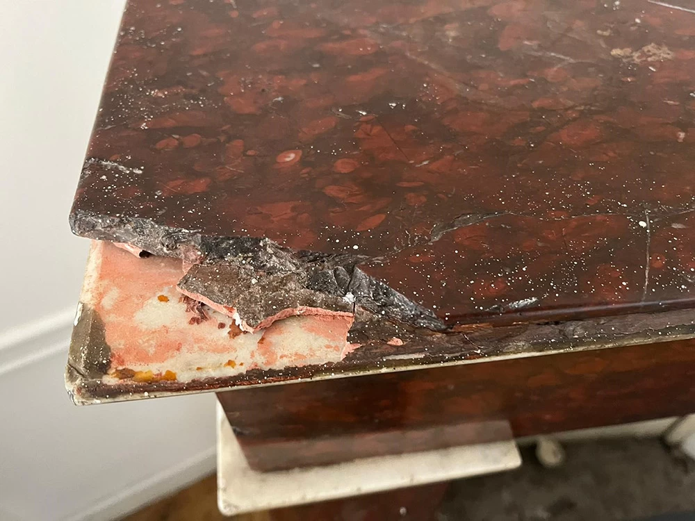 Cette ancienne cheminée en « Griotte », tel est le nom de ce marbre, avait reçu un mauvais coup sur son angle. Une pièce en résine a été coulée pour s’adapter au mieux au manque tout en conservant une certaine solidité. Pour finir, j’ai imité la Griotte et l’ai raccordée avec la vraie. Bien sûr la cheminée a été intégralement nettoyée afin de retrouver une intensité de couleur.