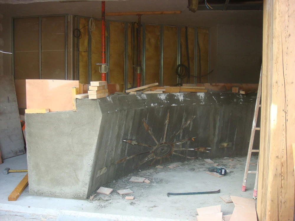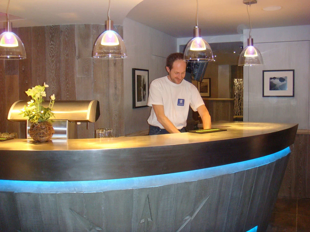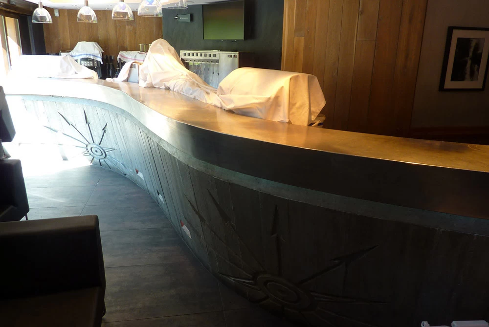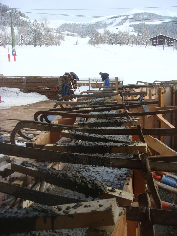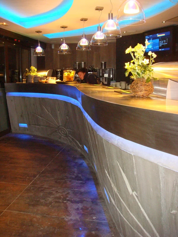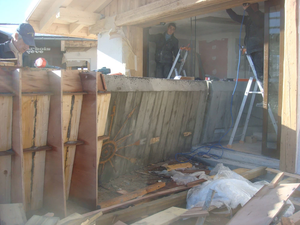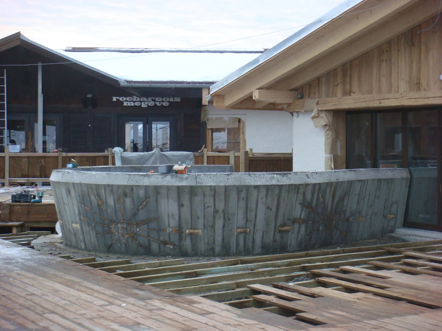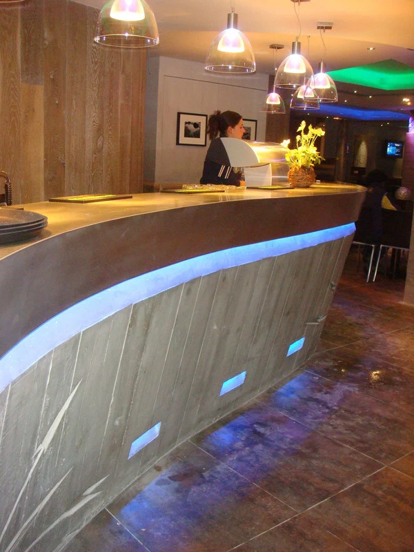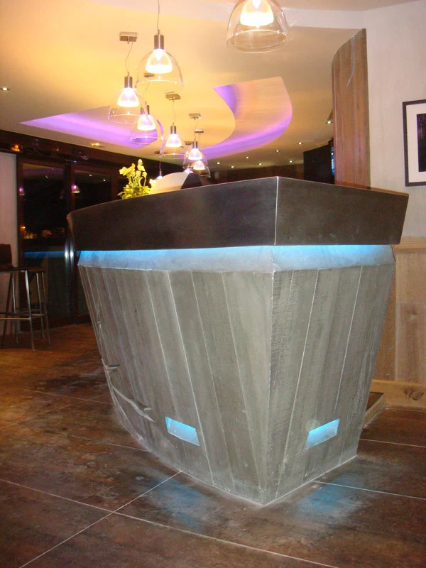 Voici un bar intérieur/extérieur de restaurant d’altitude pouvant accueillir entre 800 et 1200 couverts chaque midi en haute saison de ski. Un énorme travail de charpentier fut nécessaire à la constitution du coffrage. Deux toupies de béton ont permis son remplissage. D’après une implantation imposée et prévue sur plan, mon rôle fut de trouver un design et les matières (béton/zinc). Malgré un évasement important sur le haut du bar, la base ne repose que sur 5 cm de large. La pression est énorme sur le bas et son équilibre n’est dû qu’à son implantation sinueuse. Beaucoup d’hommes ont été nécessaires à cette création réalisée dans des conditions météo neigeuse très difficiles. Félicitations à tous.
