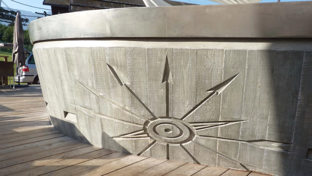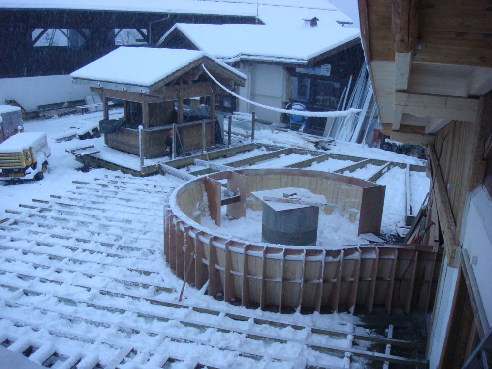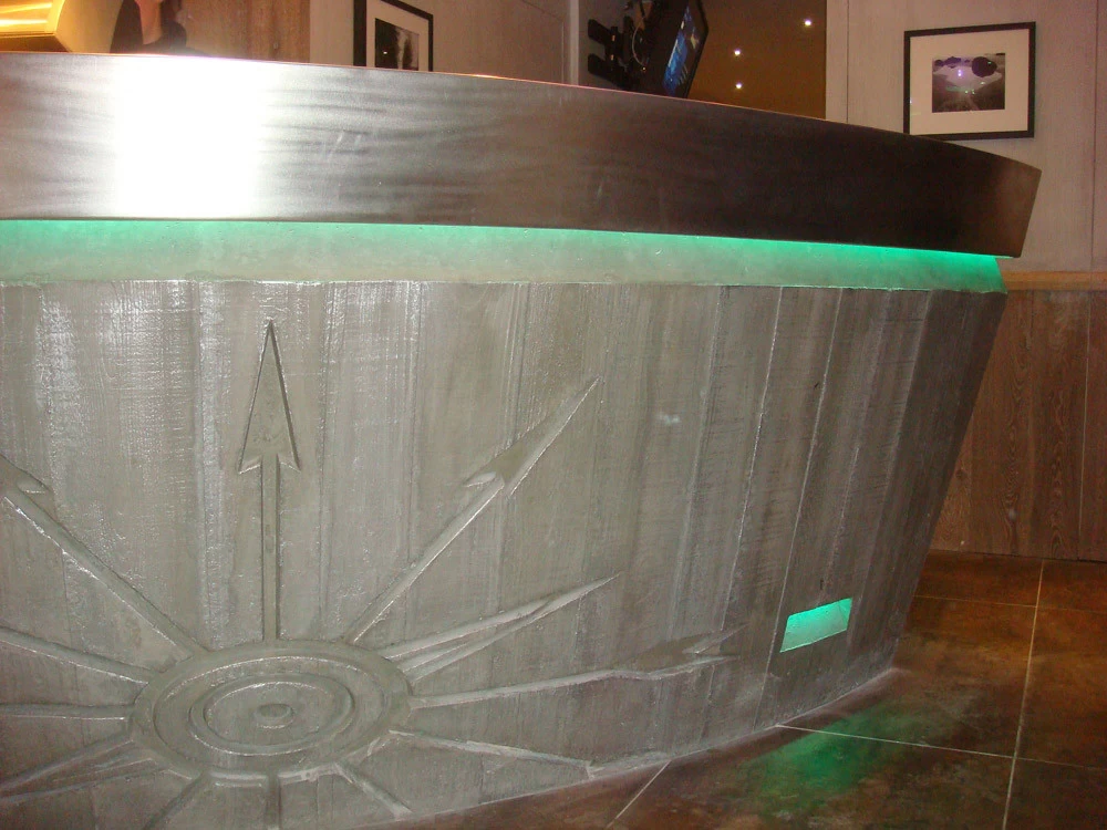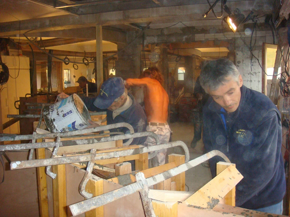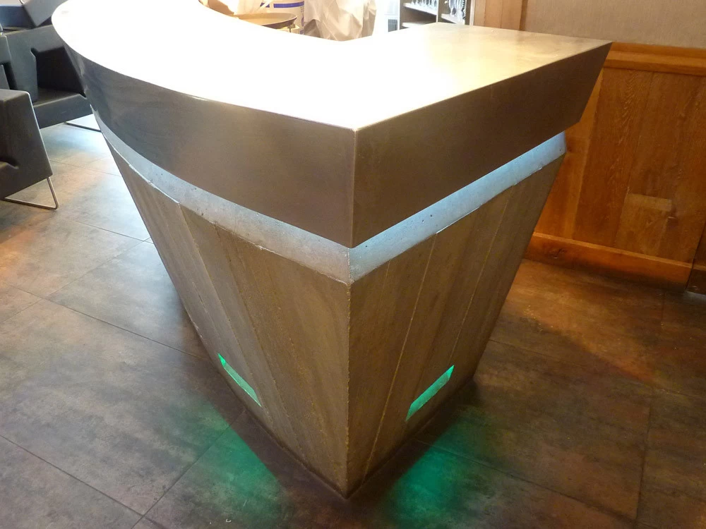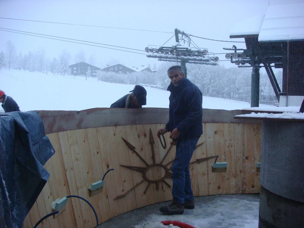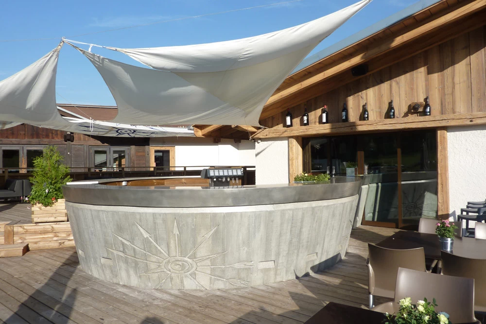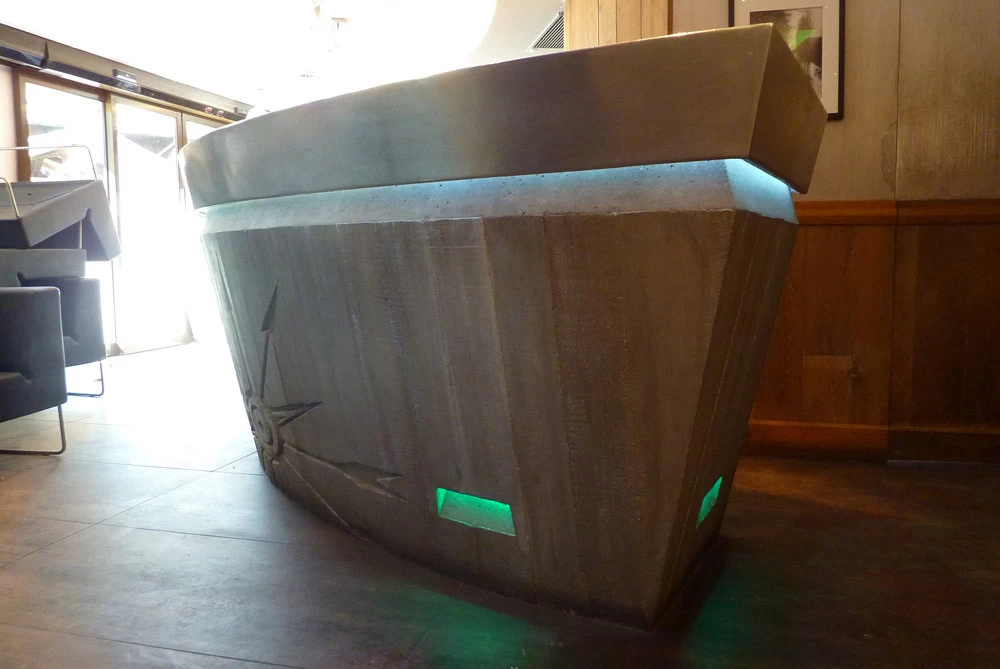 Voici un bar intérieur/extérieur de restaurant d’altitude pouvant accueillir entre 800 et 1200 couverts chaque midi en haute saison de ski. Un énorme travail de charpentier fut nécessaire à la constitution du coffrage. Deux toupies de béton ont permis son remplissage. D’après une implantation imposée et prévue sur plan, mon rôle fut de trouver un design et les matières (béton/zinc). Malgré un évasement important sur le haut du bar, la base ne repose que sur 5 cm de large. La pression est énorme sur le bas et son équilibre n’est dû qu’à son implantation sinueuse. Beaucoup d’hommes ont été nécessaires à cette création réalisée dans des conditions météo neigeuse très difficiles. Félicitations à tous.