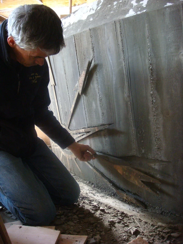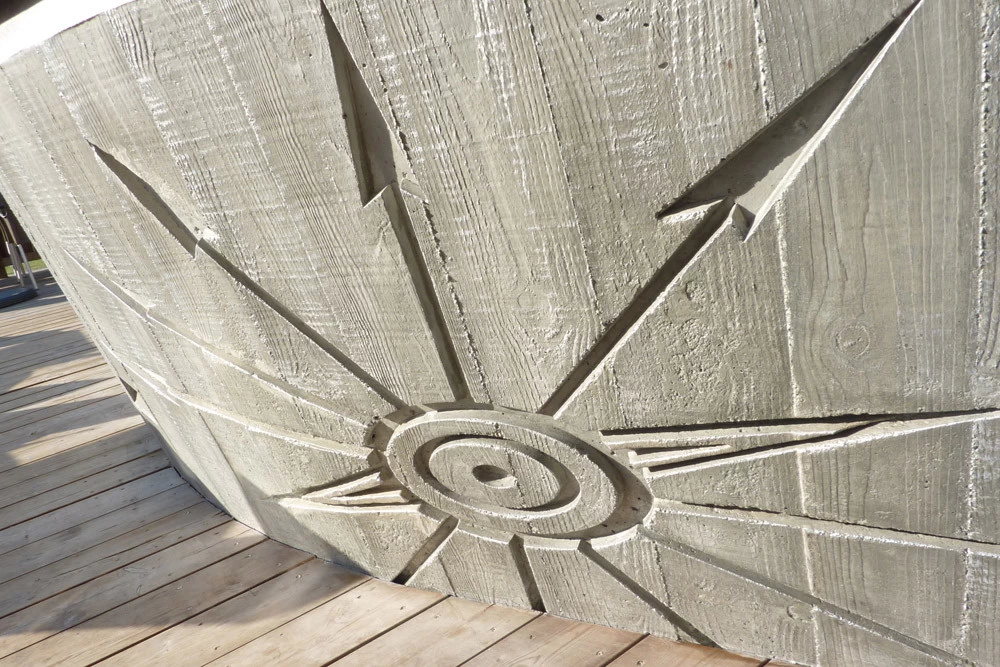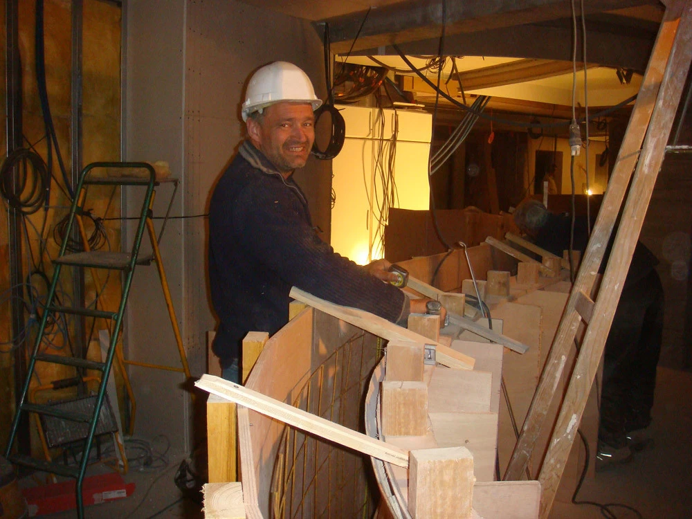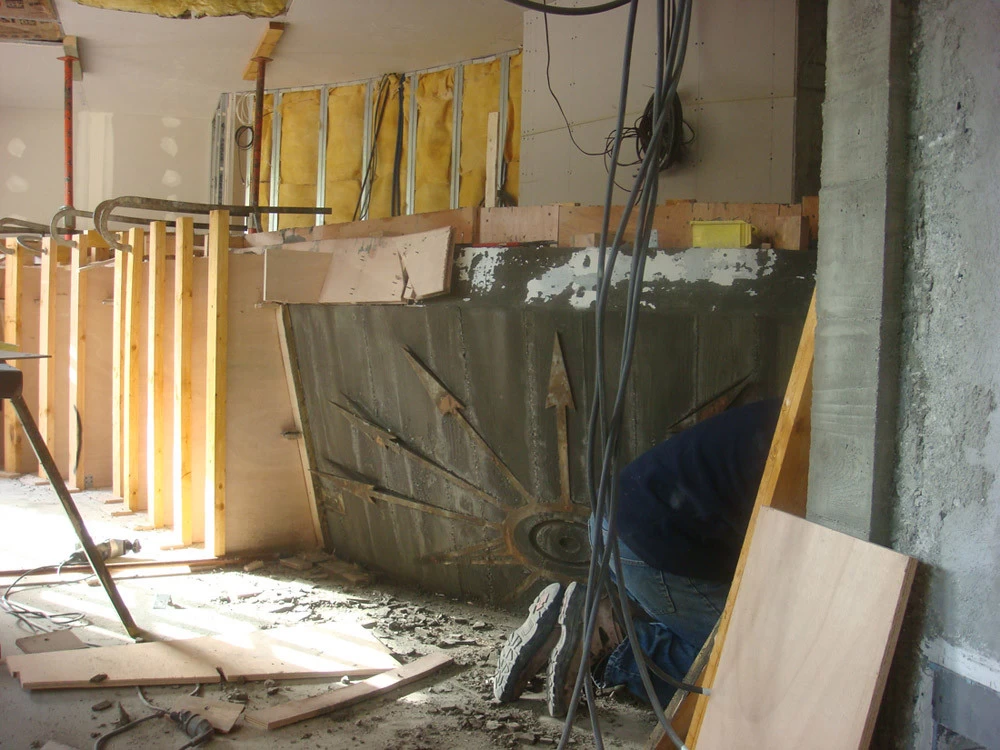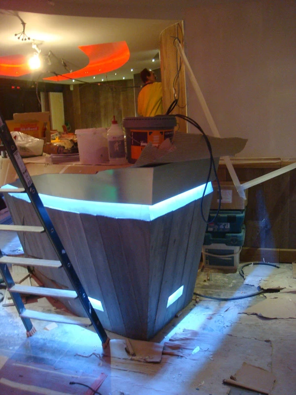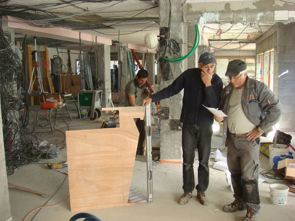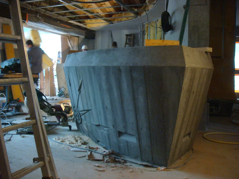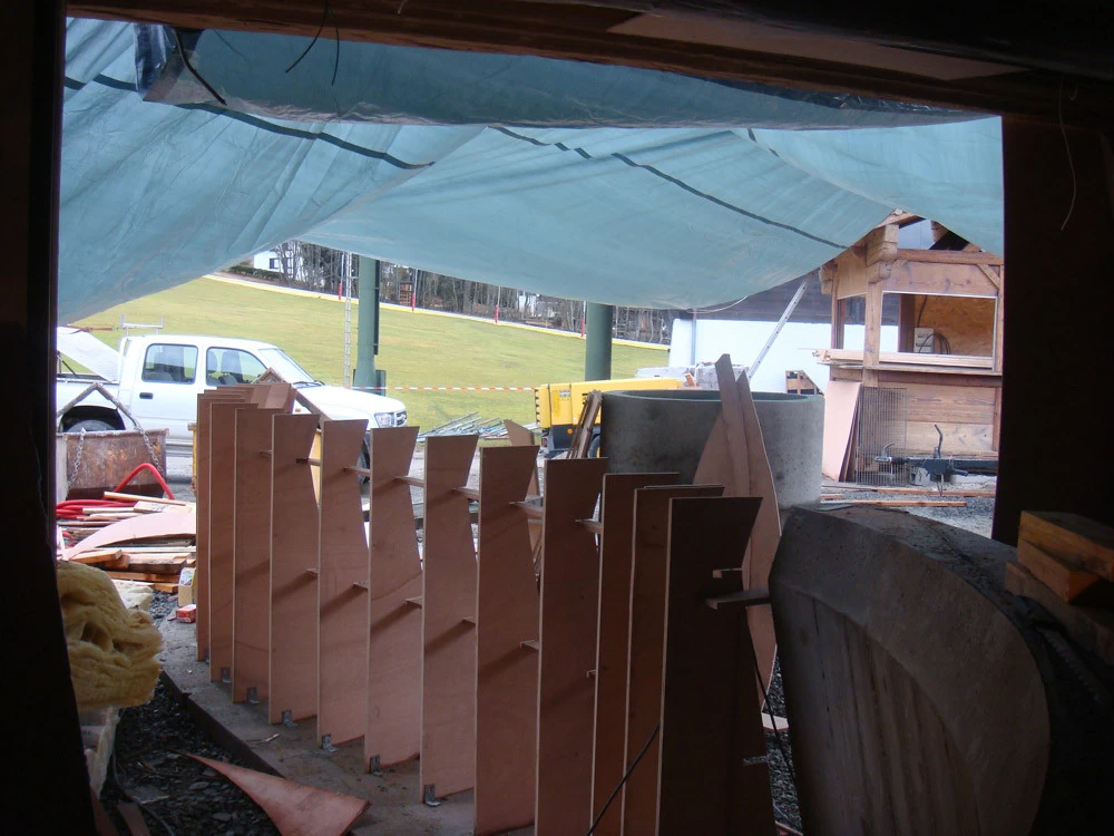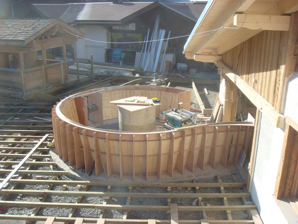 Voici un bar intérieur/extérieur de restaurant d’altitude pouvant accueillir entre 800 et 1200 couverts chaque midi en haute saison de ski. Un énorme travail de charpentier fut nécessaire à la constitution du coffrage. Deux toupies de béton ont permis son remplissage. D’après une implantation imposée et prévue sur plan, mon rôle fut de trouver un design et les matières (béton/zinc). Malgré un évasement important sur le haut du bar, la base ne repose que sur 5 cm de large. La pression est énorme sur le bas et son équilibre n’est dû qu’à son implantation sinueuse. Beaucoup d’hommes ont été nécessaires à cette création réalisée dans des conditions météo neigeuse très difficiles. Félicitations à tous.