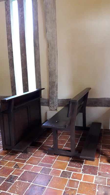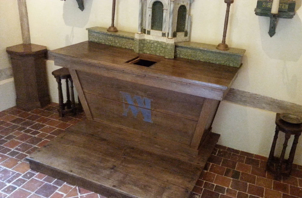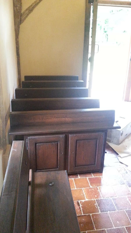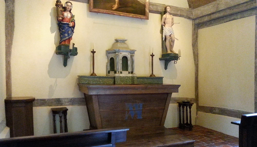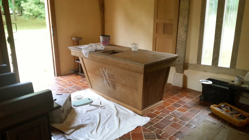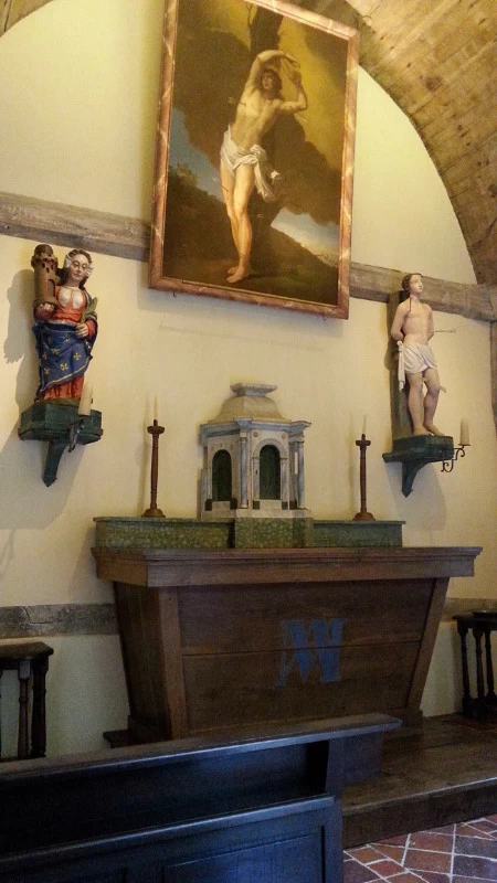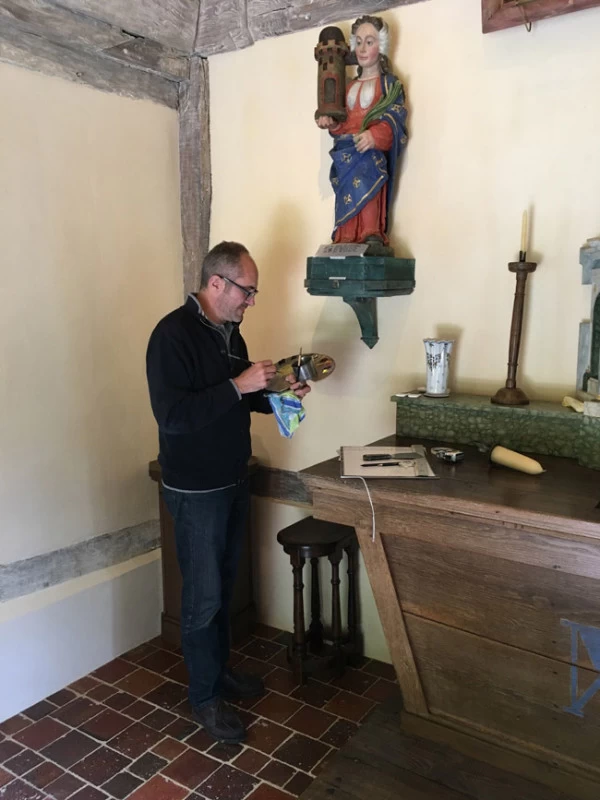 Au sein du Château Rabestan, une chapelle a été entièrement démontée pierre par pierre, poutre par poutre, tuile par tuile, rénovée puis remontée dans les règles de l’art, le tout sous le contrôle des bâtiments de France. Sur la fin de ce projet, ma participation s’est contentée de patines, de différents rattrapages et ajustages de teintes faux bois sur l’autel et la porte du confessionnal. Ont été créé les lettrages usés d’Avé Maria sur le flanc de l’autel et le nom de Ste Barbe sur une stèle de statue.