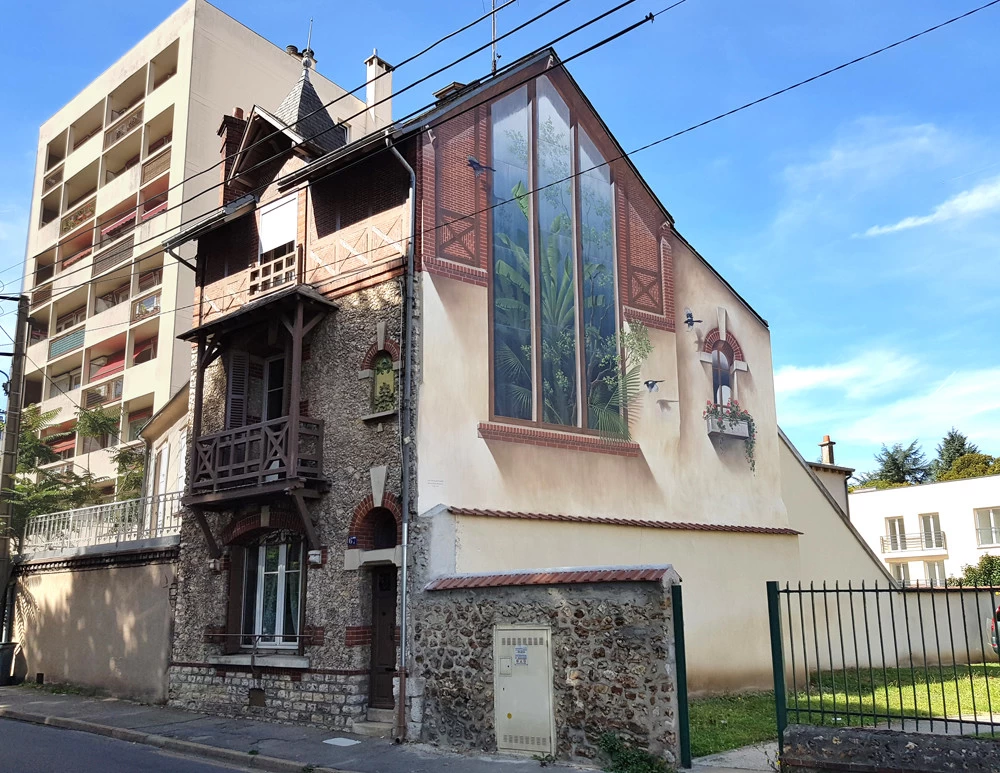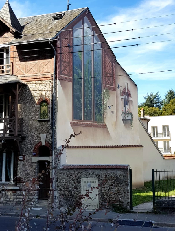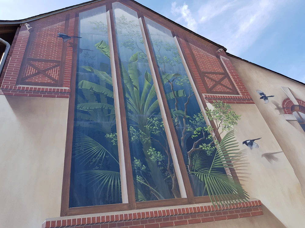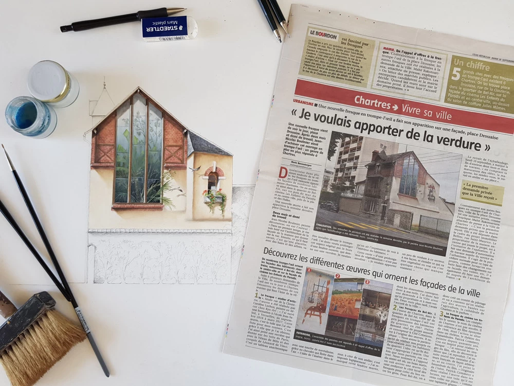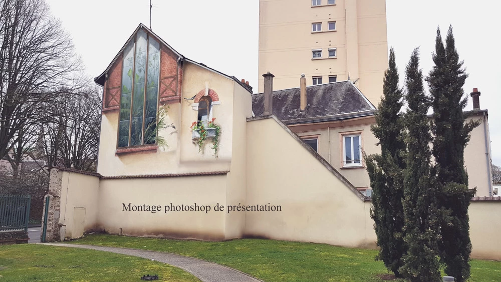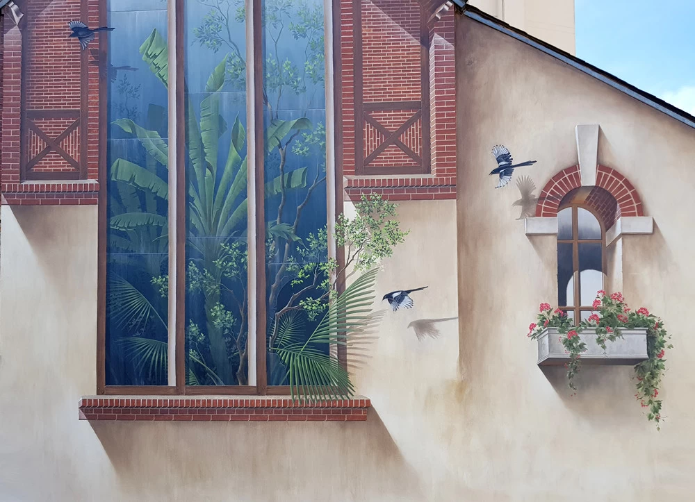 Voici une réalisation sur plus de 60 m² qui vient compléter la collection de trompe l’œil que compte la ville de Chartres. Poussé par l’architecte paysagiste Josseline Gaillard, l’idée d’une verrière avec de la végétation m’est apparue presque instantanément.