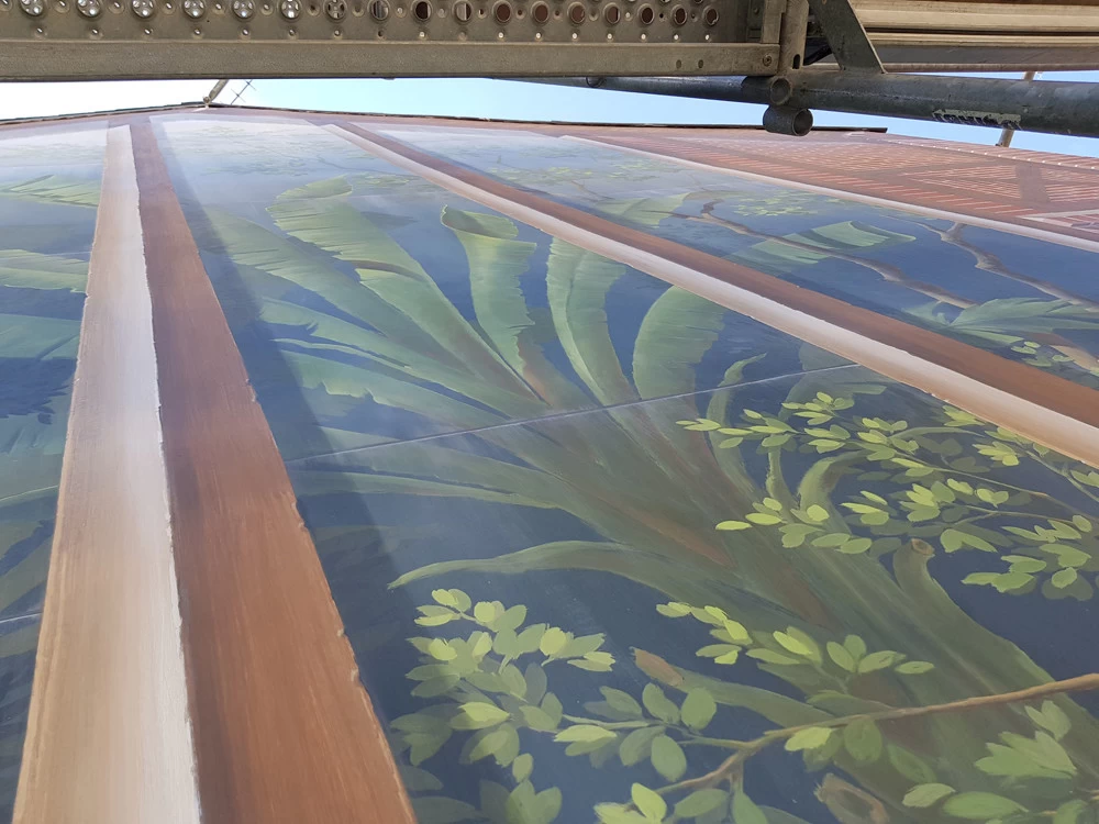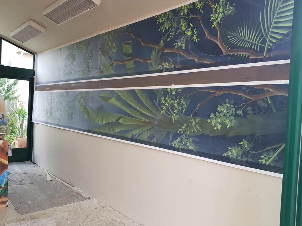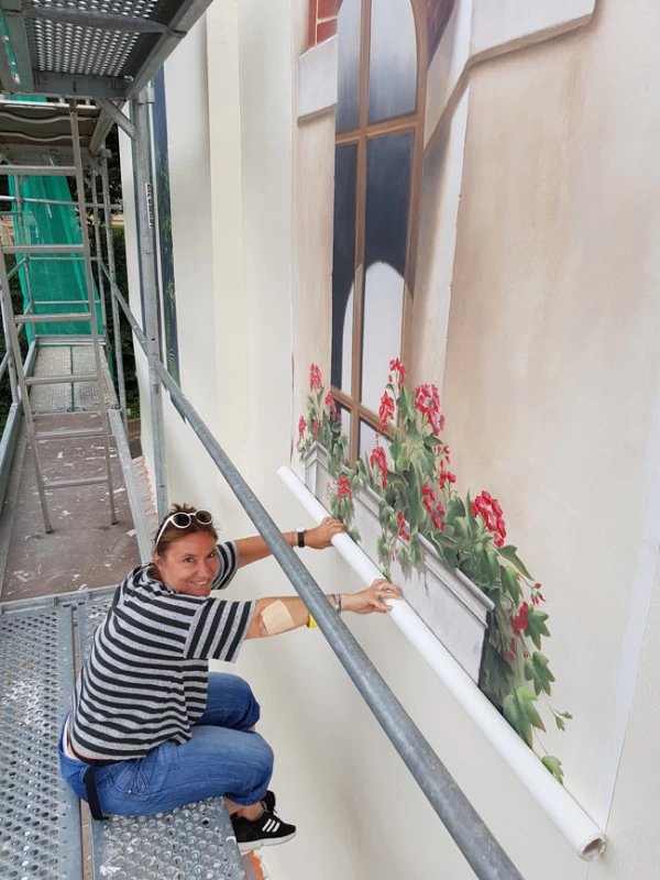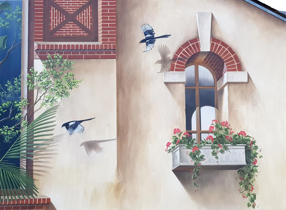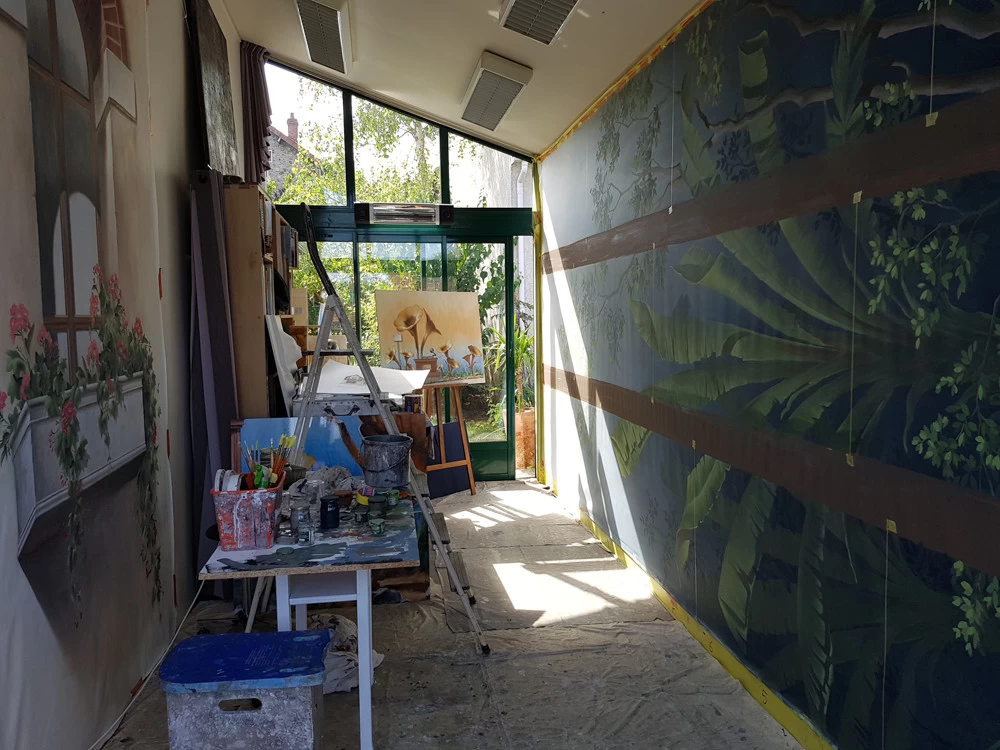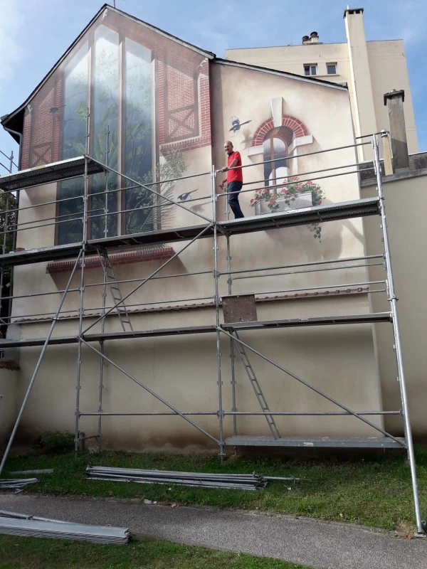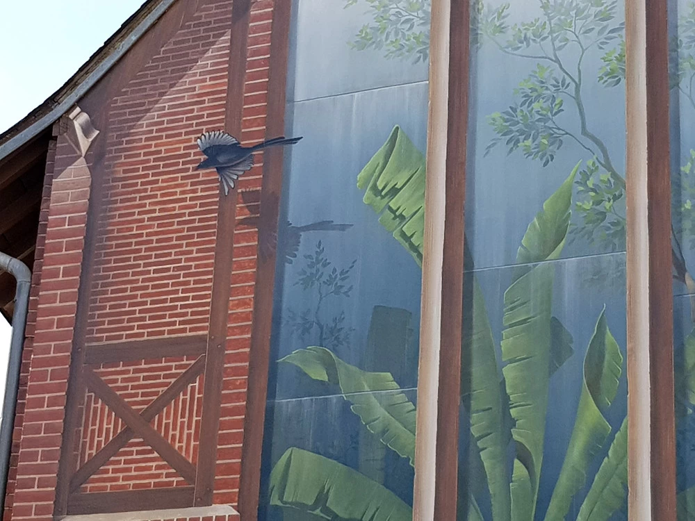 Voici une réalisation sur plus de 60 m² qui vient compléter la collection de trompe l’œil que compte la ville de Chartres. Poussé par l’architecte paysagiste Josseline Gaillard, l’idée d’une verrière avec de la végétation m’est apparue presque instantanément.