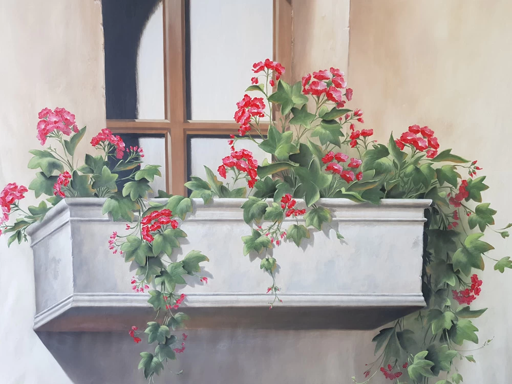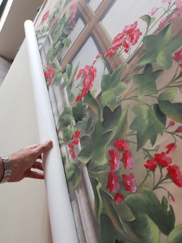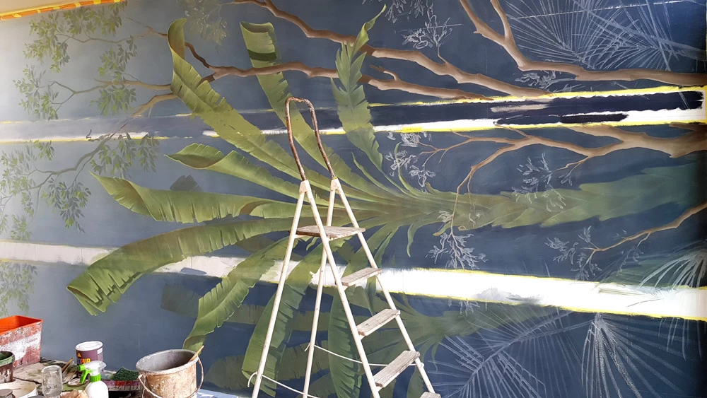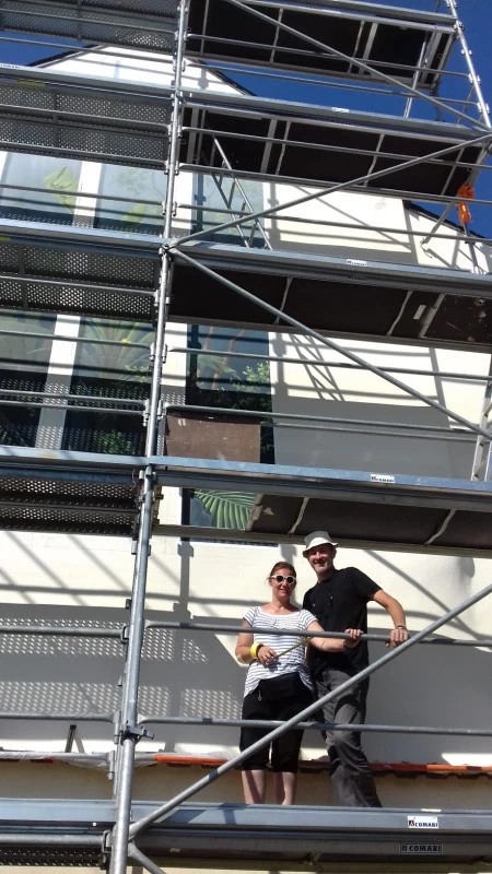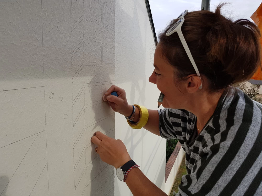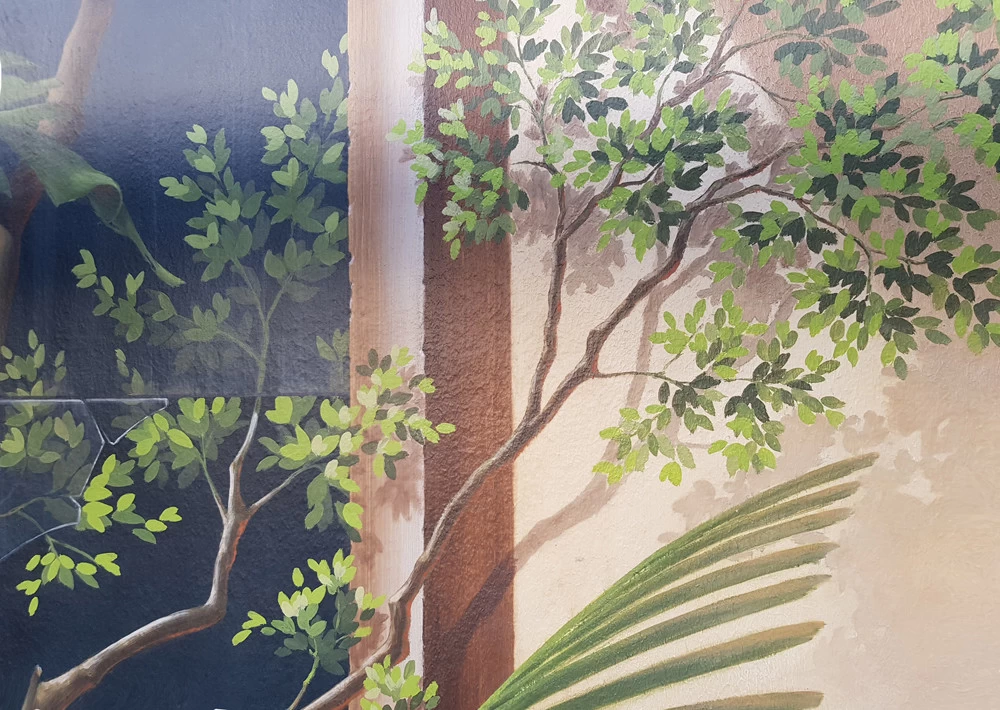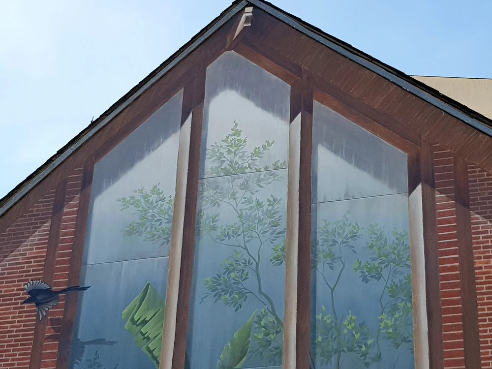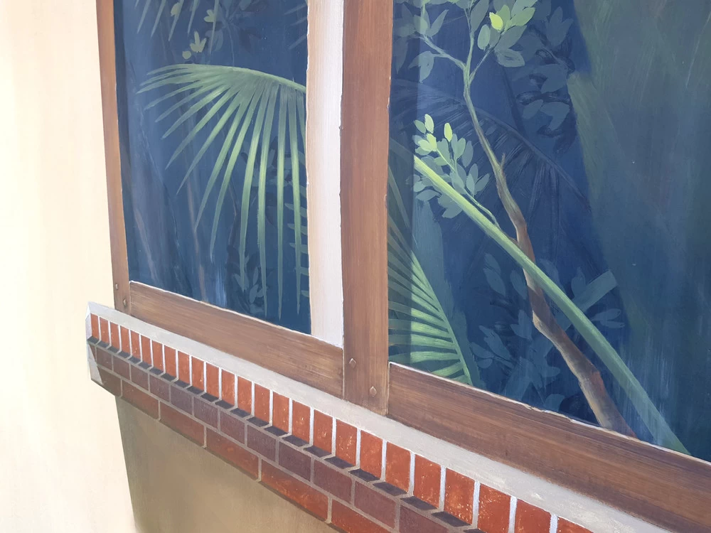 La verrière et la fenêtre furent réalisées sur toile en atelier puis marouflées sur site. L’idée était de se raccorder avec la maison faite de briques et de colombages pour se fondre de manière naturelle dans l’espace urbain. Des plantations sur tout le bas des murs viendront compléter l'aspect végétal du trompe l'oeil dans quelque temps.