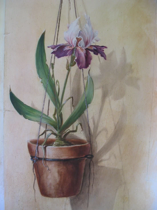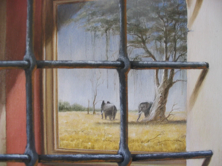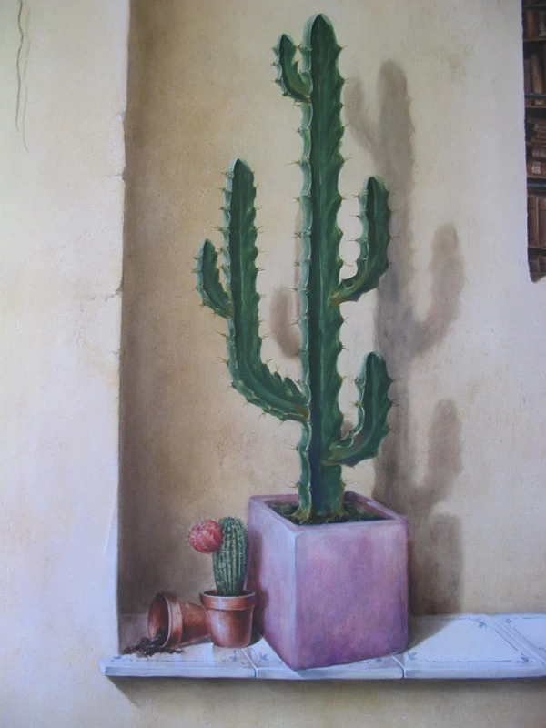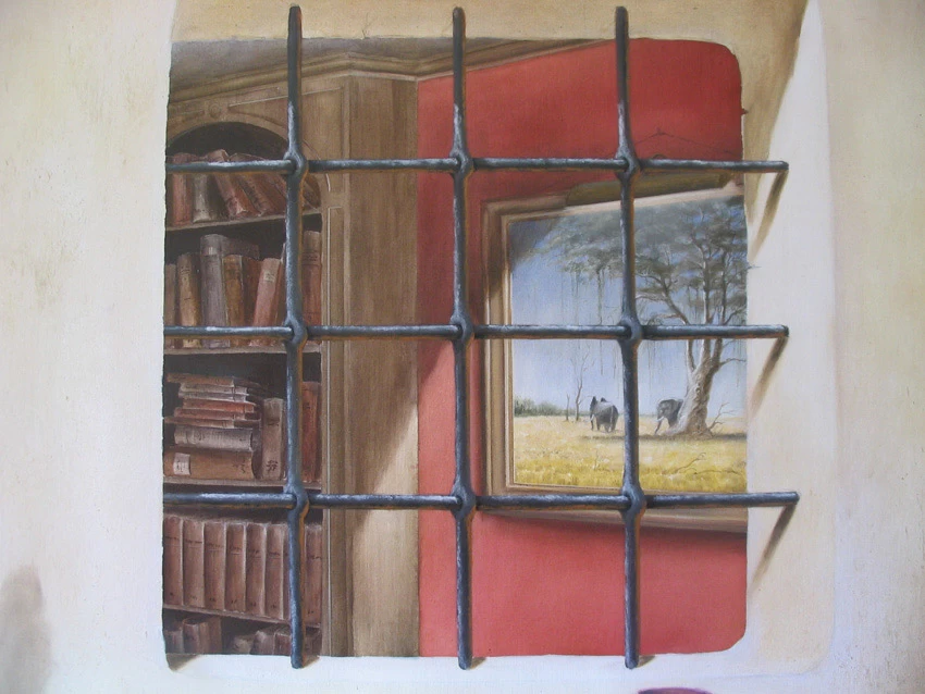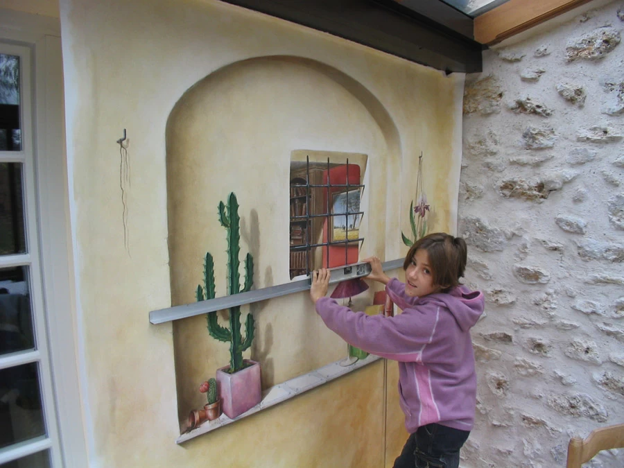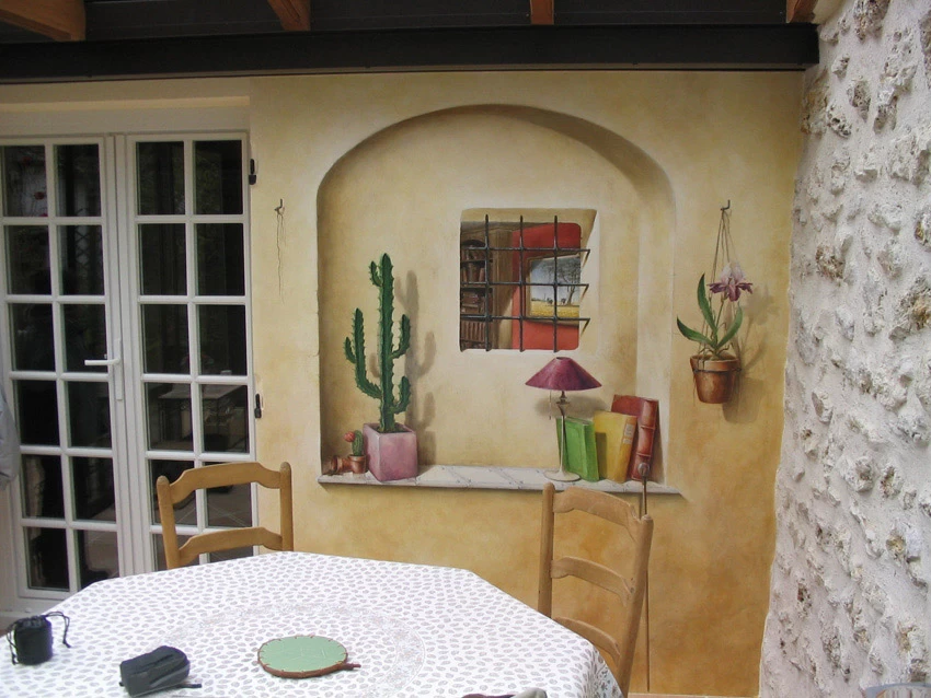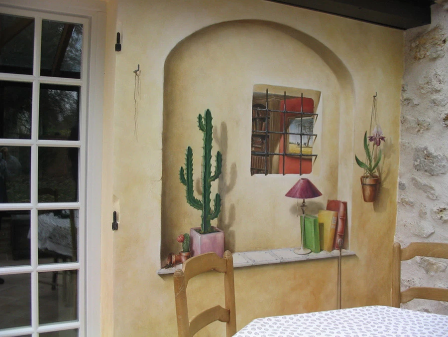 Réalisation sur toile d’un trompe l’œil représentant une niche voûtée avec sa margelle. Le but étant de donner l’illusion de voir l’intérieur de la maison grâce à la fenêtre à barreaux.