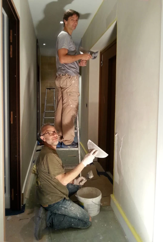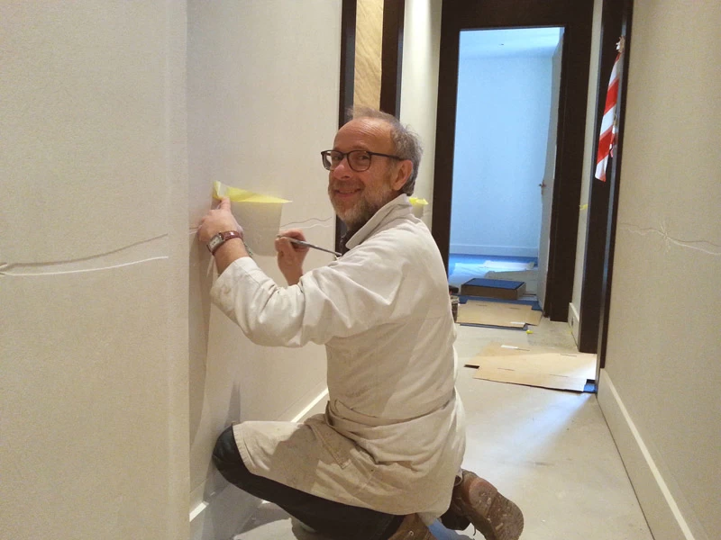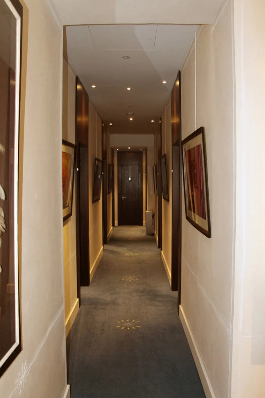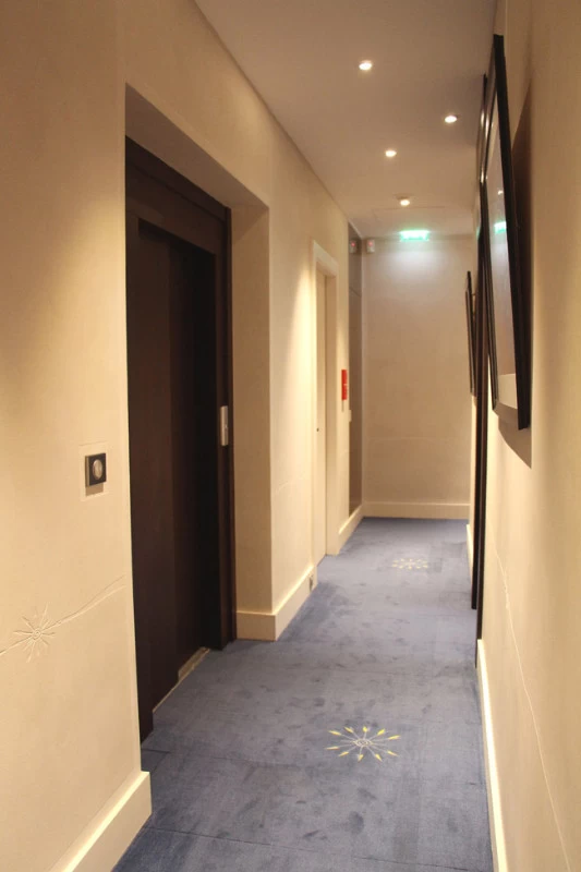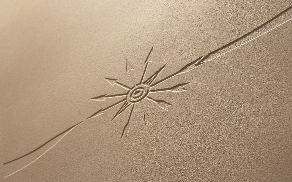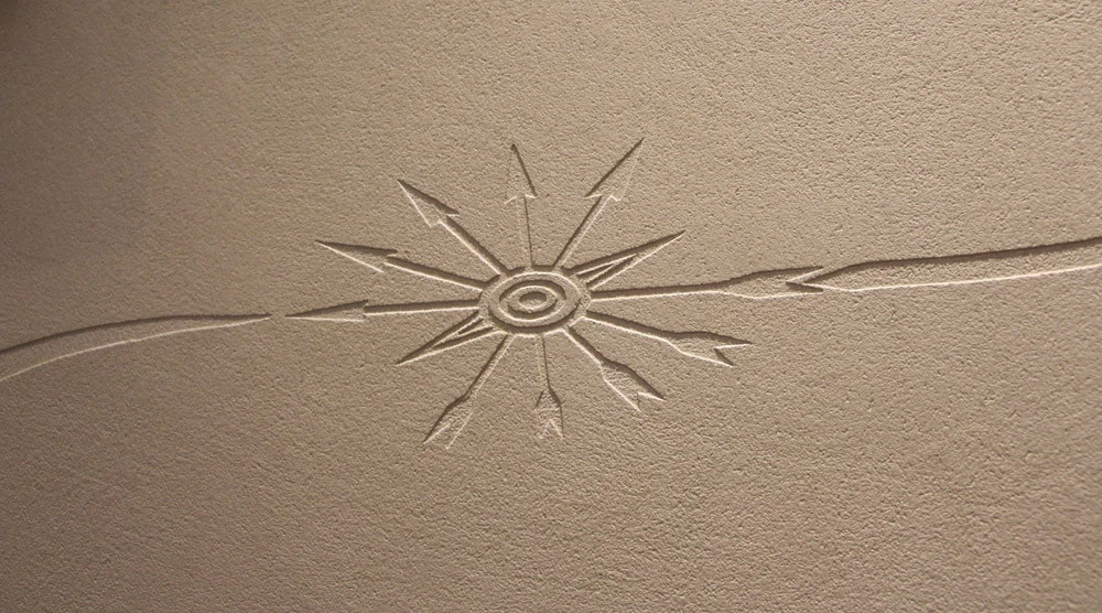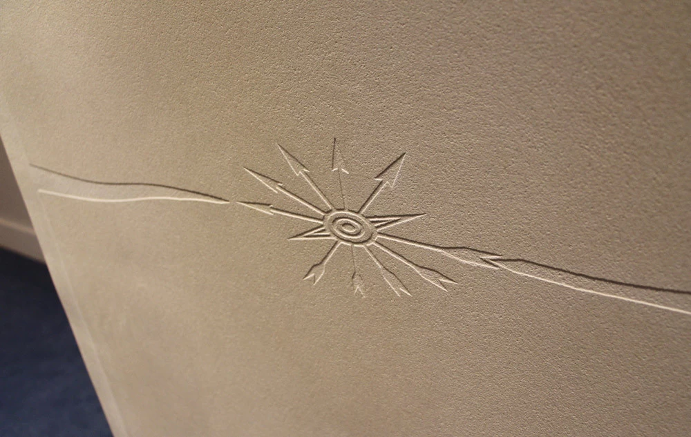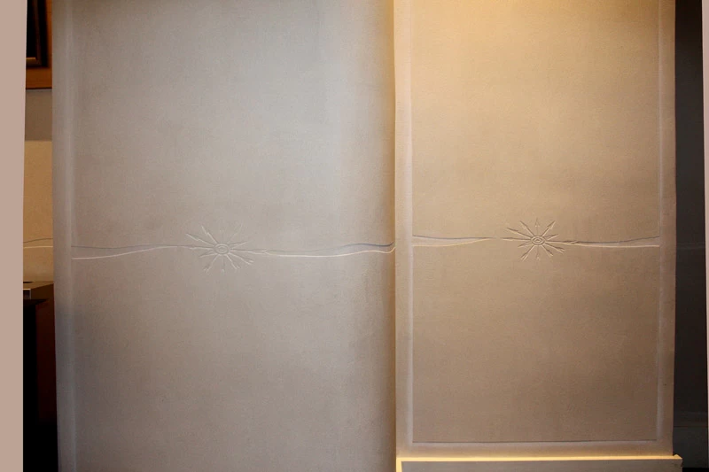 Pour les couloirs de cet établissement bancaire, il fallait trouver un revêtement solide et résistant aux chocs tout en étant le plus décoratif possible. L’idée d’un enduit sablé était appropriée pour sa résistance et sa longévité. Vu l’épaisseur de sable, un motif en creux façon « sgraffito » pouvait facilement y être placé afin de personnaliser et rendre identifiable cet établissement financier.