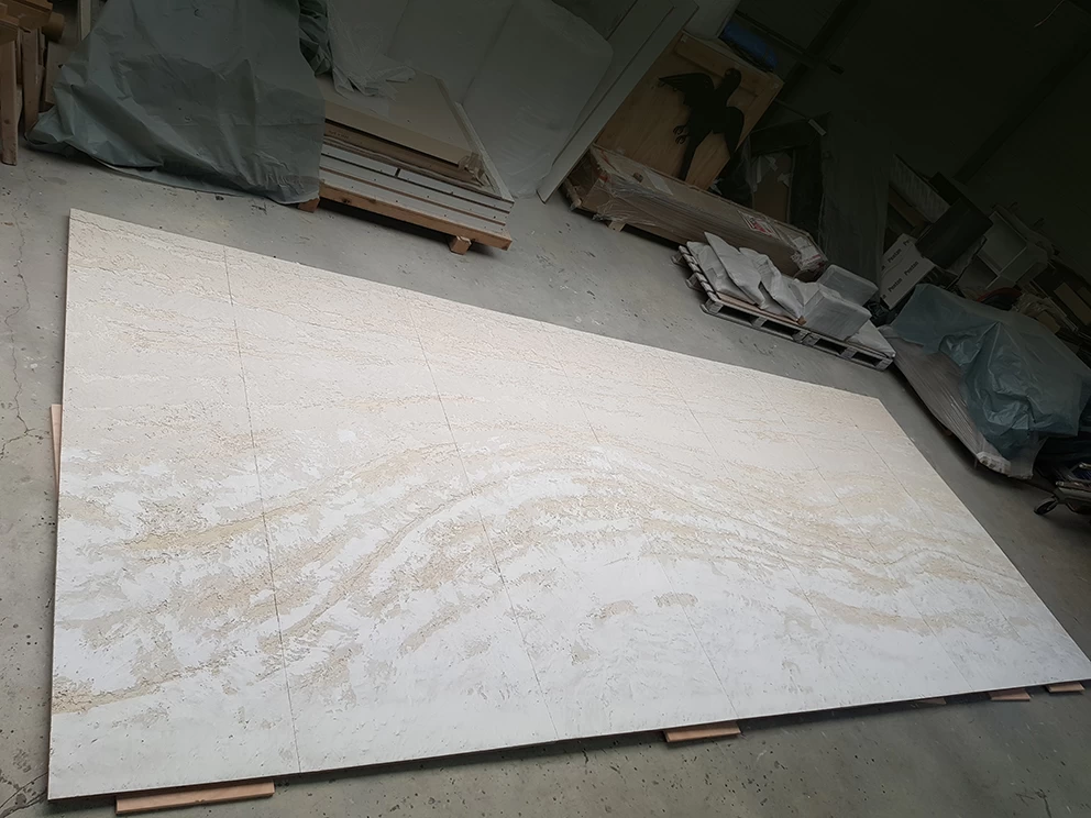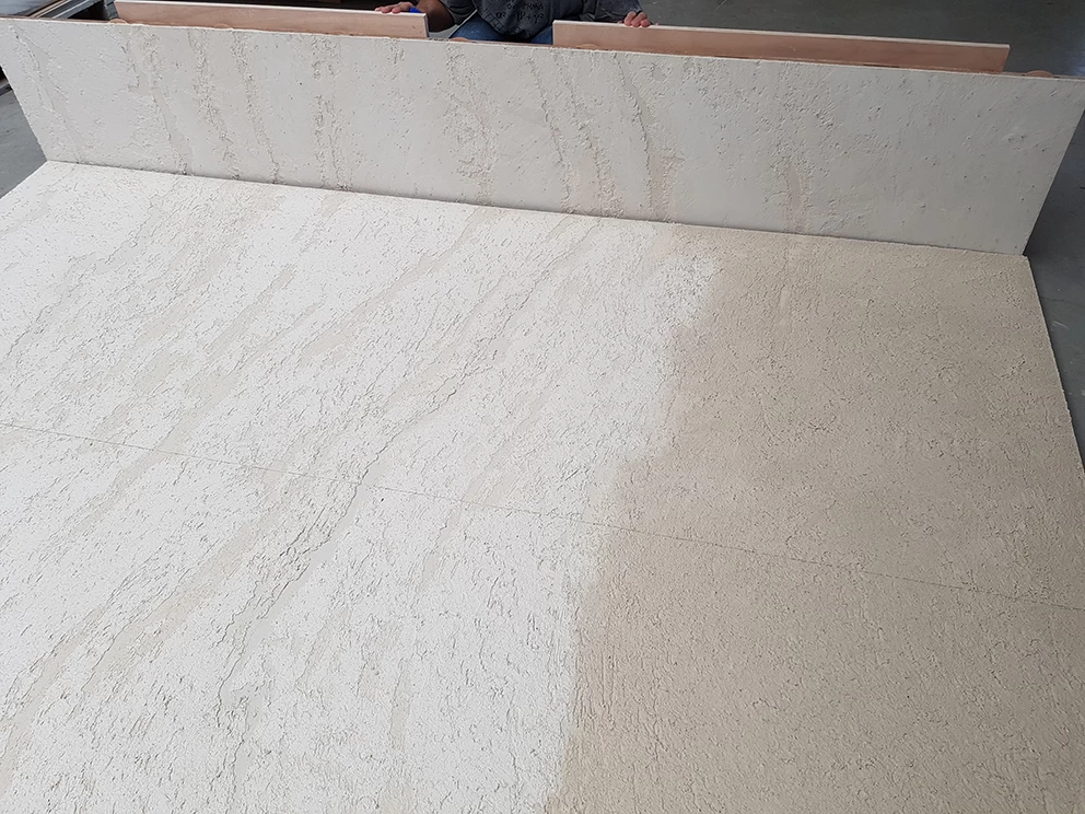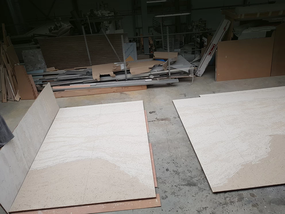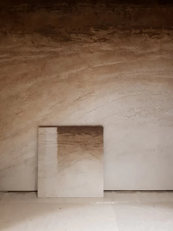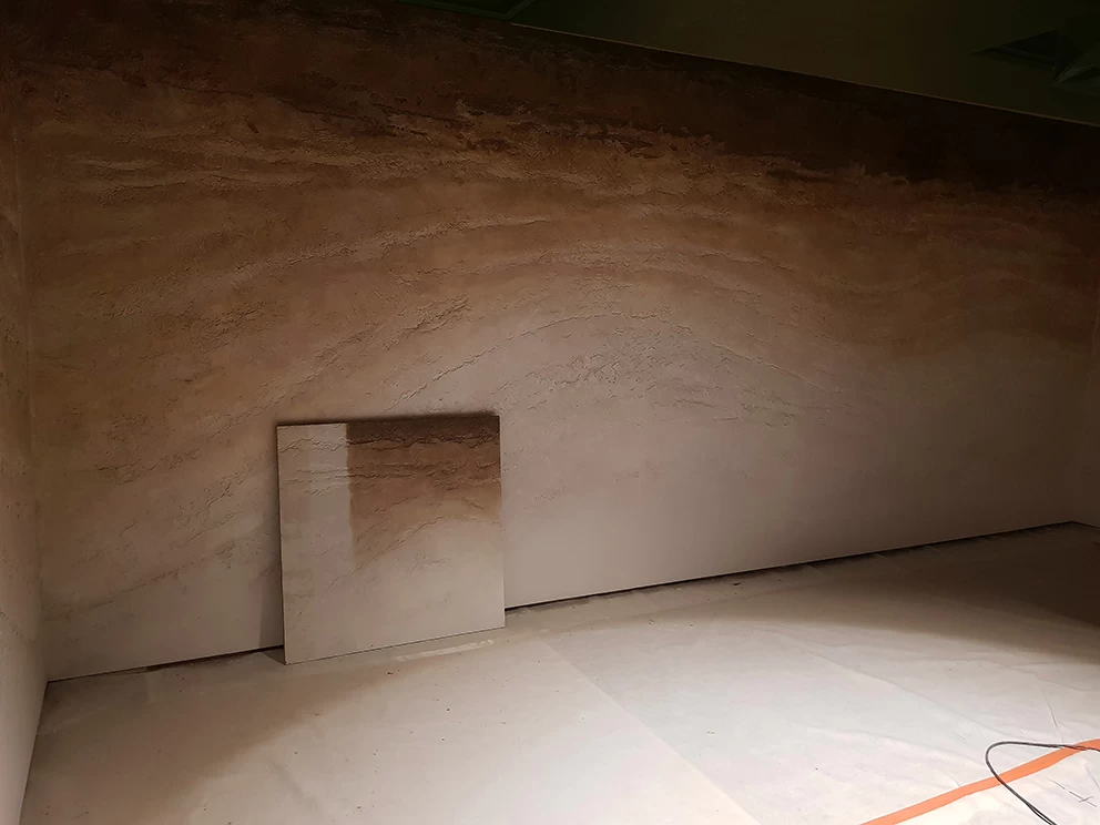 Pour l’agenceur scénographe Séquoia, voici la réalisation de fausses strates géologiques. L’idée était de donner l’impression d’une excavation de terrain, d’être sous les pieds de vigne avec le haut couleur terre et une profondeur de sol de plus en plus crayeuse, donc blanche. Cela correspond aux sols de la région, d’où l’implantation des vignes pour faire du champagne. Par la suite d’énormes racines en résine venant des plafonds et des projections murales ont été installées pour parfaire l’illusion d’être sous terre. Le musée du Champagne à AY a ouvert ses portes en 2021.