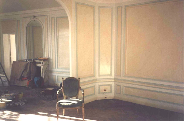 Réalisation d’une patine brossée marbrée dans l’intérieur des panneaux, puis un rehaut vert bleuté sur tous les entourages.