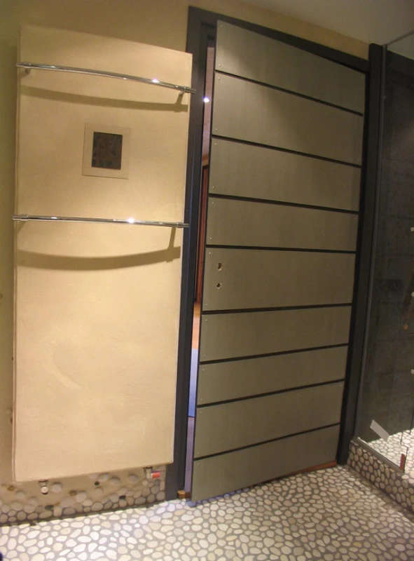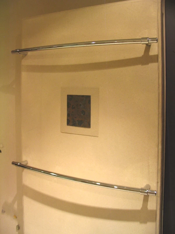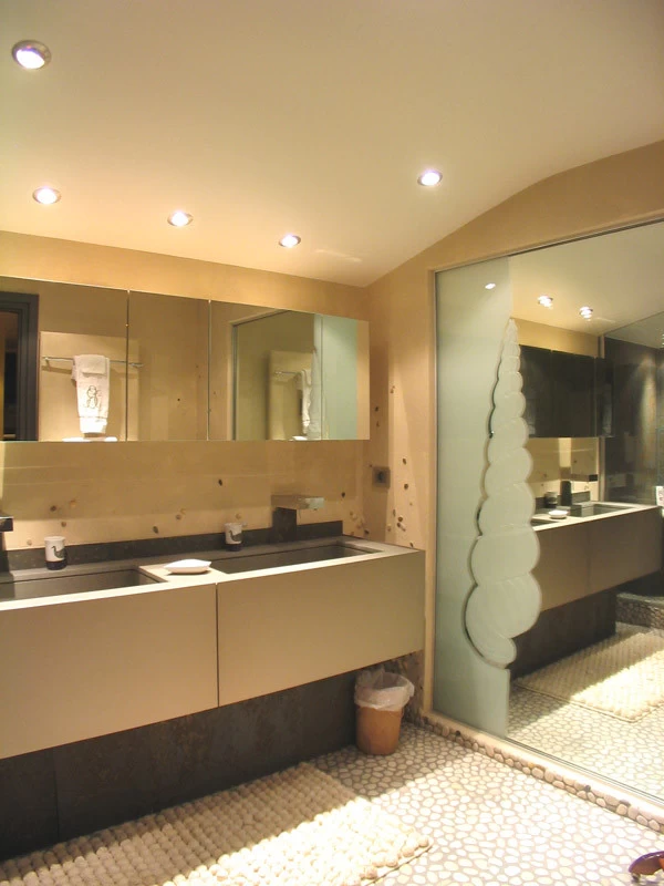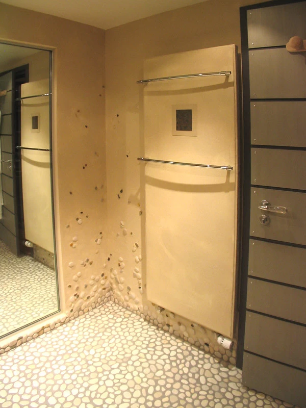 Salle de bain, avec une densité de galets qui s’intensifie vers le bas jusqu’à rejoindre le sol posé par les carreleurs. Du vrai sable a été collé entre les galets sur l’ensemble des murs y compris le radiateur. Un morceau d’ardoise ferrugem (de la cabine de douche) à été fixée au centre du radiateur. Le coquillage sur le miroir a été dessiné par mes soins.